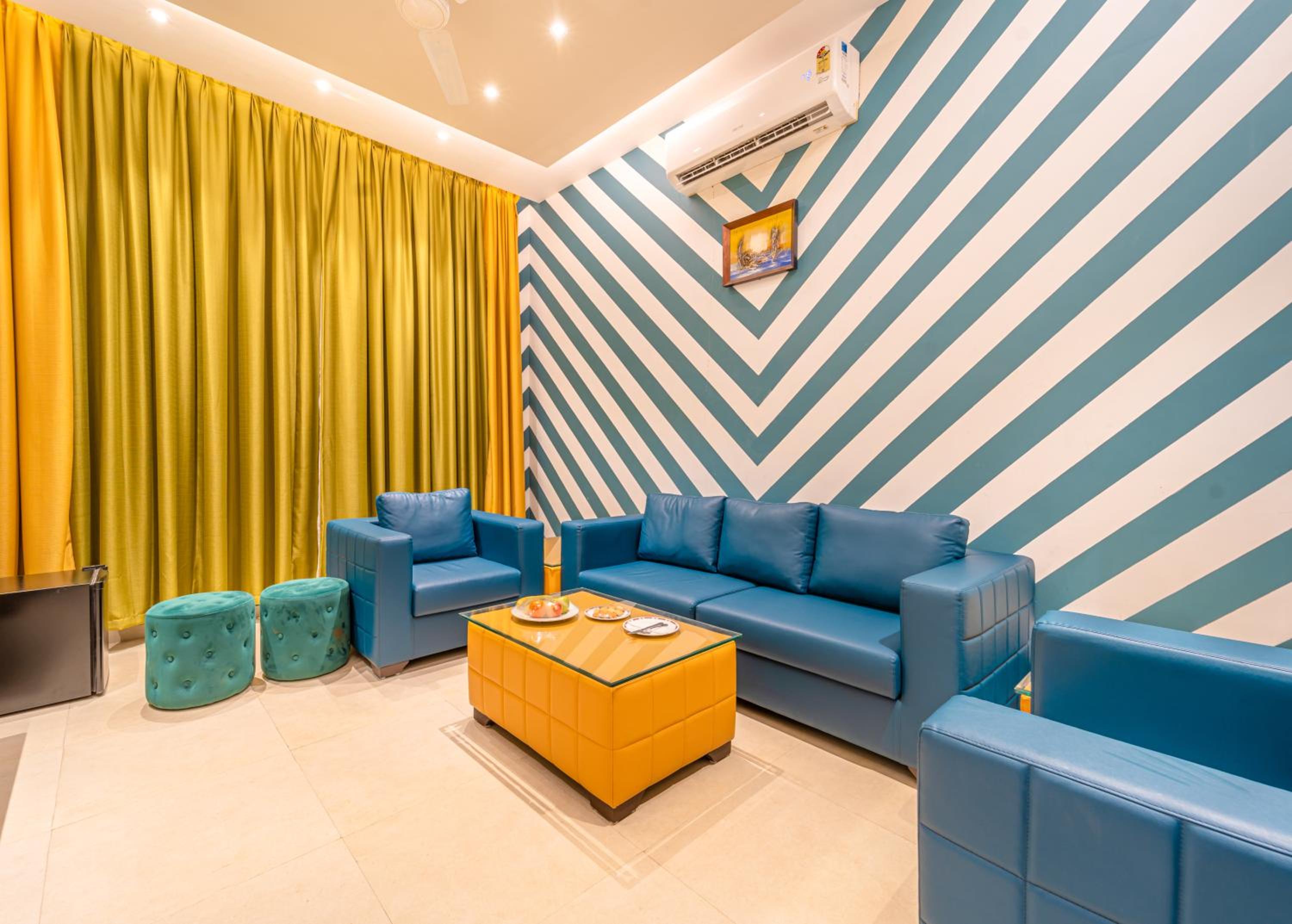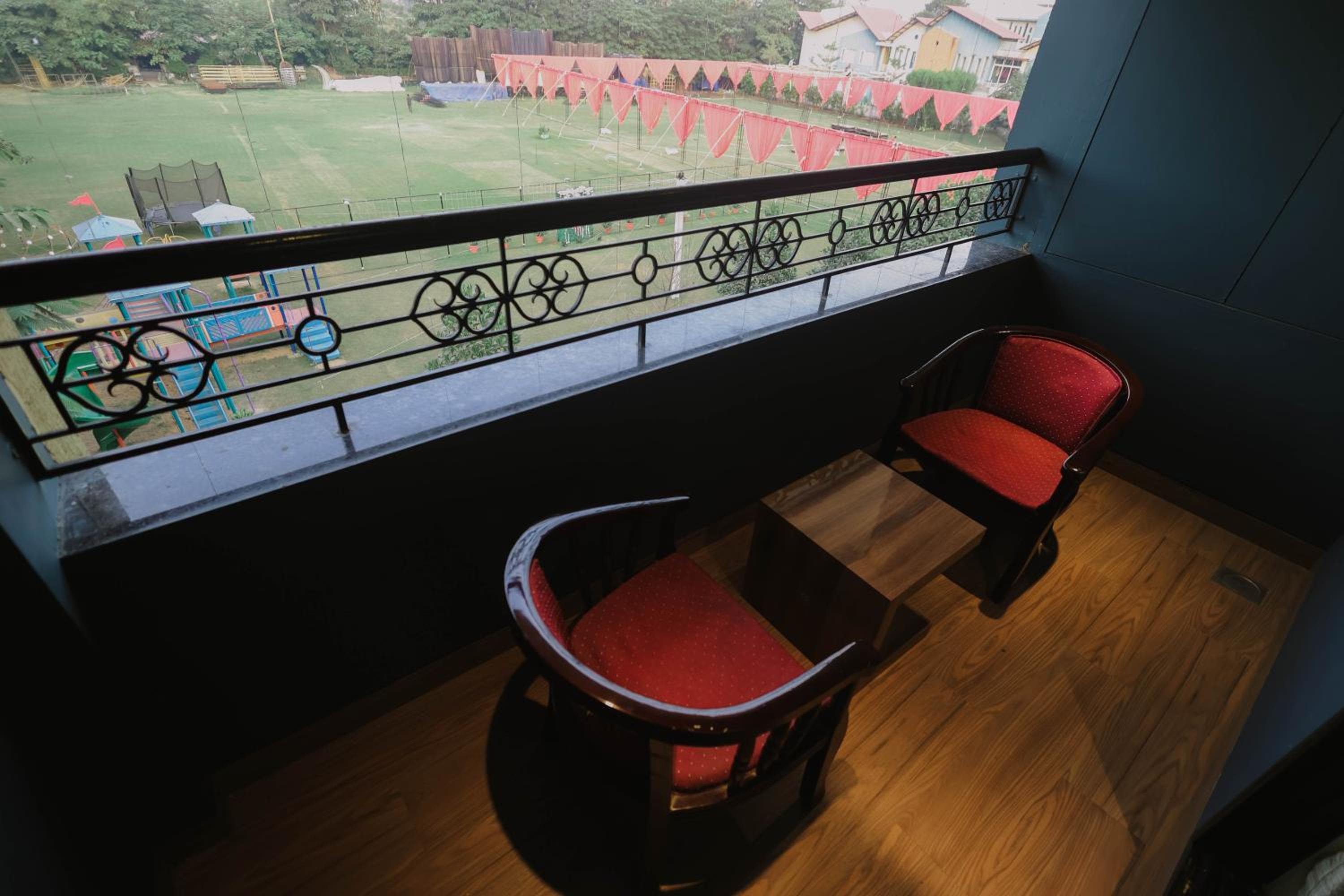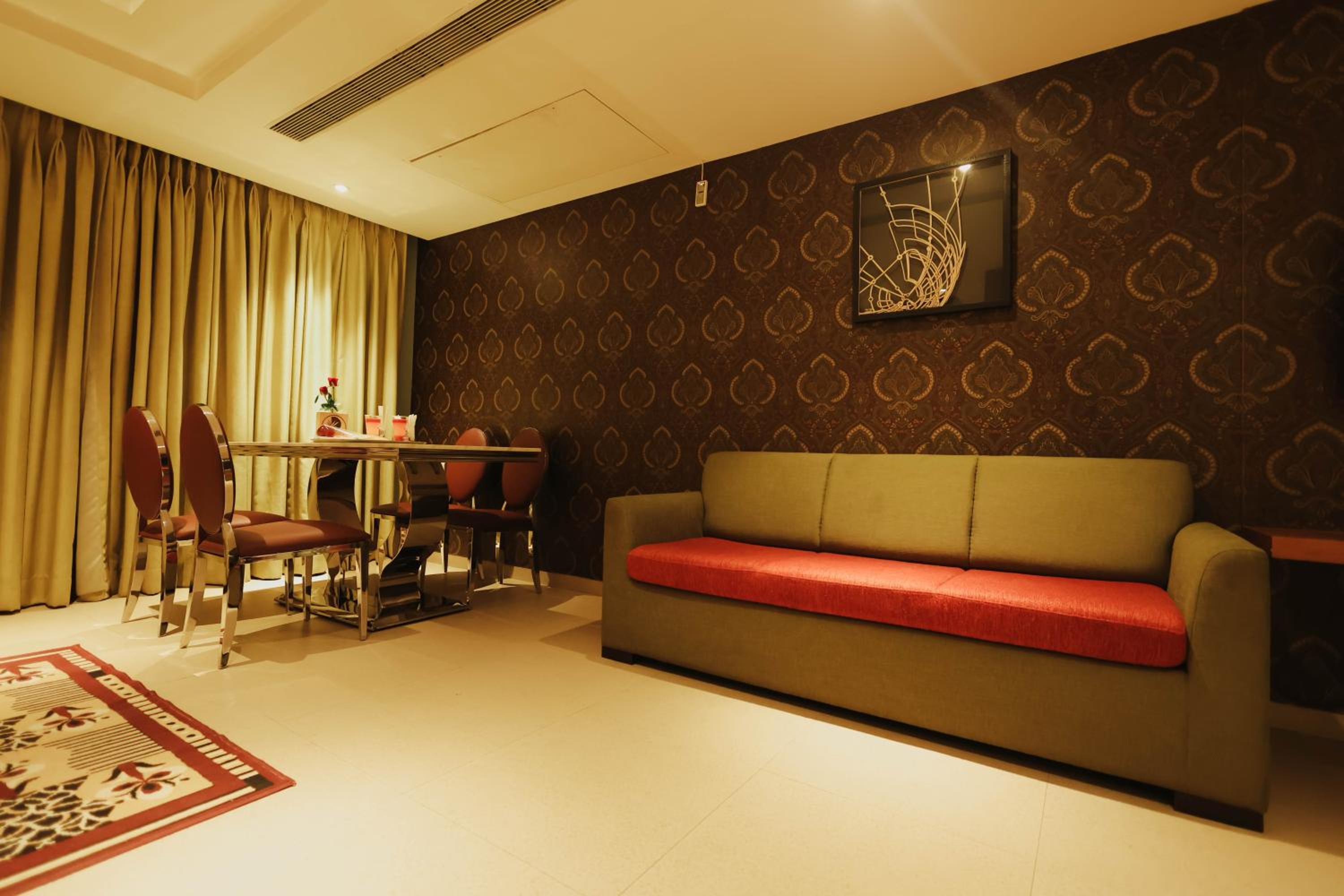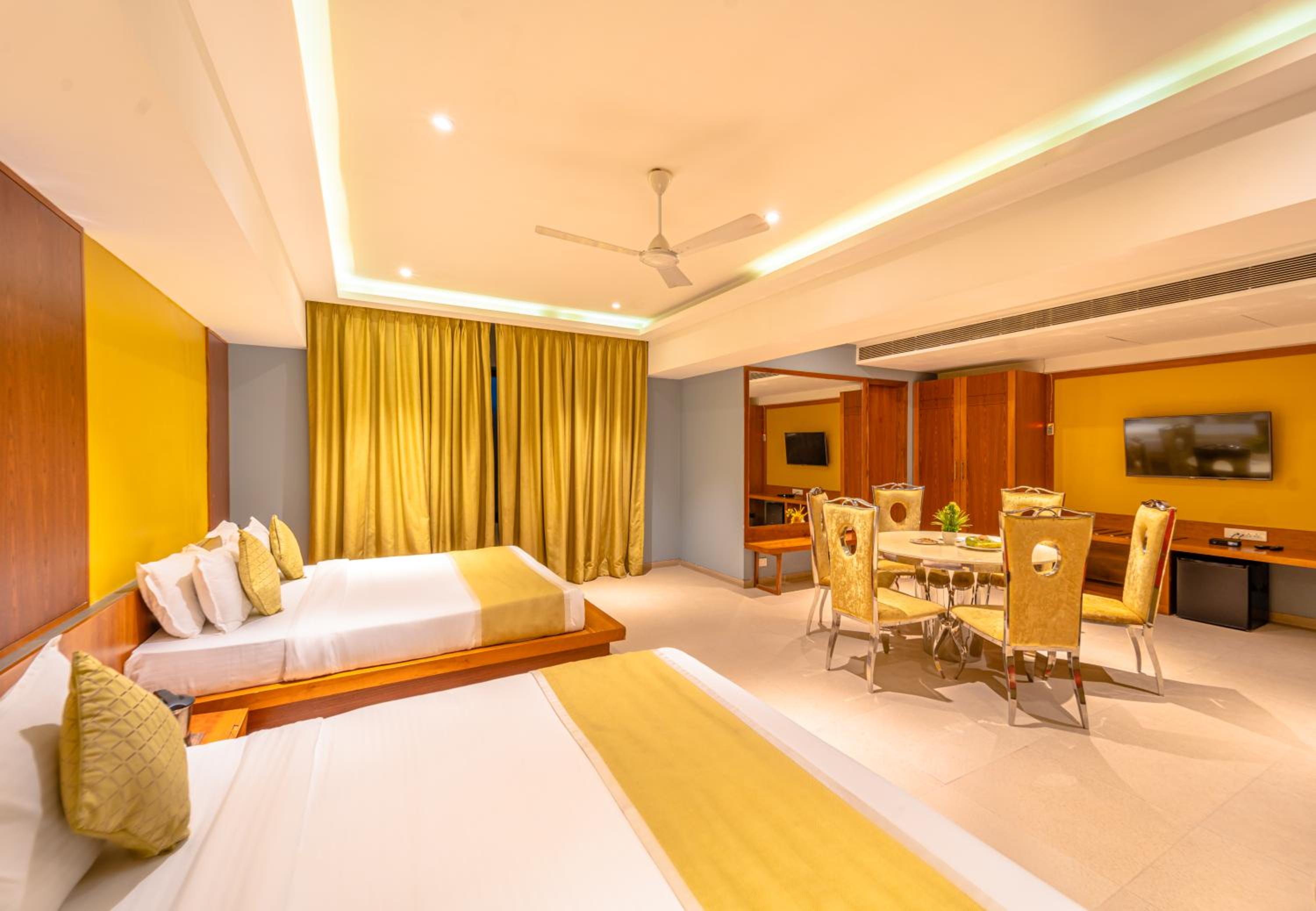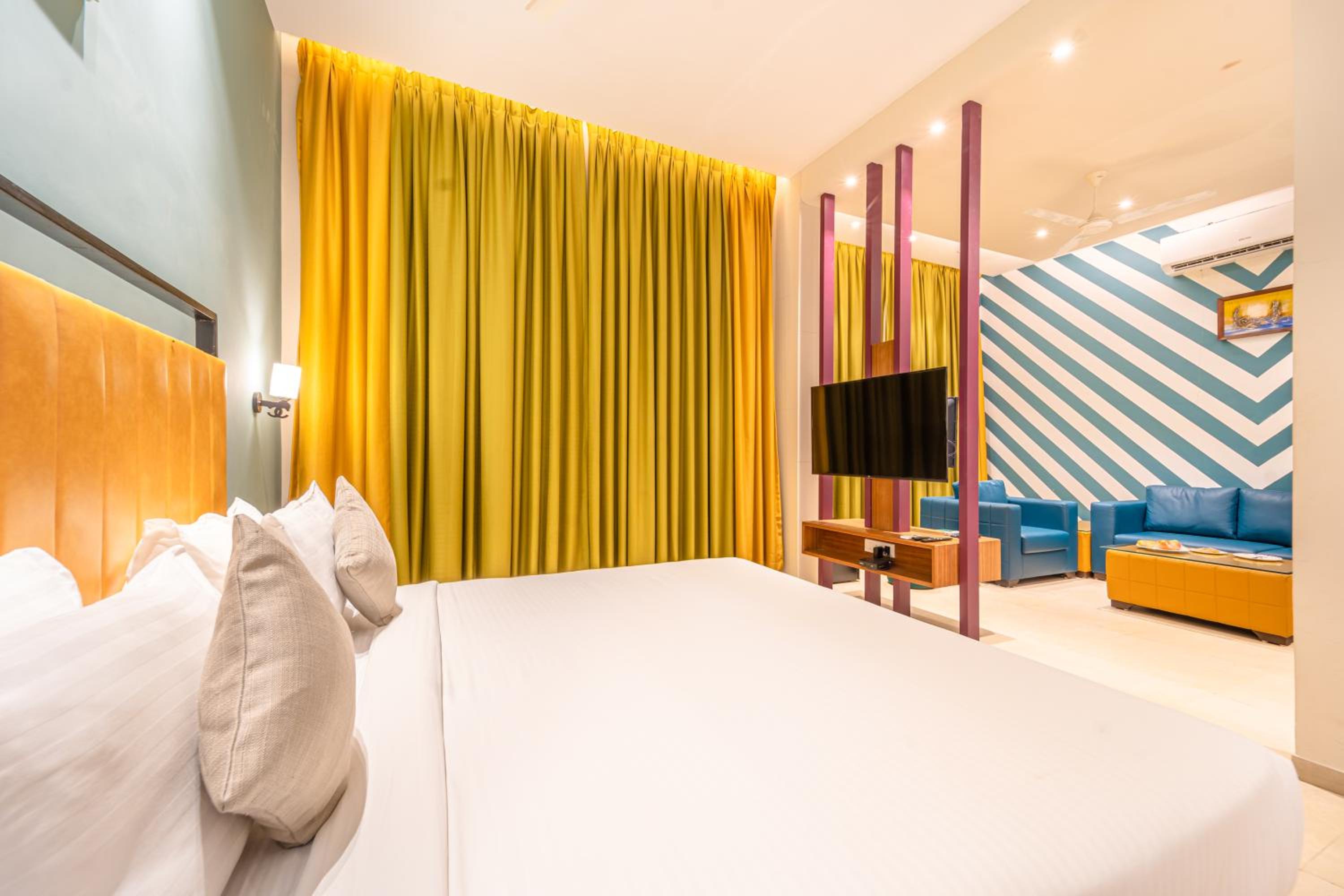 Luxurious Accommodation: Hotel Shamrock Greens in Raipur offers a comfortable stay with well-equipped rooms featuring flat-screen TVs and cozy seating areas.