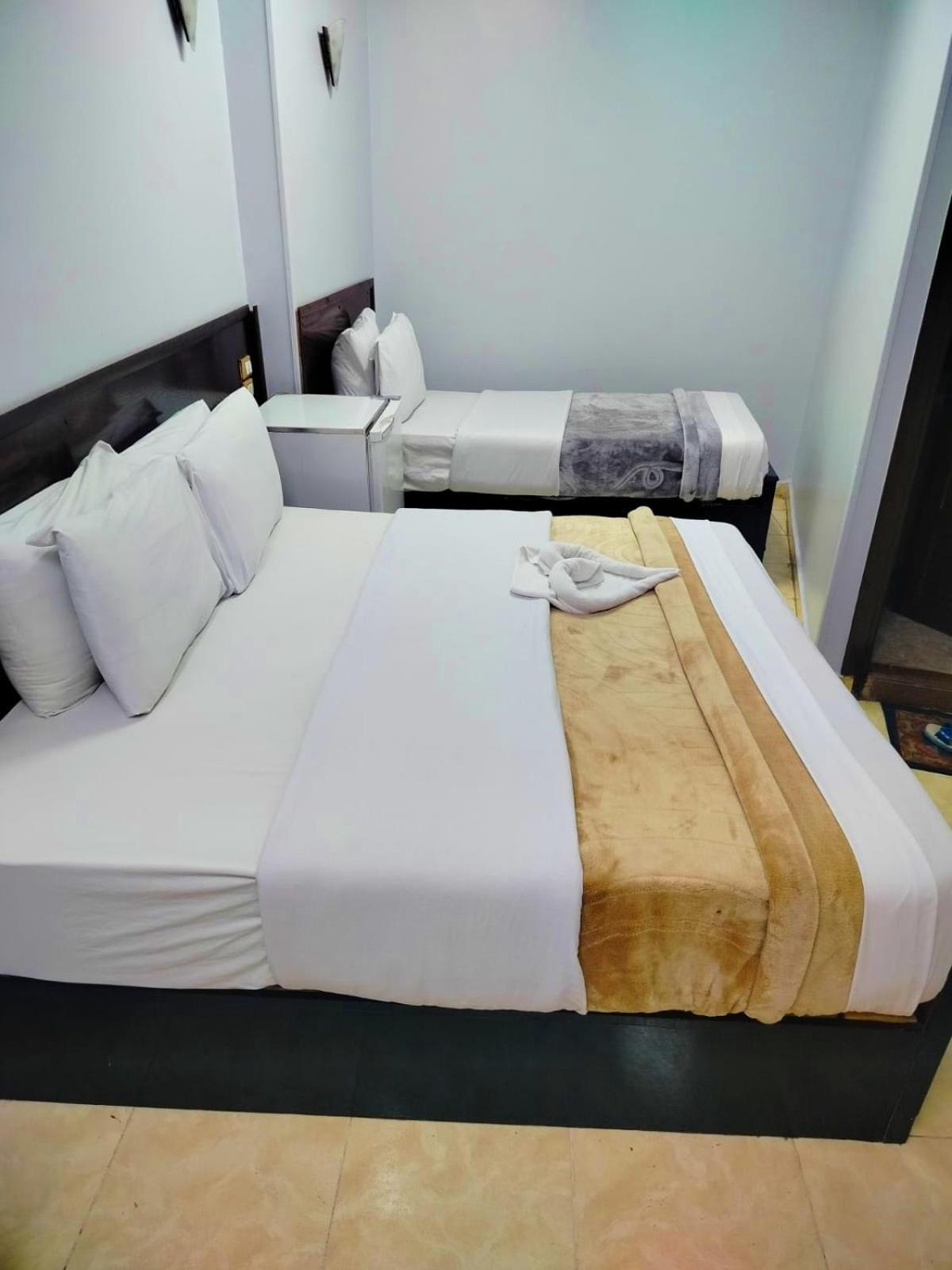 La réception de trouve au 5eme étage et la chambre assez spacieuse au 9eme avec vue sur le Nil. Le petit déjeuner est très bon avec aubergines et haricots. Le prix de la chambre est bon marché