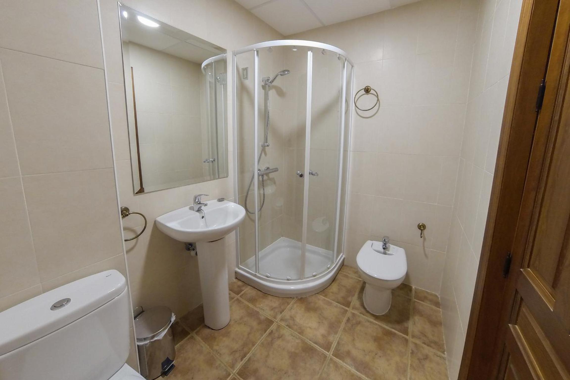 De todas maneras llegamos a ver la habitación, era bastante pequeña y solo tenía mesa de noche de un solo lado, además El baño estaba todo mojado y con moho en el plato de ducha.