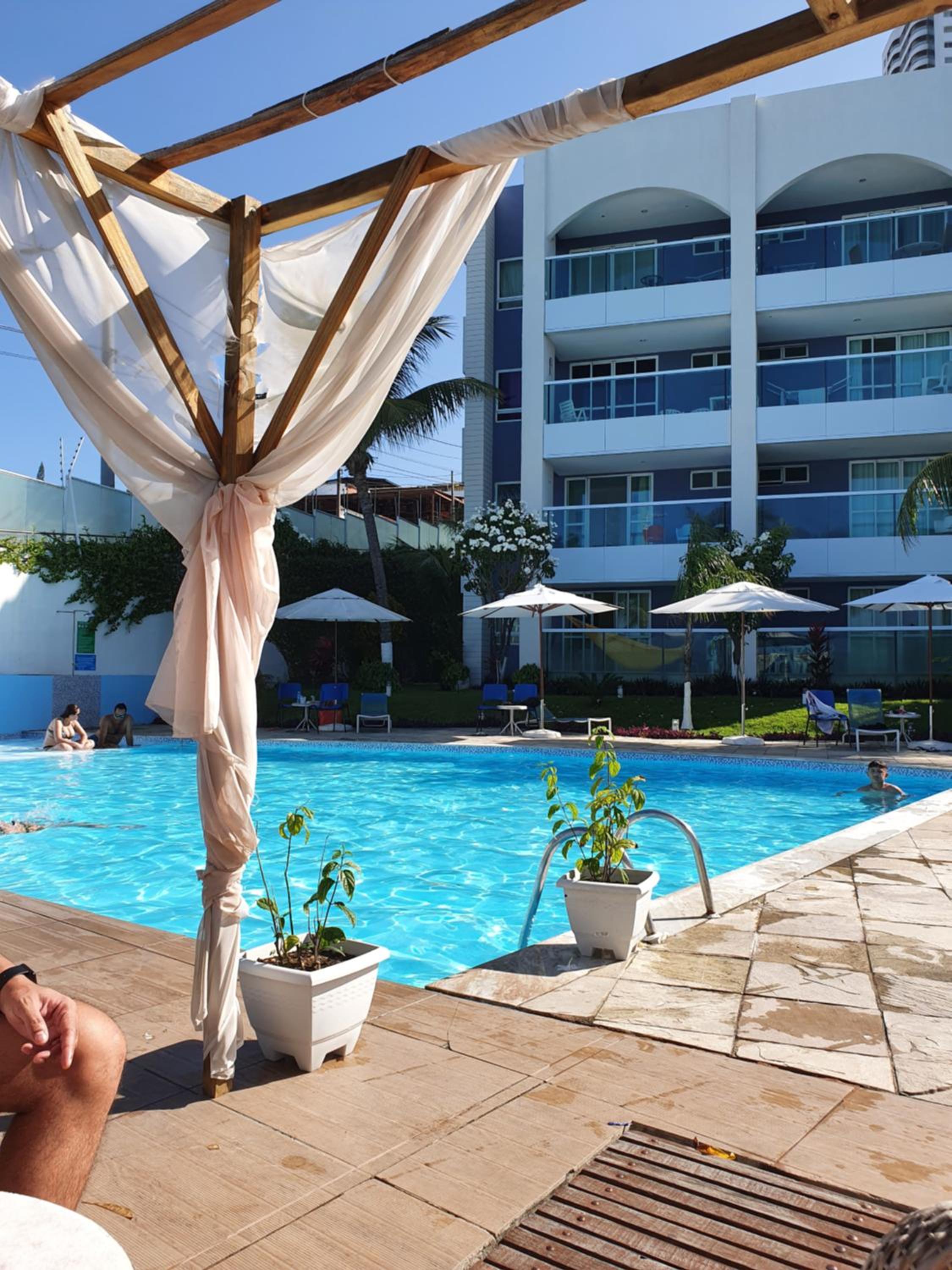 Hotel pé na areia com piscina e bar. Foi super prático curtirmos praia e piscina