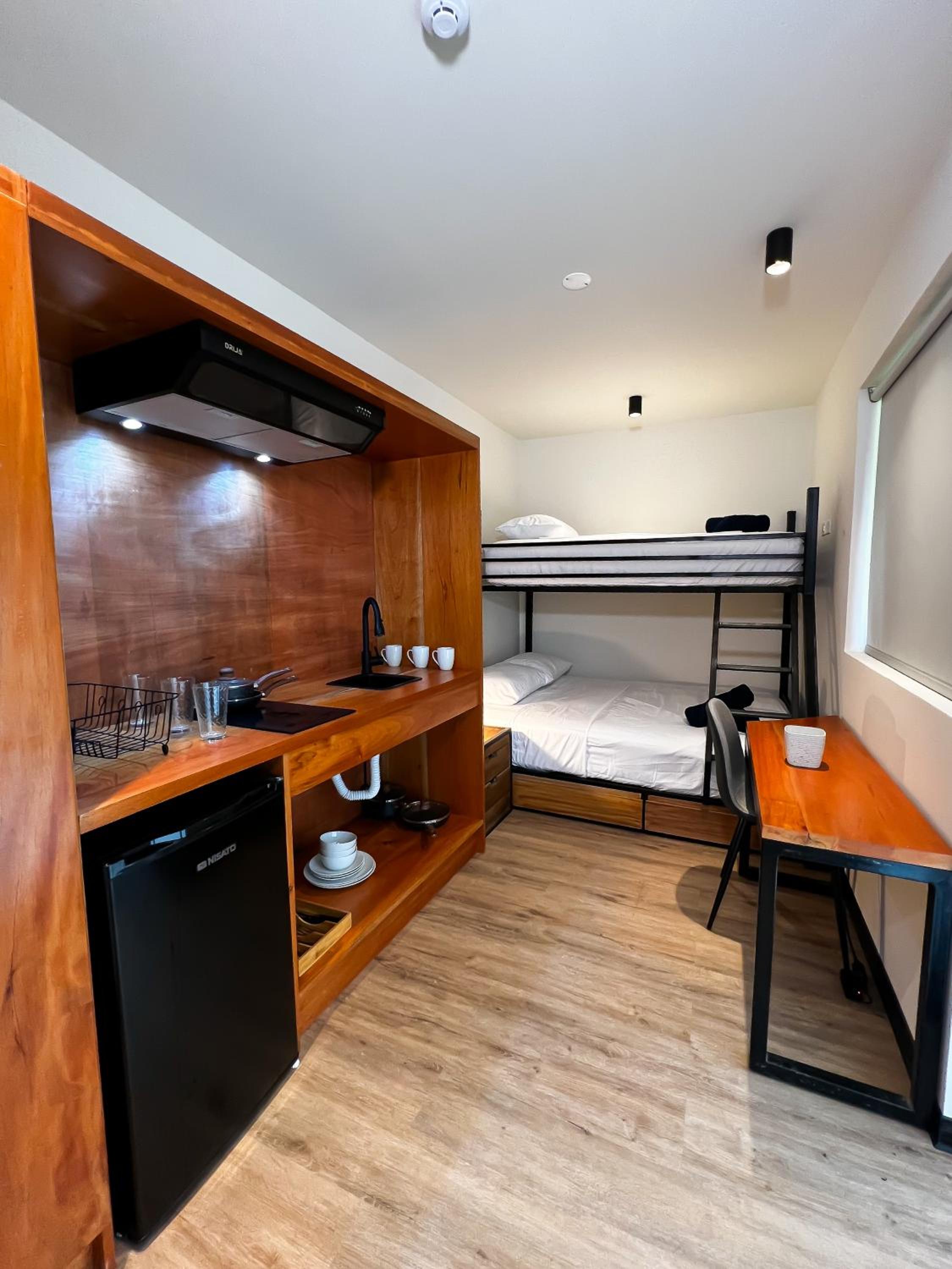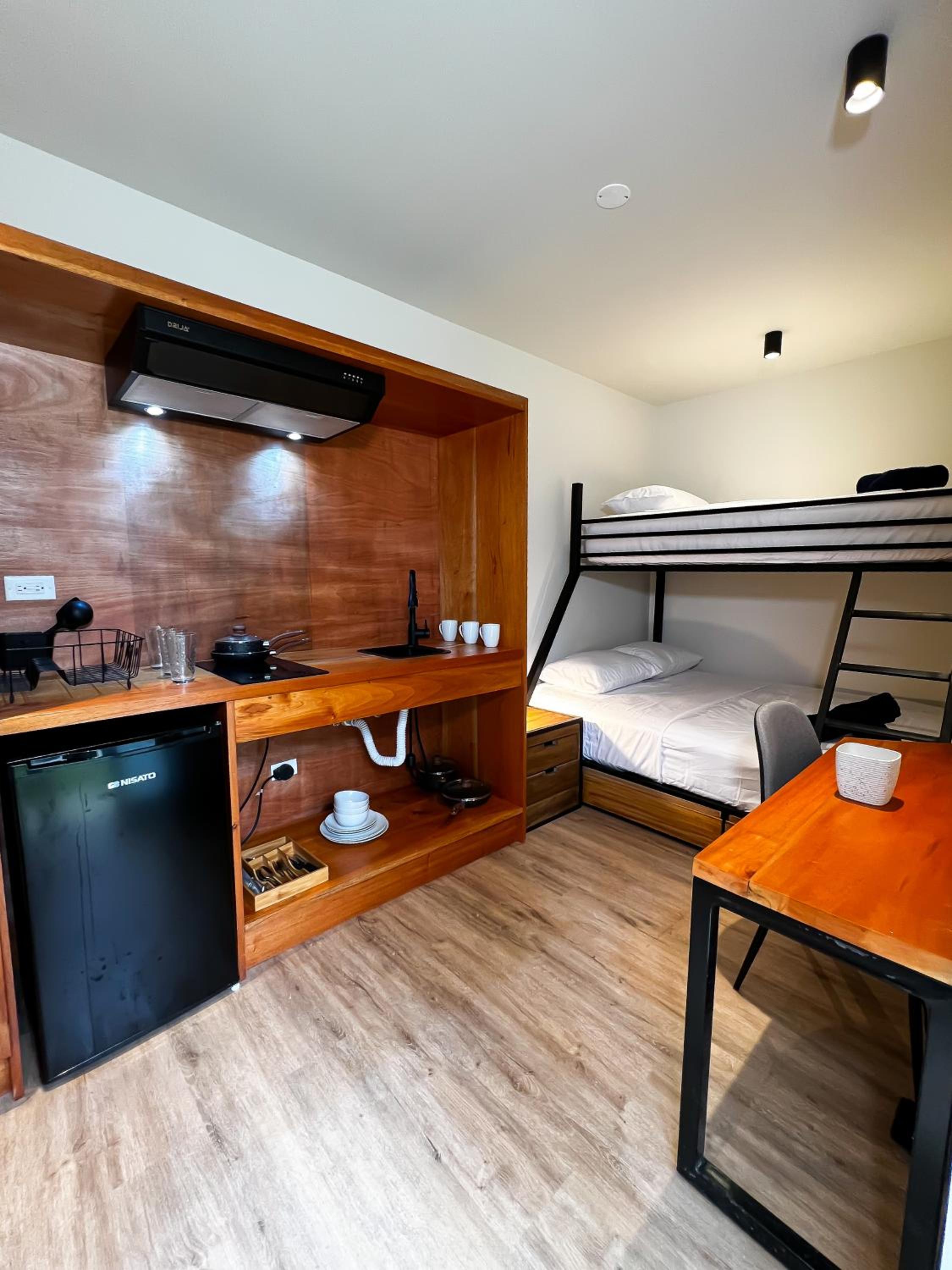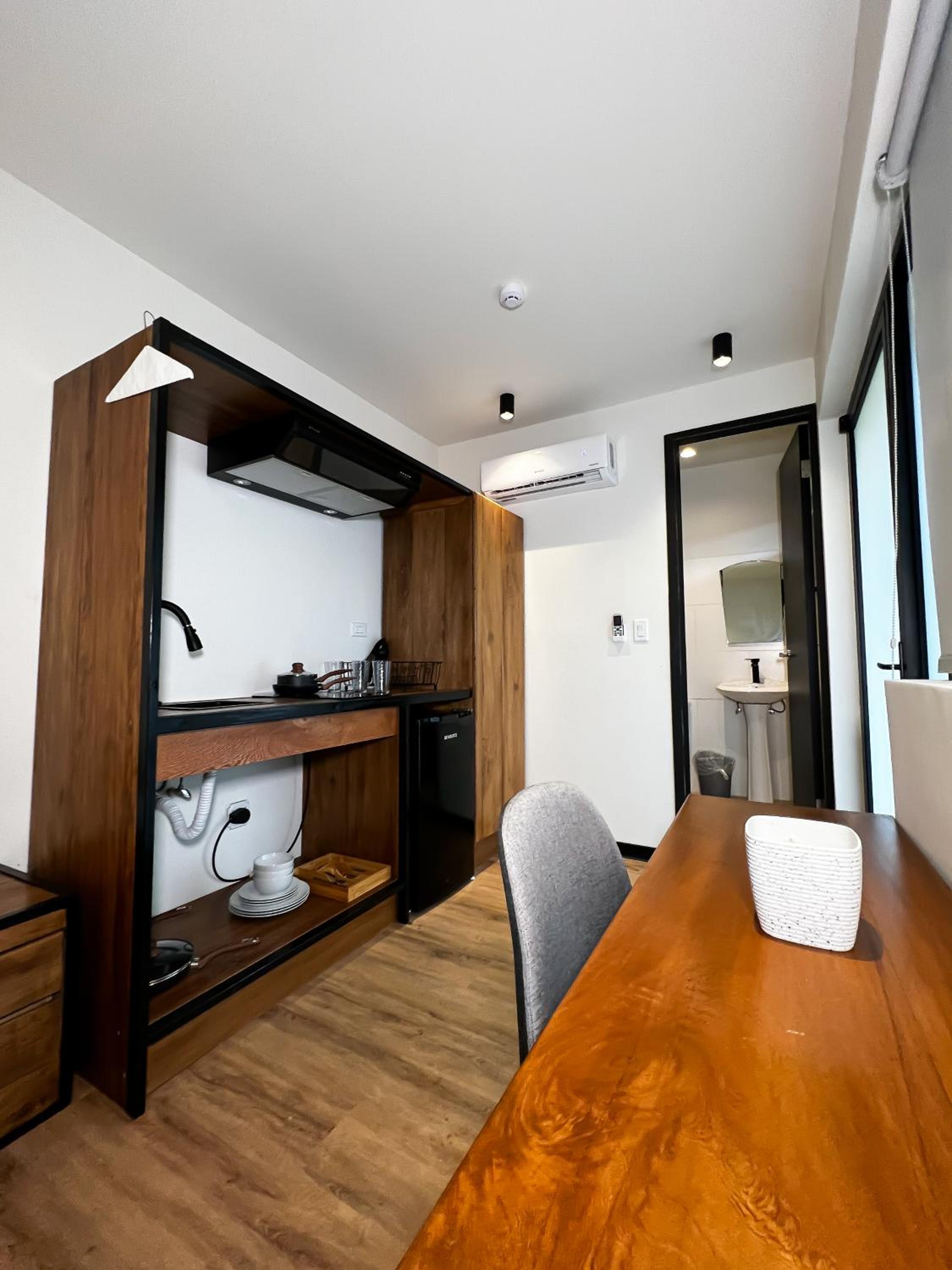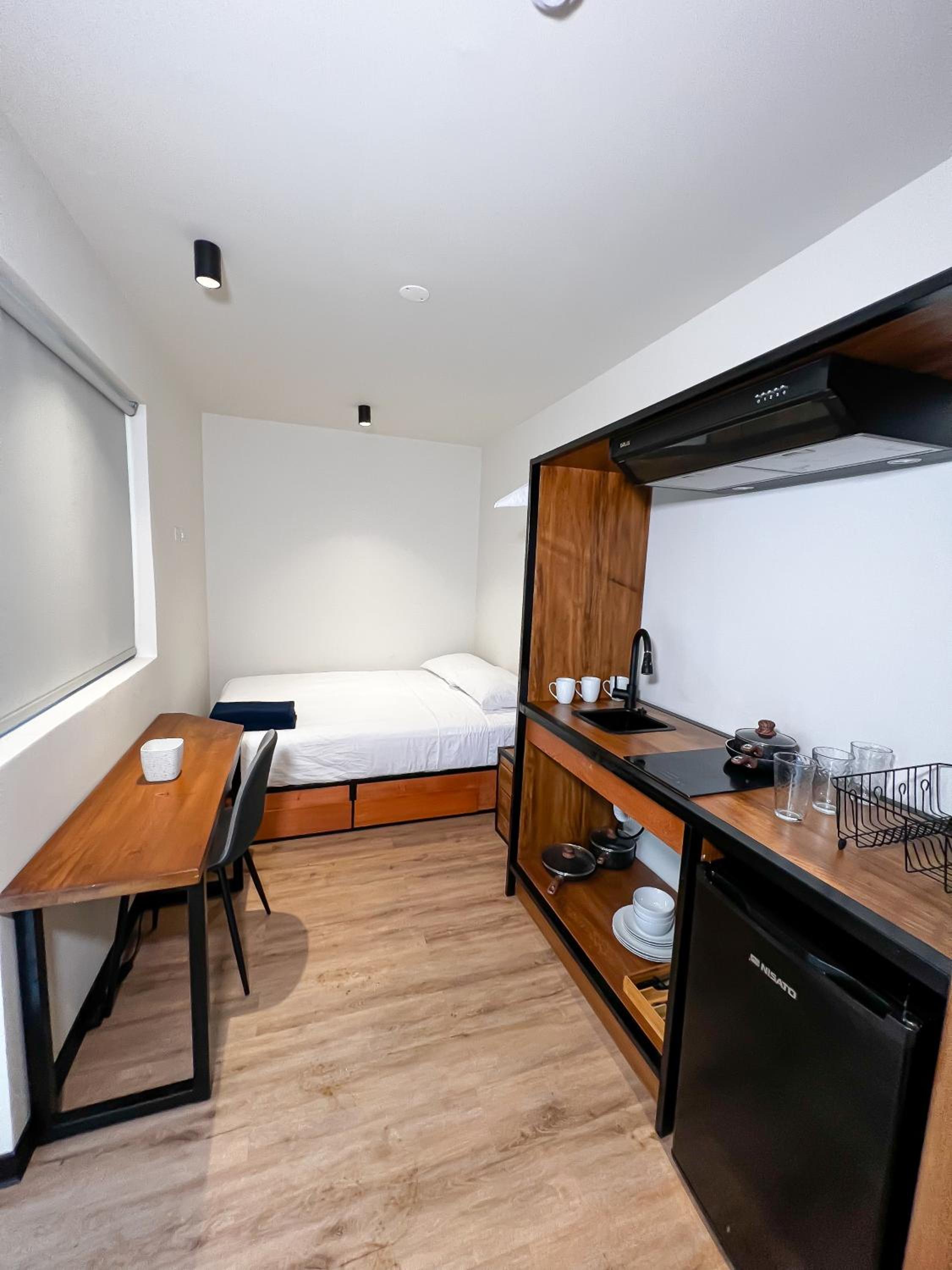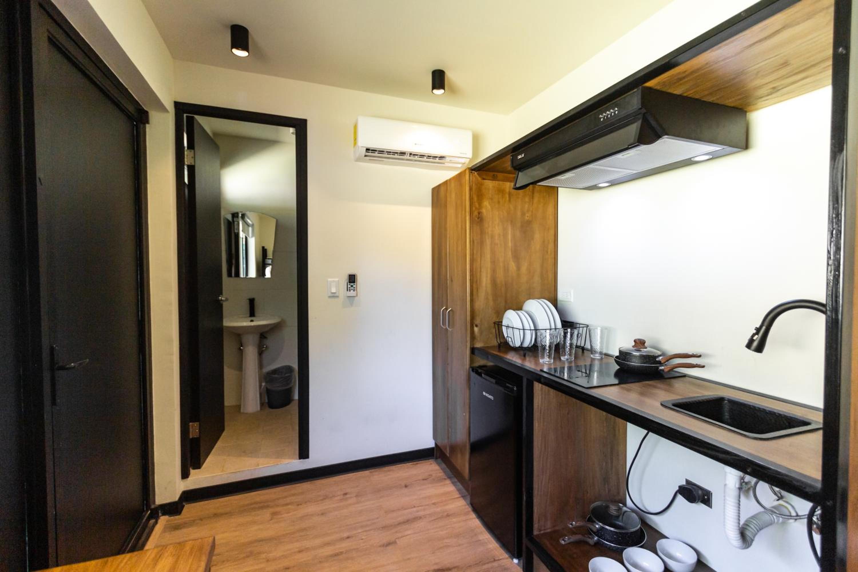 La habitación, con cocina y los Enseres necesarios para cocinar. El baño privado. La habitación era muy cómoda los espacios muy bien repartidos.