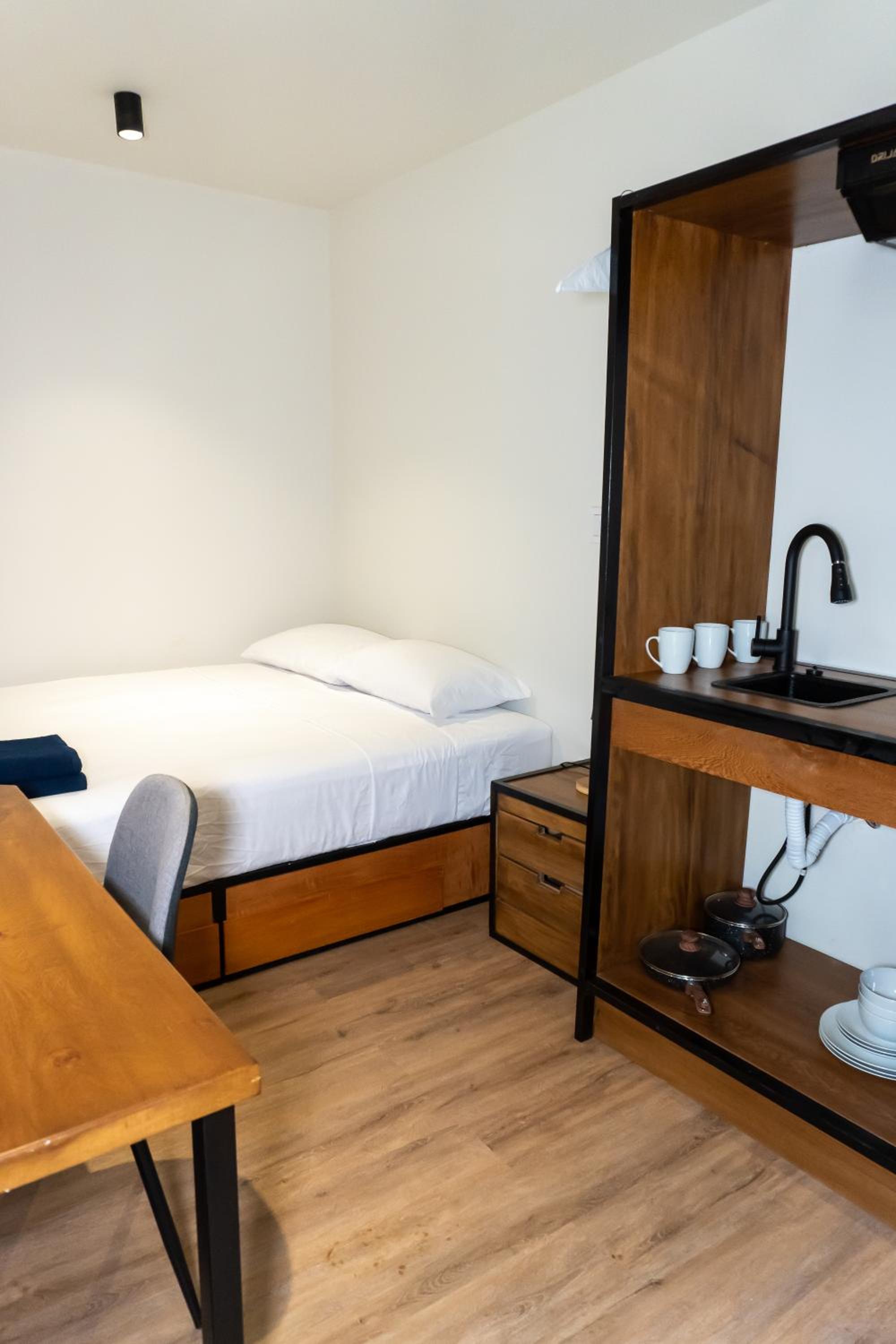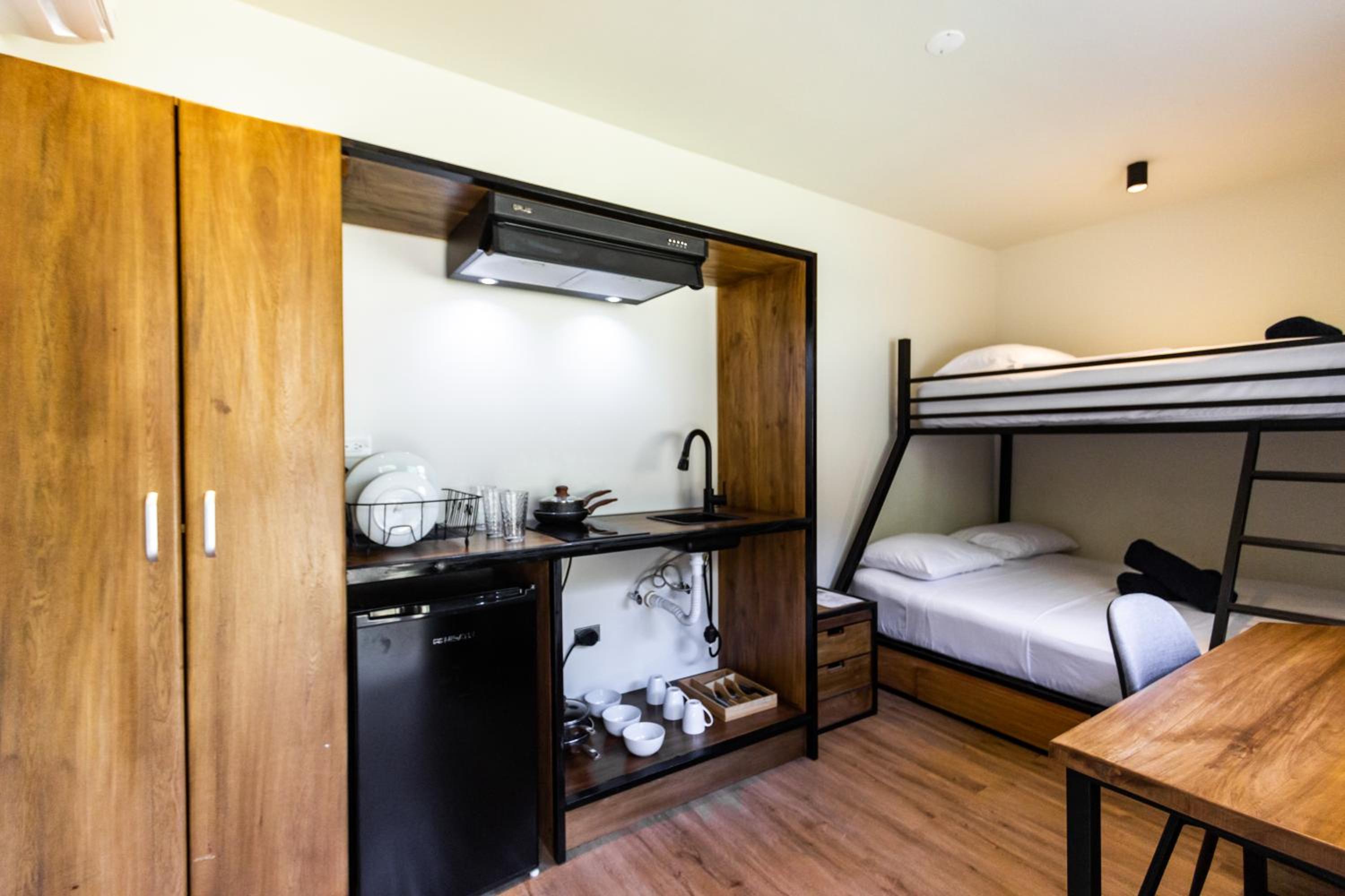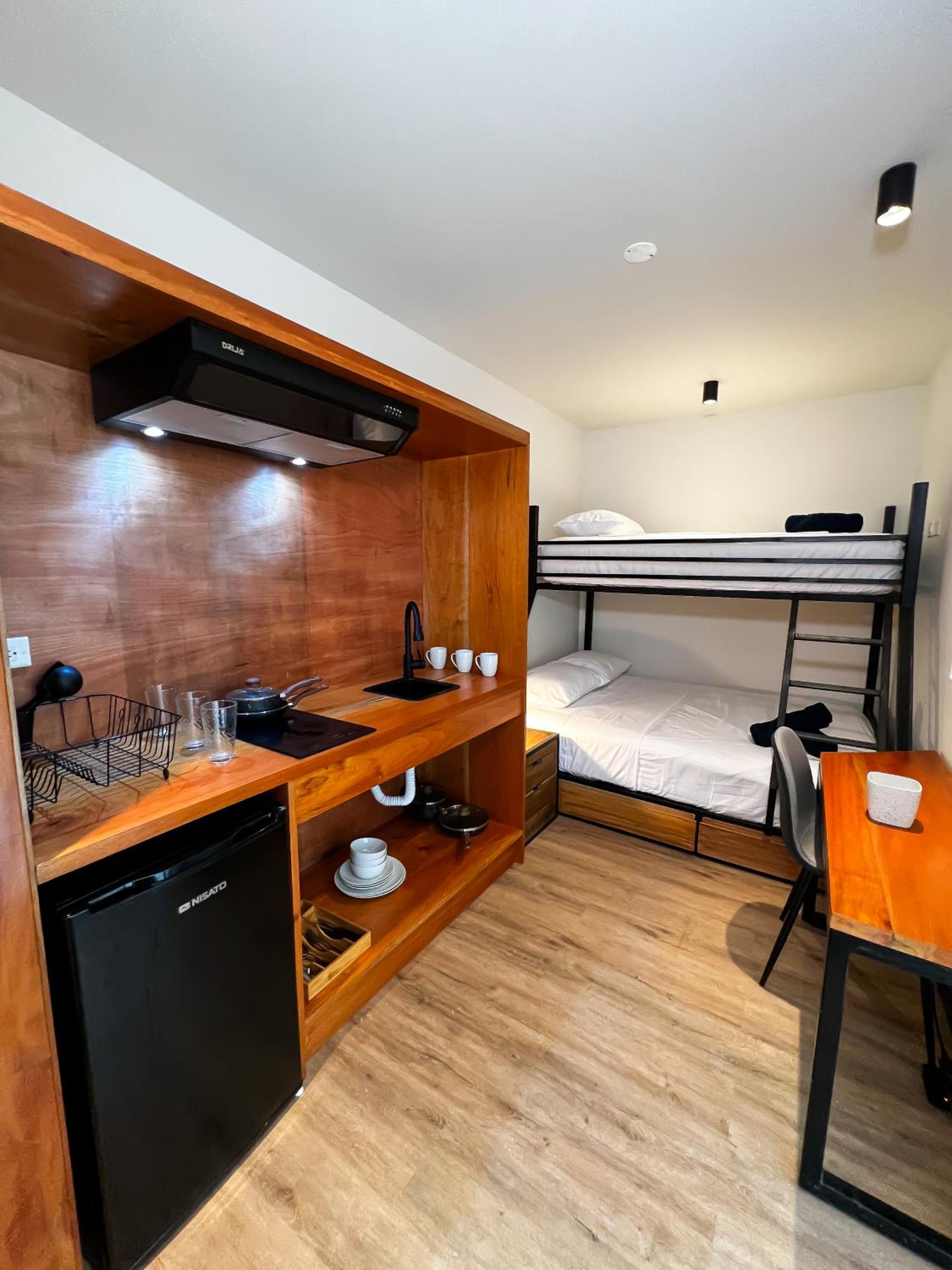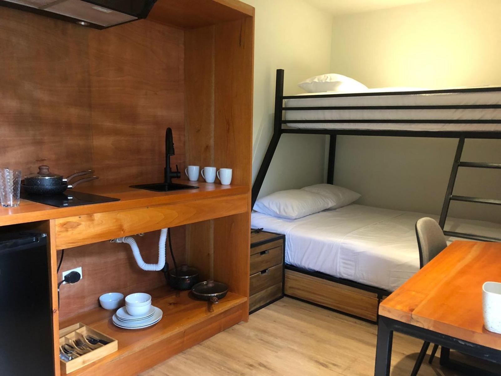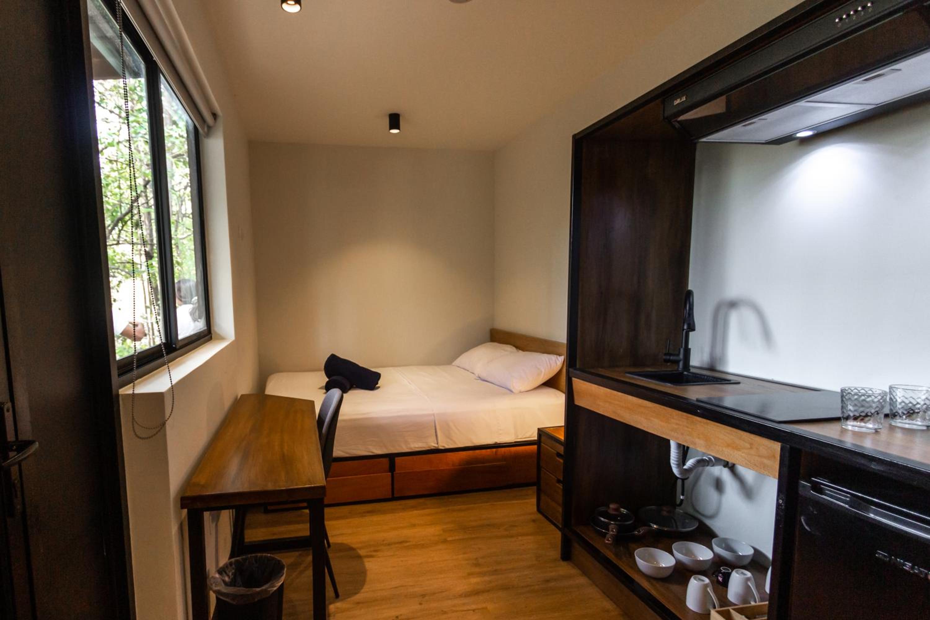 La habitación, con cocina y los Enseres necesarios para cocinar. El baño privado. La habitación era muy cómoda los espacios muy bien repartidos.