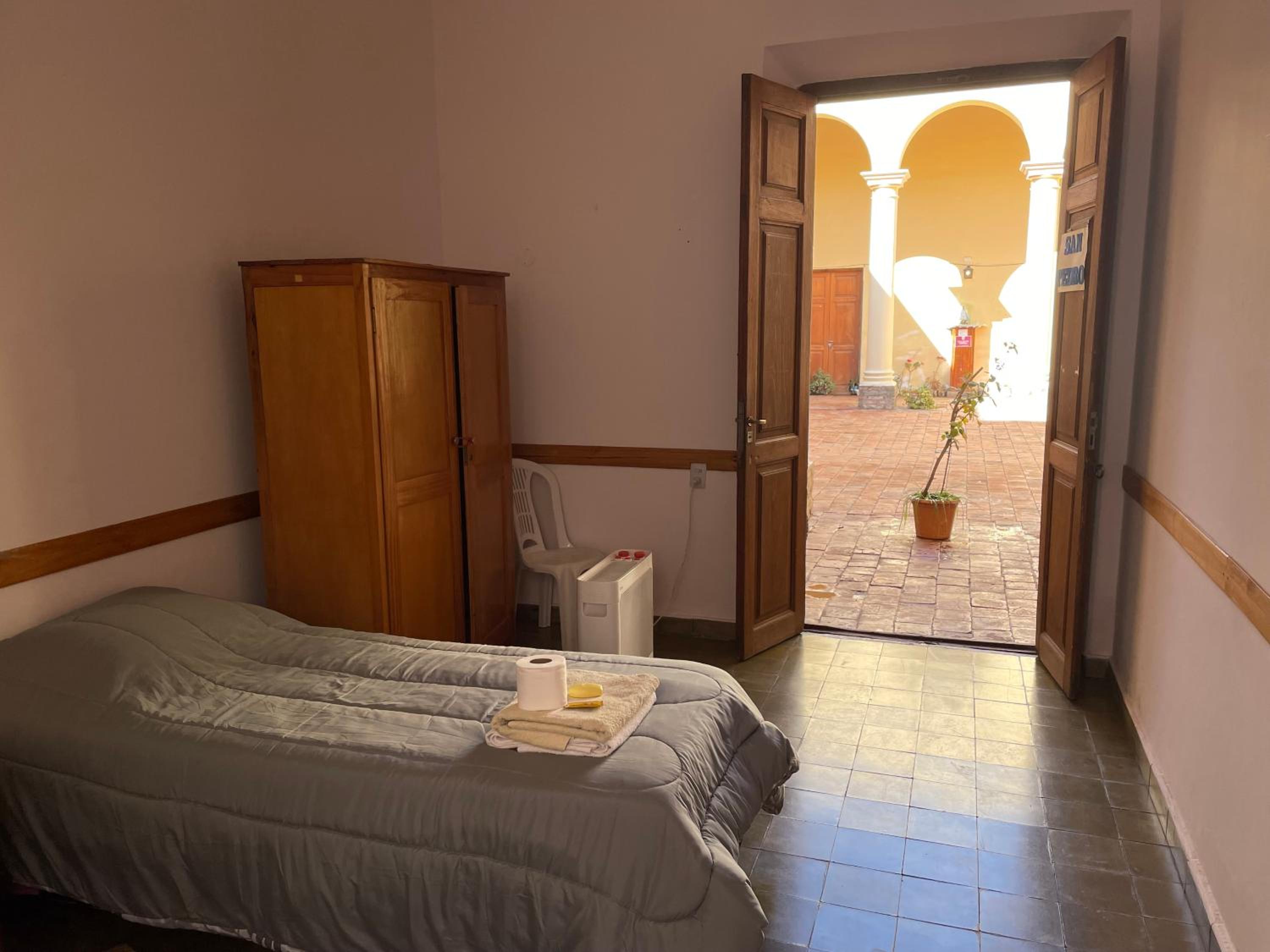Las habitaciones no estaban del todo pensadas. No hay armario ni tacho de basura. Hay que cruzar un patio abierto con palomas y caca de palomas para ir al baño o la cocina. Hay agujeros en el techo del baño. Nos tocó estar totalmente solos, sin nadie que nos reciba siquiera.