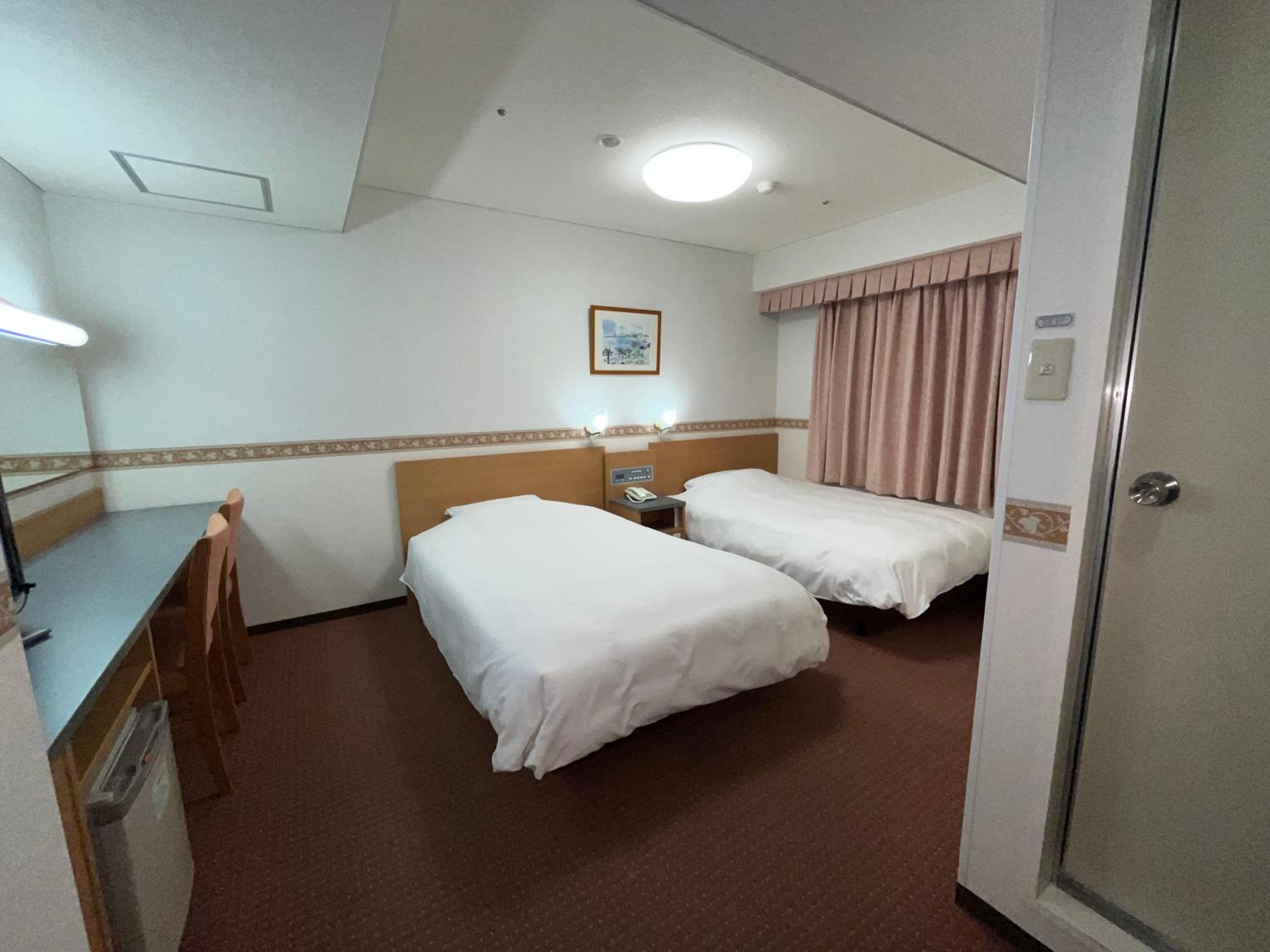 部屋やベッドの大きさは、ビジネスホテルらしいサイズ。