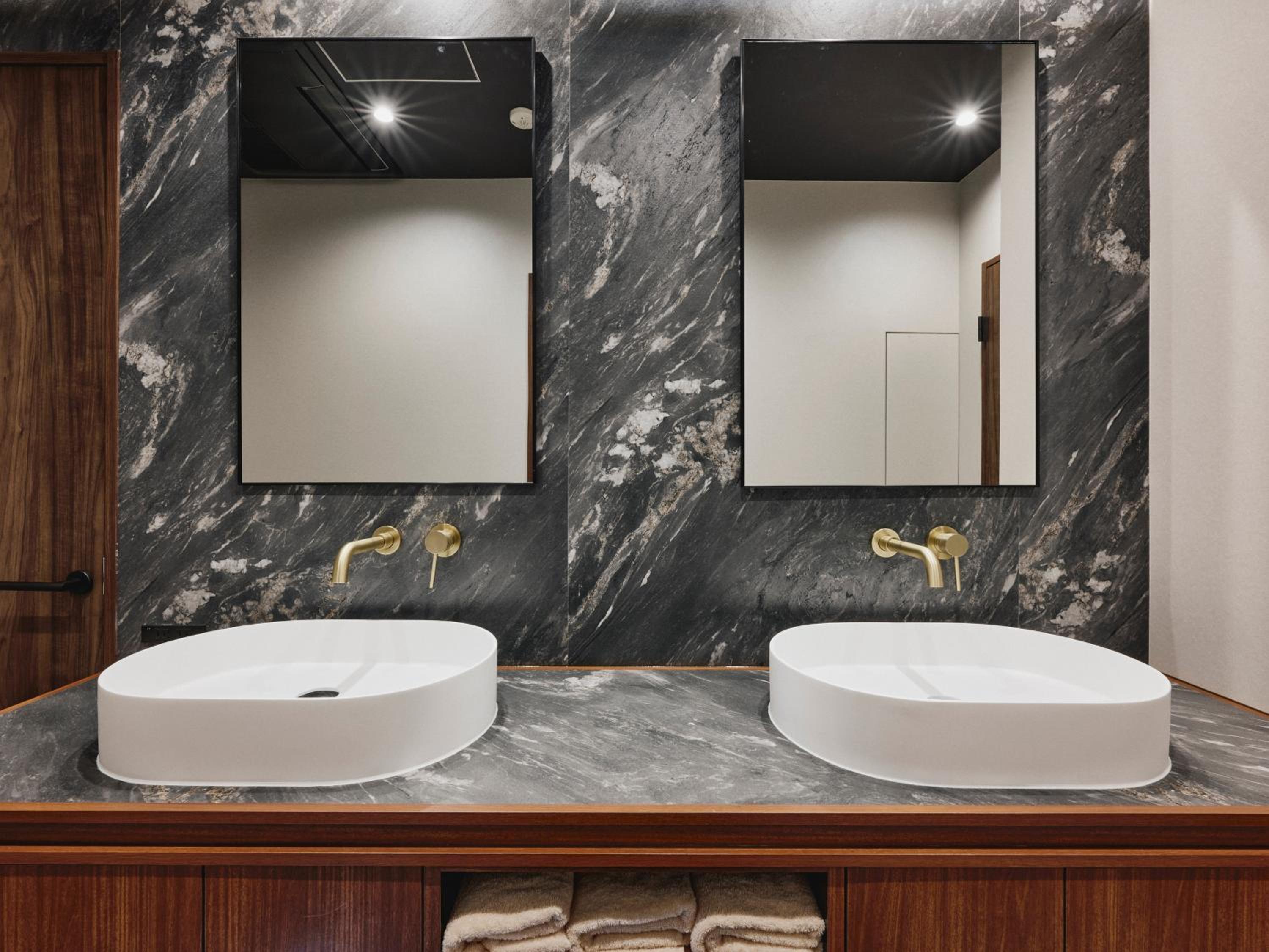 広くて、洗面台が2つ、キッチン、洗濯機があるところ。