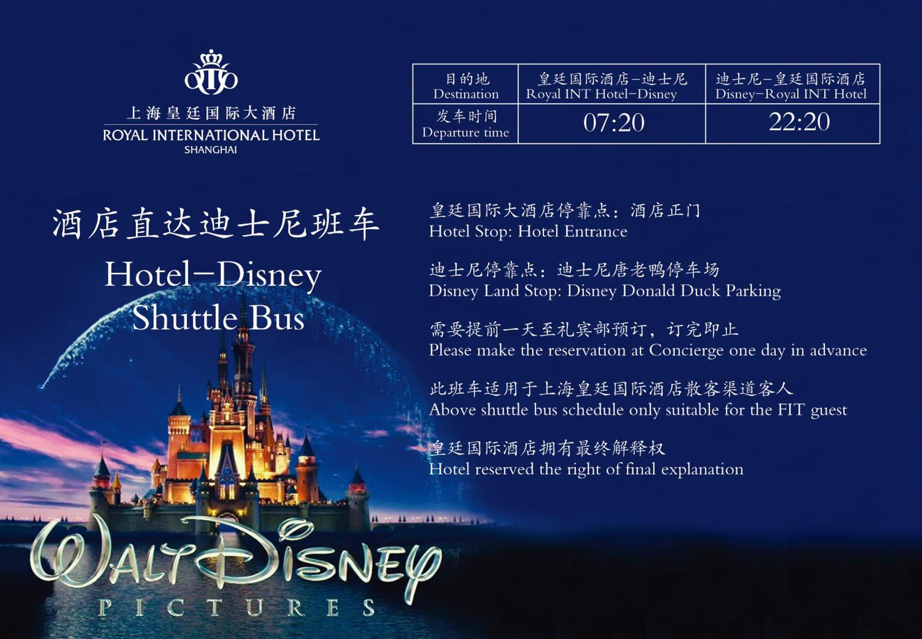 Guests are required to show a valid government-issued ID card or passport upon check-in. The hotel provides shuttle services to Shanghai Disney、Pudong International Airport and departure. Please make a reservation at least one day prior if you need any shuttle service. According to Shanghai’s anti-smoking regulations, smoking is not allowed in the property's indoor areas.