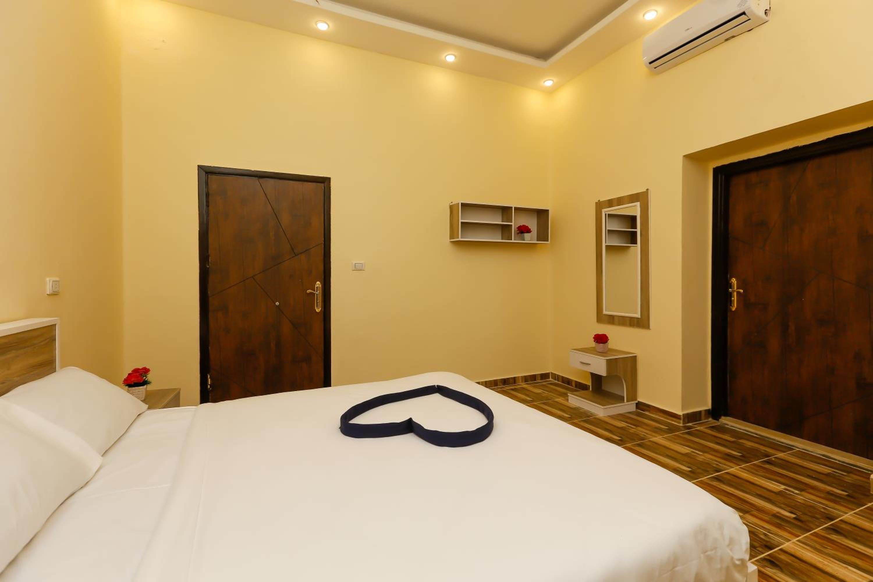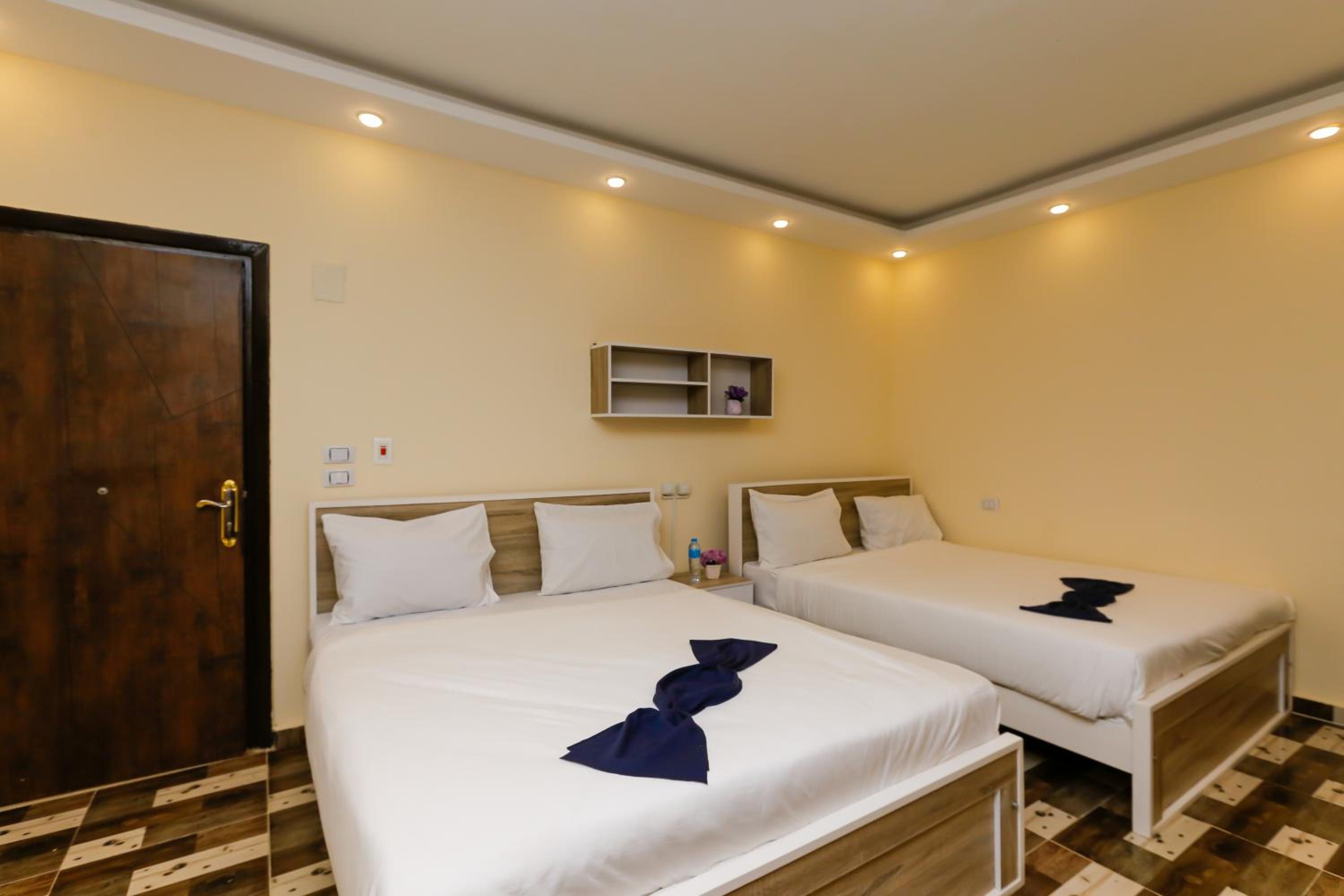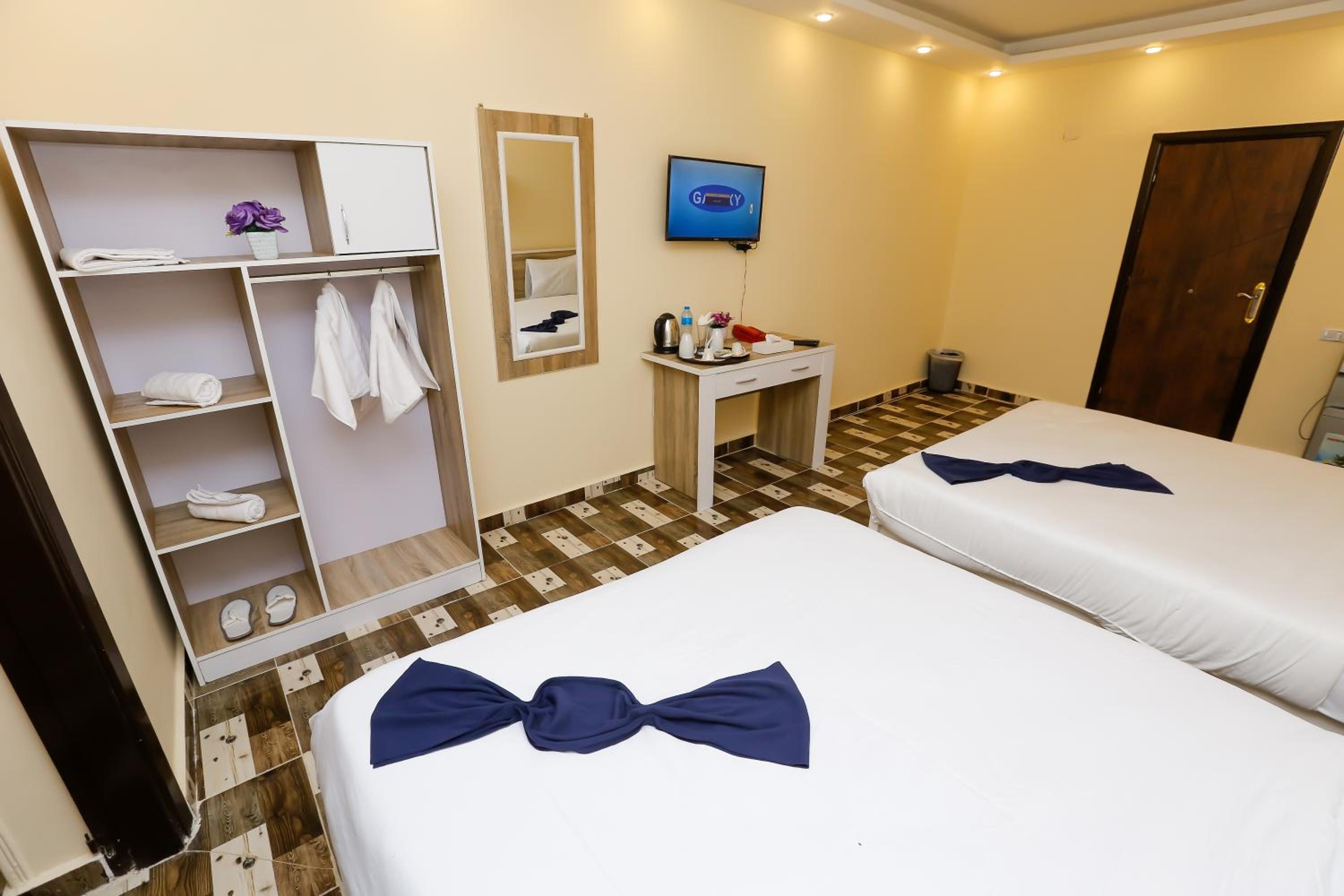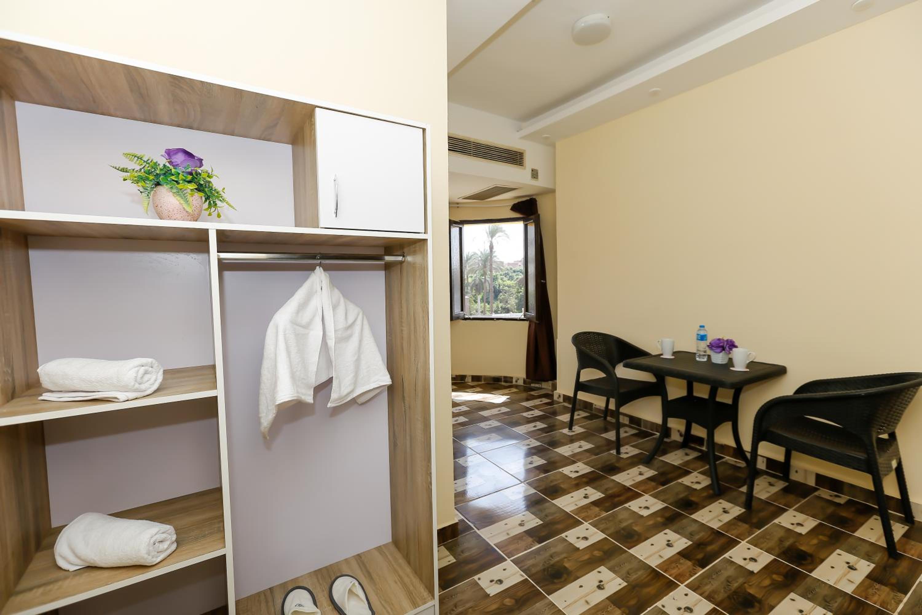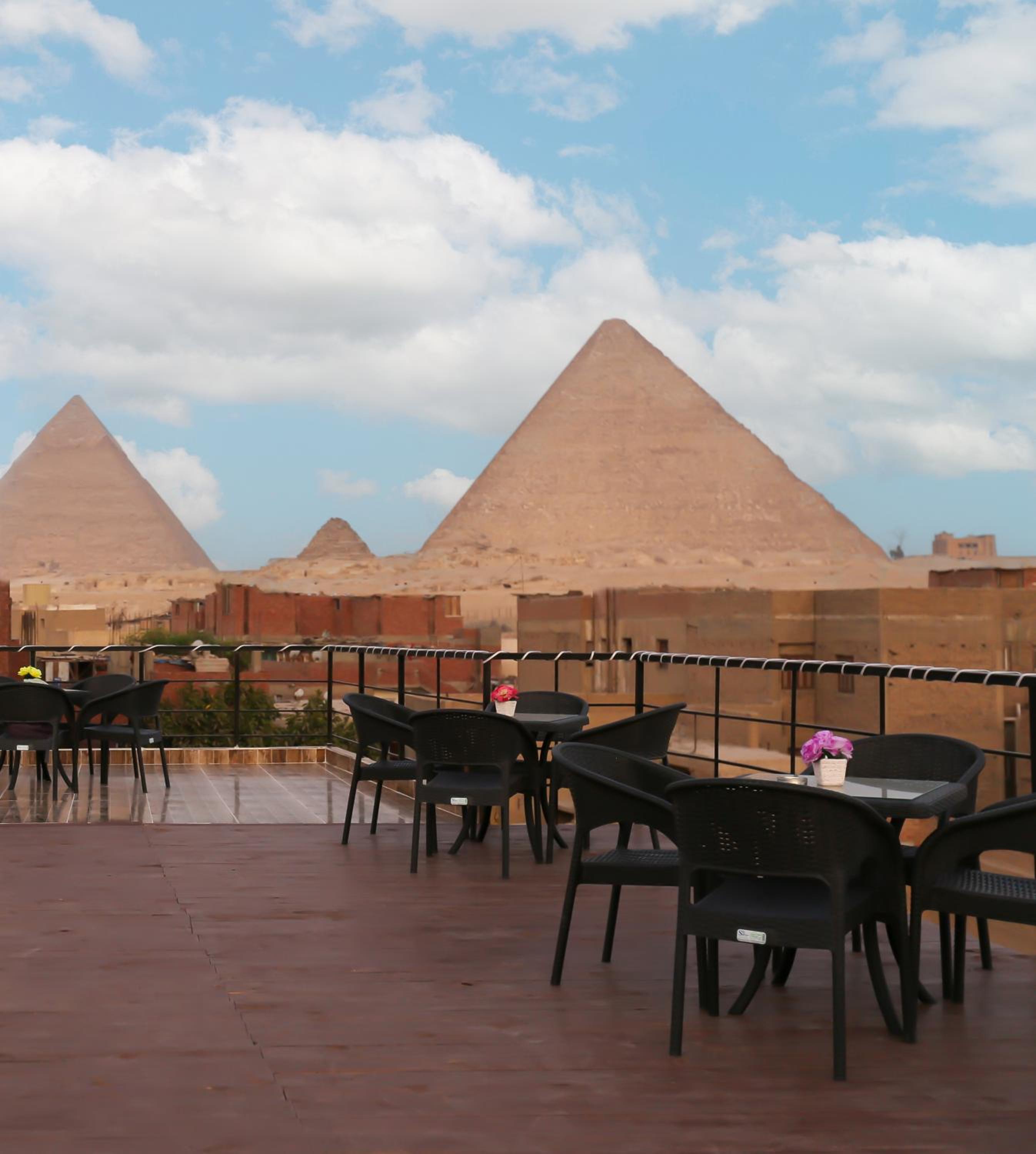 Tesis berbat . Yorumlara aldanıp tuttuk. Konaklanacak bir yer değil . Tek görevli her şeye yetişmeye çalışıyor. Oldukça bakımsız kalmış . Odalar kokuyor . Yıllardır badana yapılmamış . Duvarlar bile kirli. Yakında bakkal olmazsa içecek su bile yok. Mutfak kapalı . Cattle yok, çay yok . Sadece teras piramitleri uzaktan görüyor . Ama bakımsız sahipsiz kirli orası da. Bi gece mecbur kaldık. Kalan 3 geceyi iptal ettik ancak paramızı iade etmediler . Kaldığımız gece için 3 odaya sıkıştık bir oda berbat koktuğu için . O odanın da parasını aldılar . Çarşaflar kirli ve nemli idi. Odalarda pencere yoktu . Bundan dolayı odalar kokuyordu. Sonuç olarak korkunç bir deneyim yaşadık ve 400 dolarımız yandı . Sakın yorumlara aldanıp gelmeyin . Şehir merkezinde güzel oteller var . Giza bölgesi sadece piramitler için gelip dönülecek bir yer . Yol masrafı hiç bir şey. Yakın olmak için riske girmeye gerek yok
