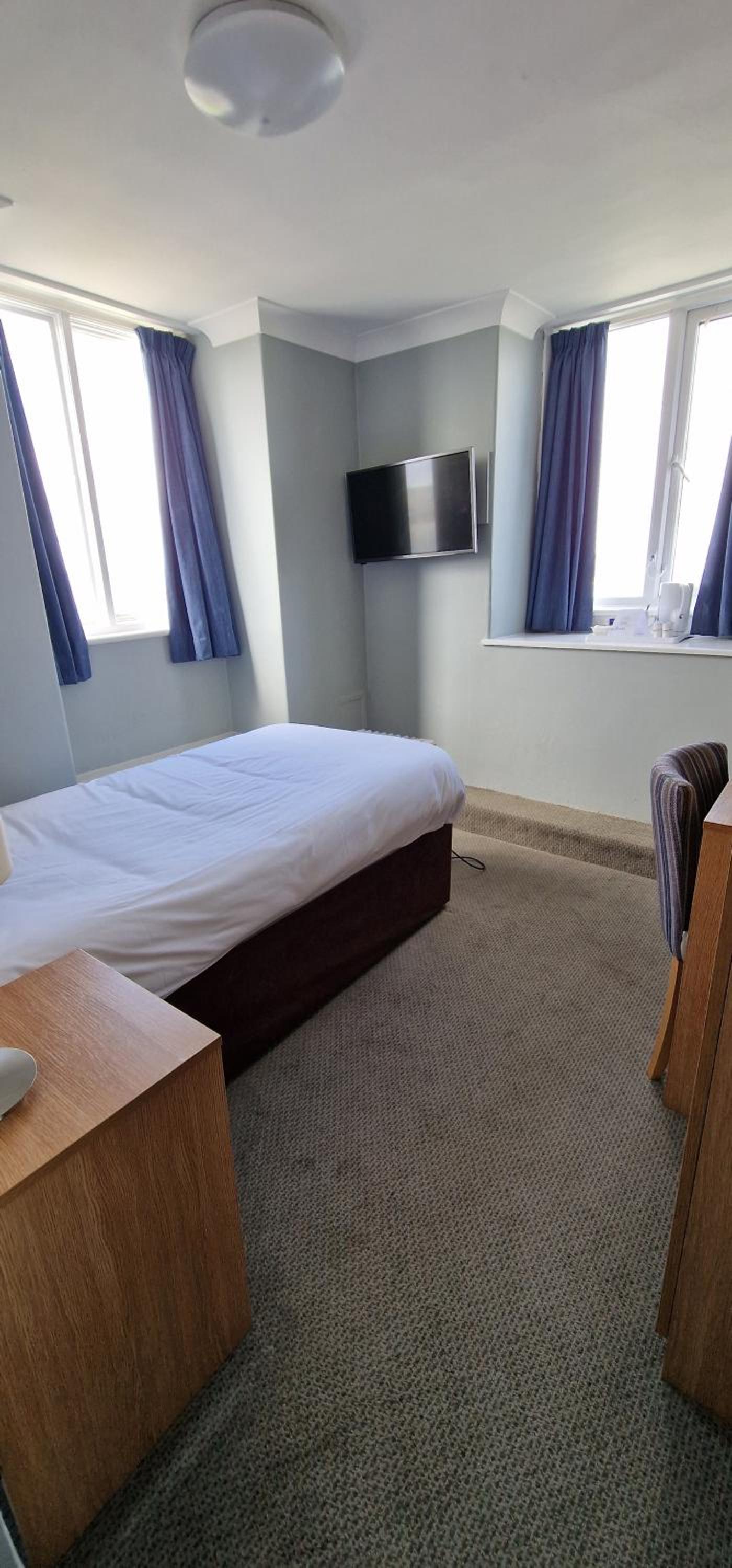 Dirty room. Spring sticking out the mattress. Tv didn't work. Smelled of dogs. No bar open. We asked to move rooms and Mark on reception was very helpful and sorted it for us straight away.