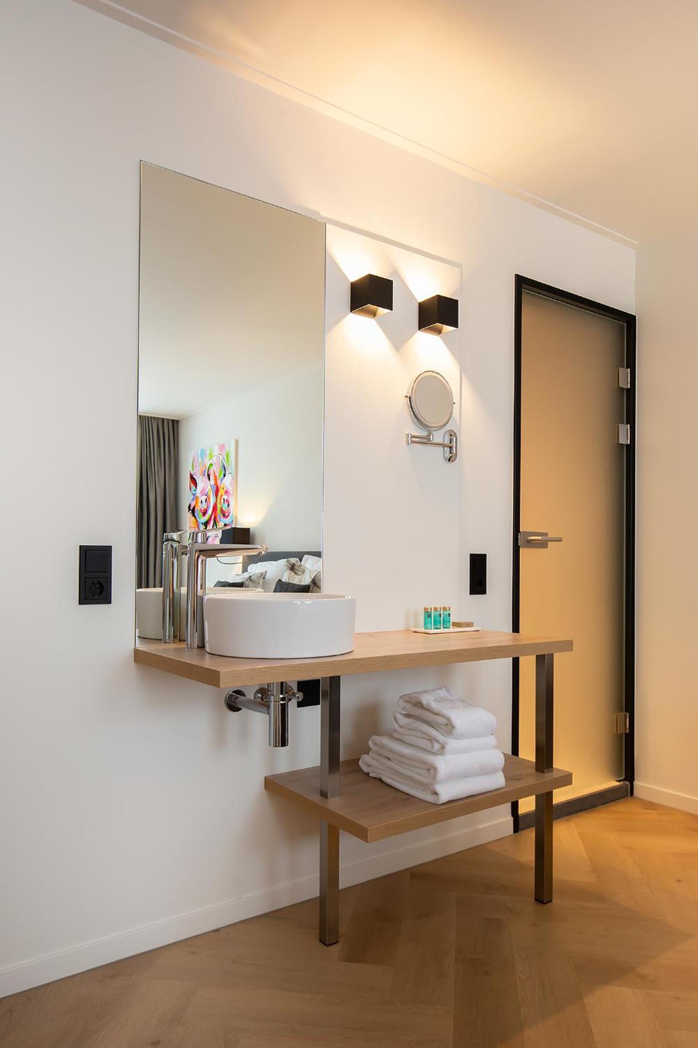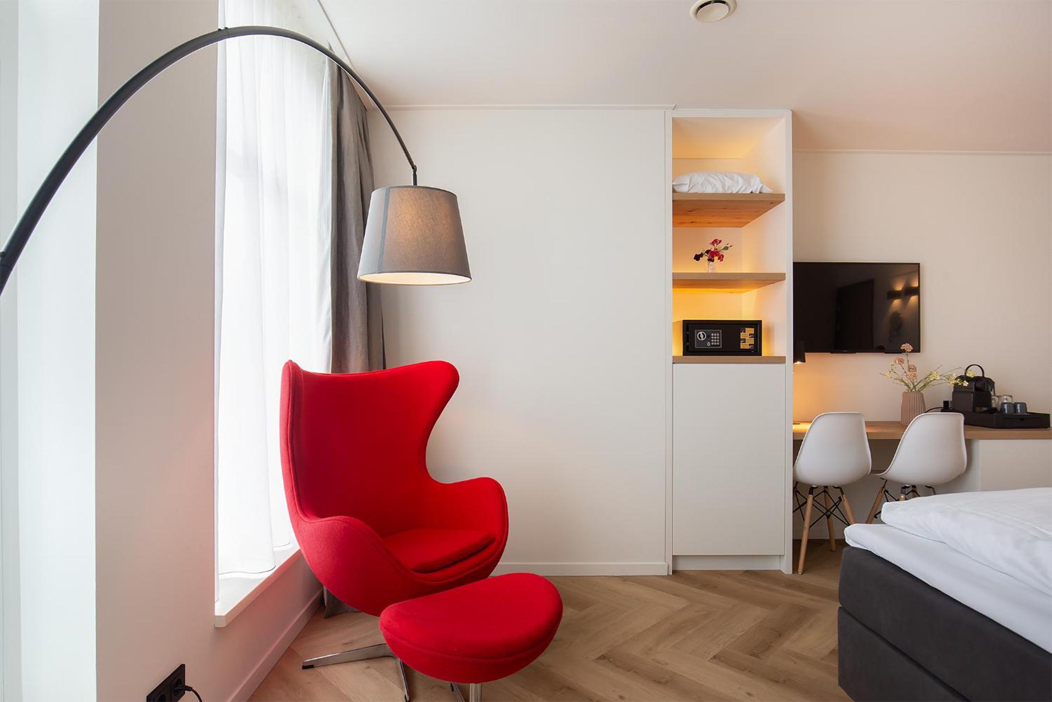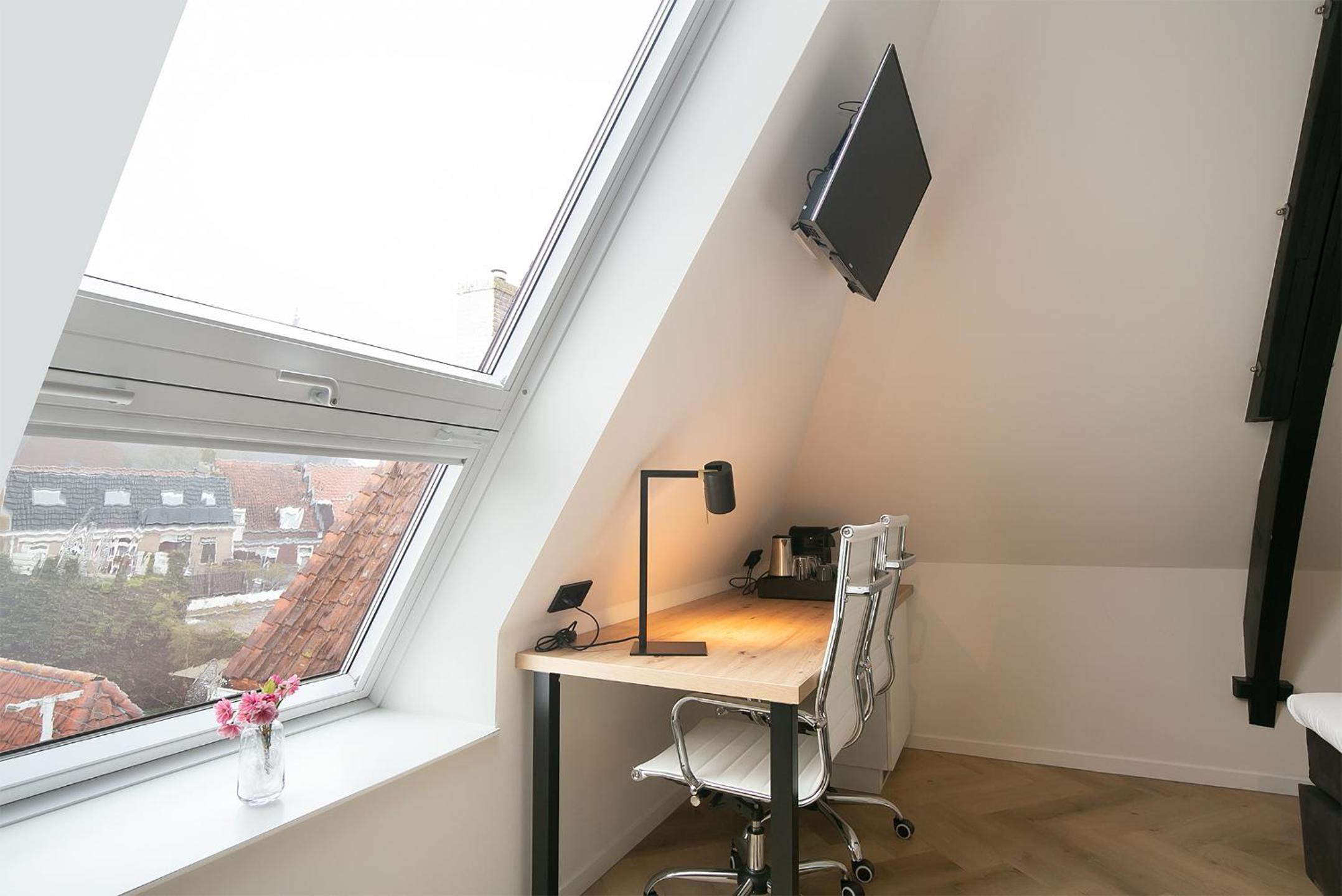 Echt ruime kamer, mooi, slim, stijlvol ingericht, ruime douche, leuke extra bank/zitplek om te chillen of nog even ochtend-of avondzonnetje mee te pakken, koffie en theehoekje, magnetron beschikbaar, alles met mobiel te regelen, alles was top. Algemene hal kun je drankje en chips scoren, met trap of lift naar boven.