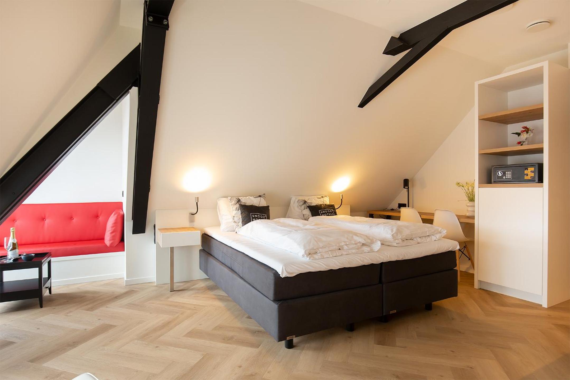 Snoozz Hotels Bolsward Boutique hotel zonder receptie met digitale sleutel offers a seamless stay with express check-in/out and free WiFi. Luxurious Room Amenities include air-conditioning, coffee machine, and flat-screen TV. Some rooms feature city views for a special touch. Cycling Paradise with bike hire available, perfect for exploring the scenic surroundings. Book now for a memorable and convenient stay at Snoozz Hotels Bolsward Boutique hotel zonder receptie met digitale sleutel.