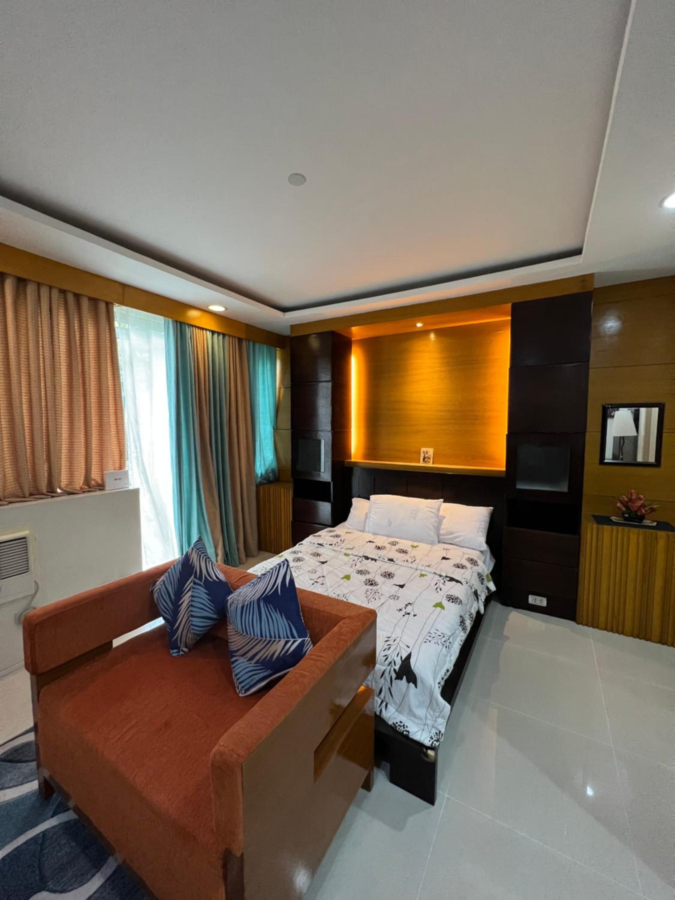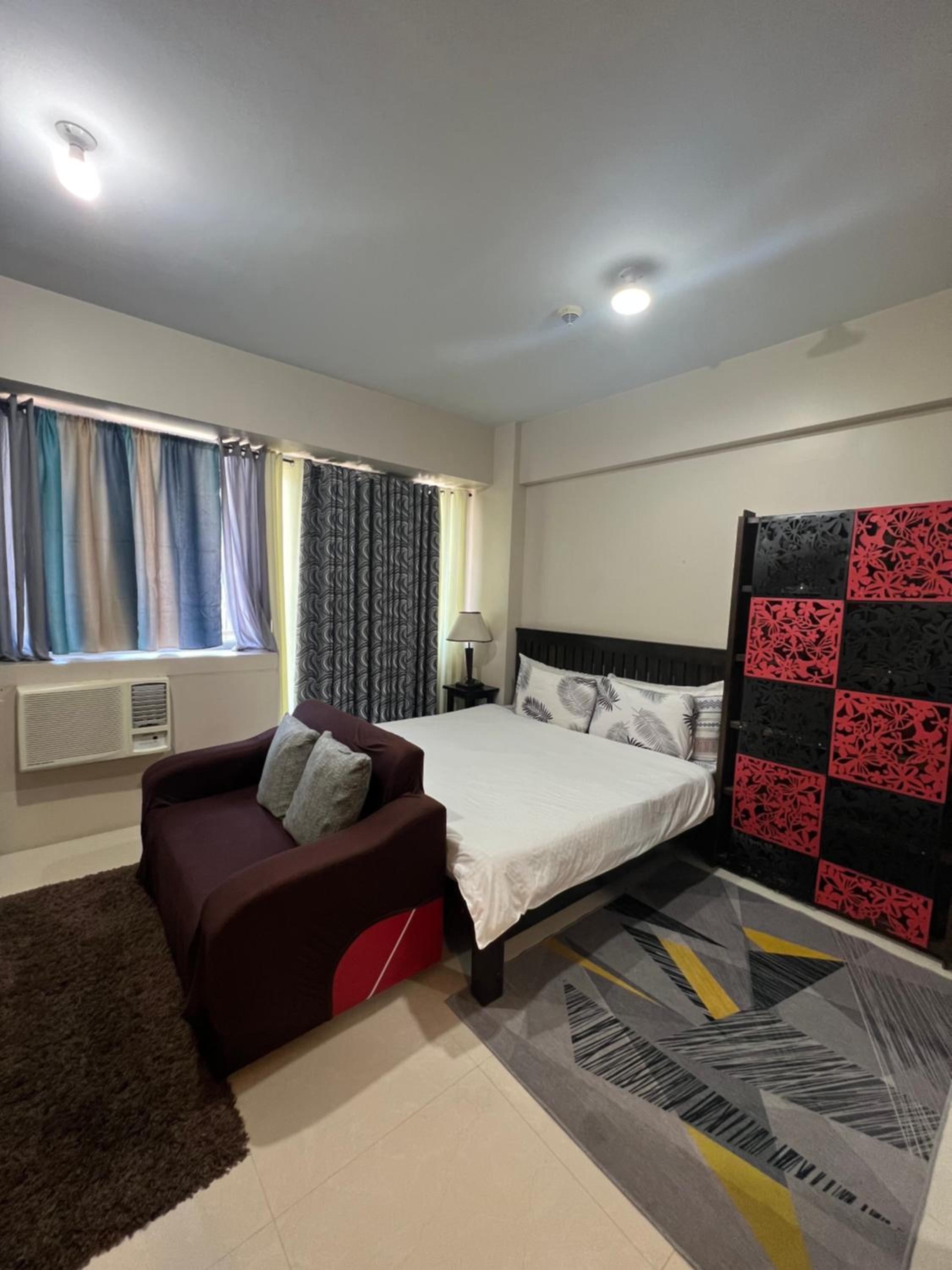 To make it better, just choose a plain color for your bedsheet, pillow cases and matress cover. And buy a matress that is soft not a foam. The seat cover as well looks cheap as well as the carpet, it feels dirty. The AC doesnt rotate and good thing they have a stand fan that will circulate the air. However overall, if you will just stay for a night, its a goood choice, walking distance from the airport. It also has microwave, and kitchen utensils.