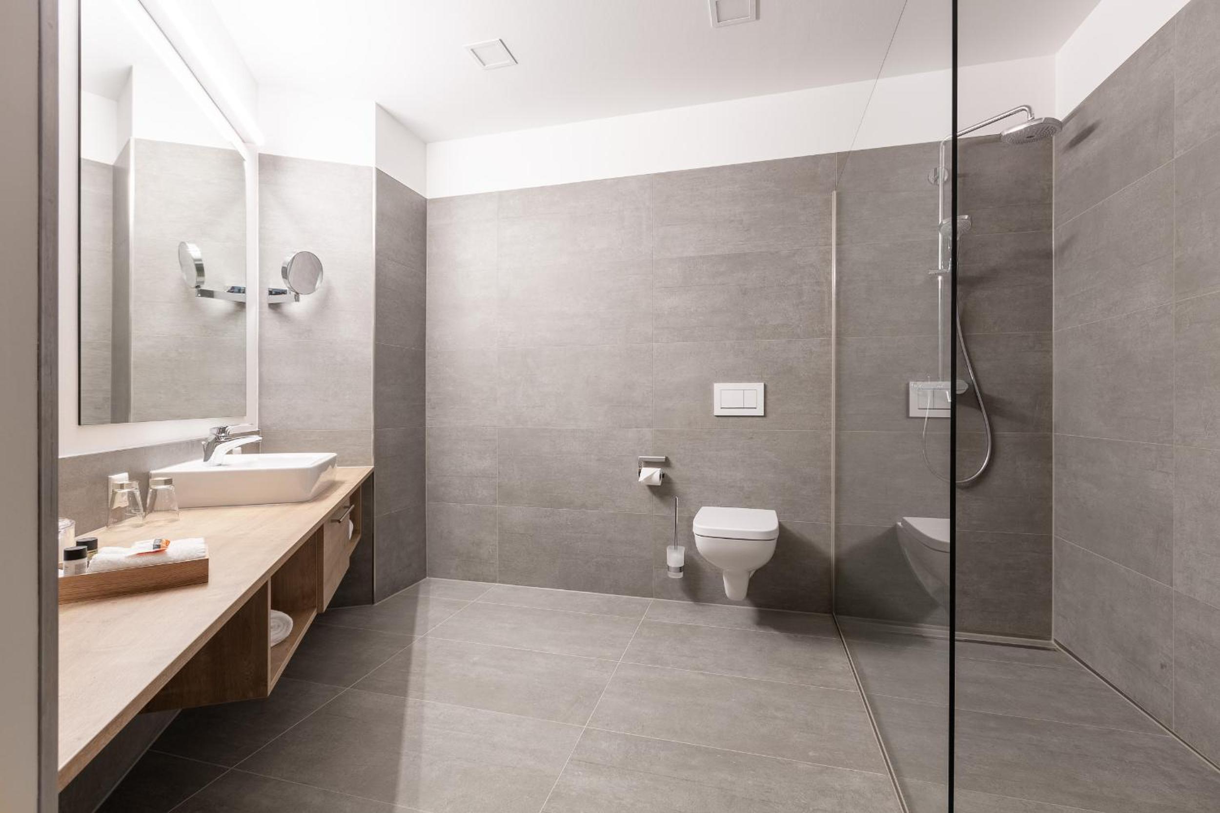 Die Zimmer hatten ebenfalls einen Kühlschrank und eine Kaffeemaschine. Die Dusche war groß und ebenerdig. Es gab tatsächlich genug Steckdosen im Zimmer, was nicht üblich ist.