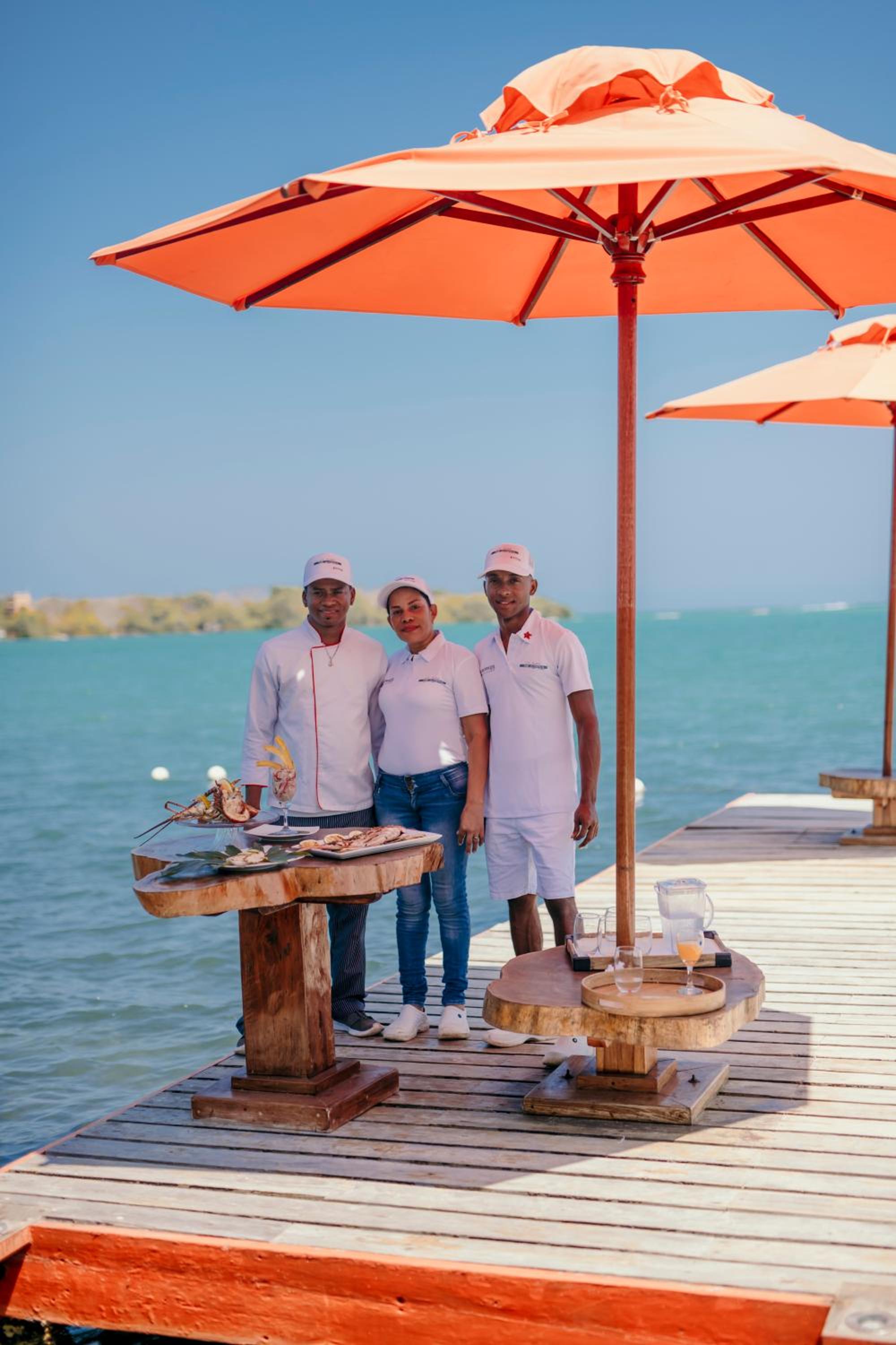 La playita privada del hotel y el embarcadero con las reposeras sobre el mar