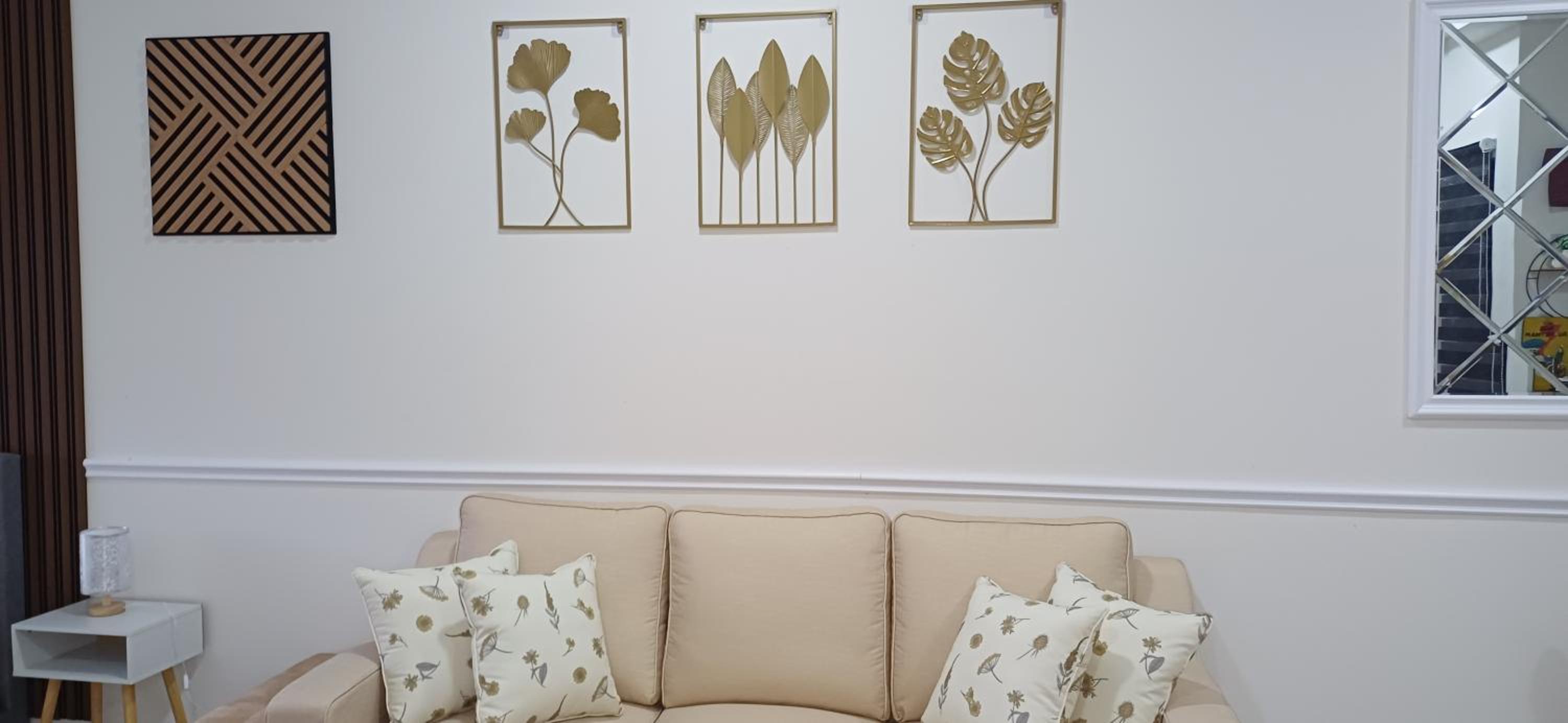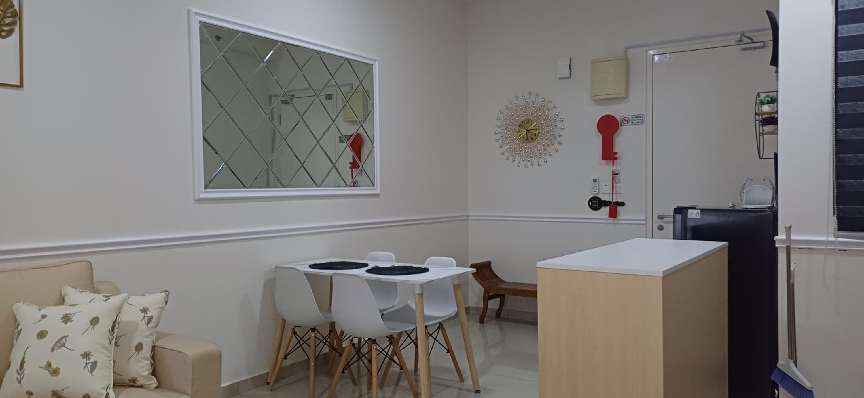 Unwind in our air-conditioned homestay with a fully equipped kitchen, cozy seating area, and dining area.
