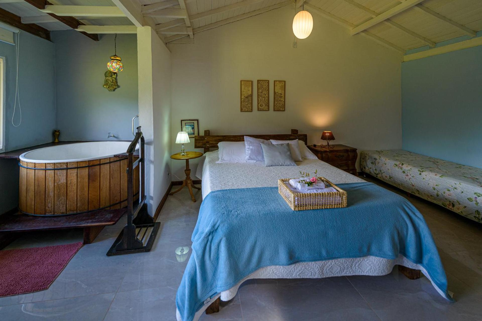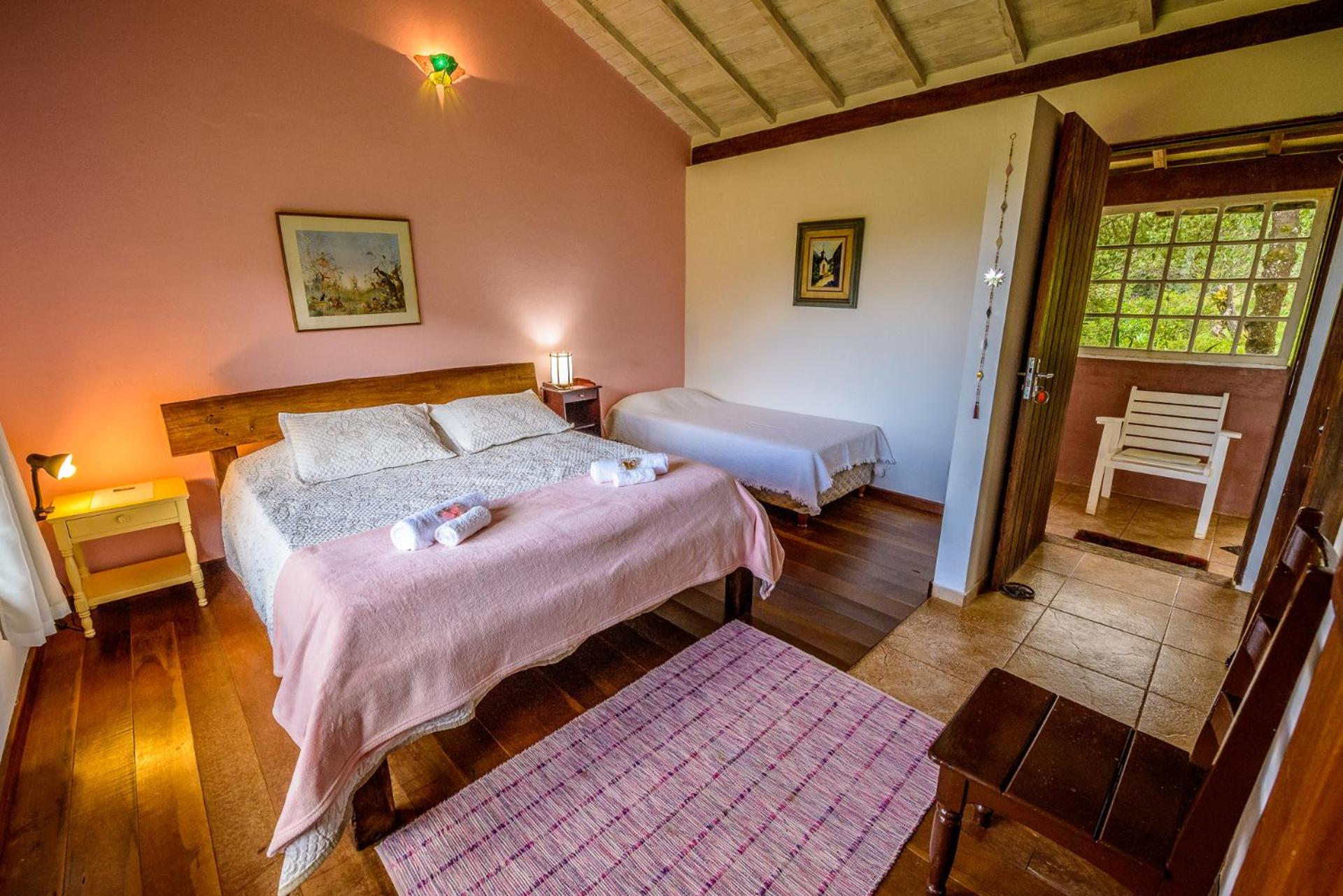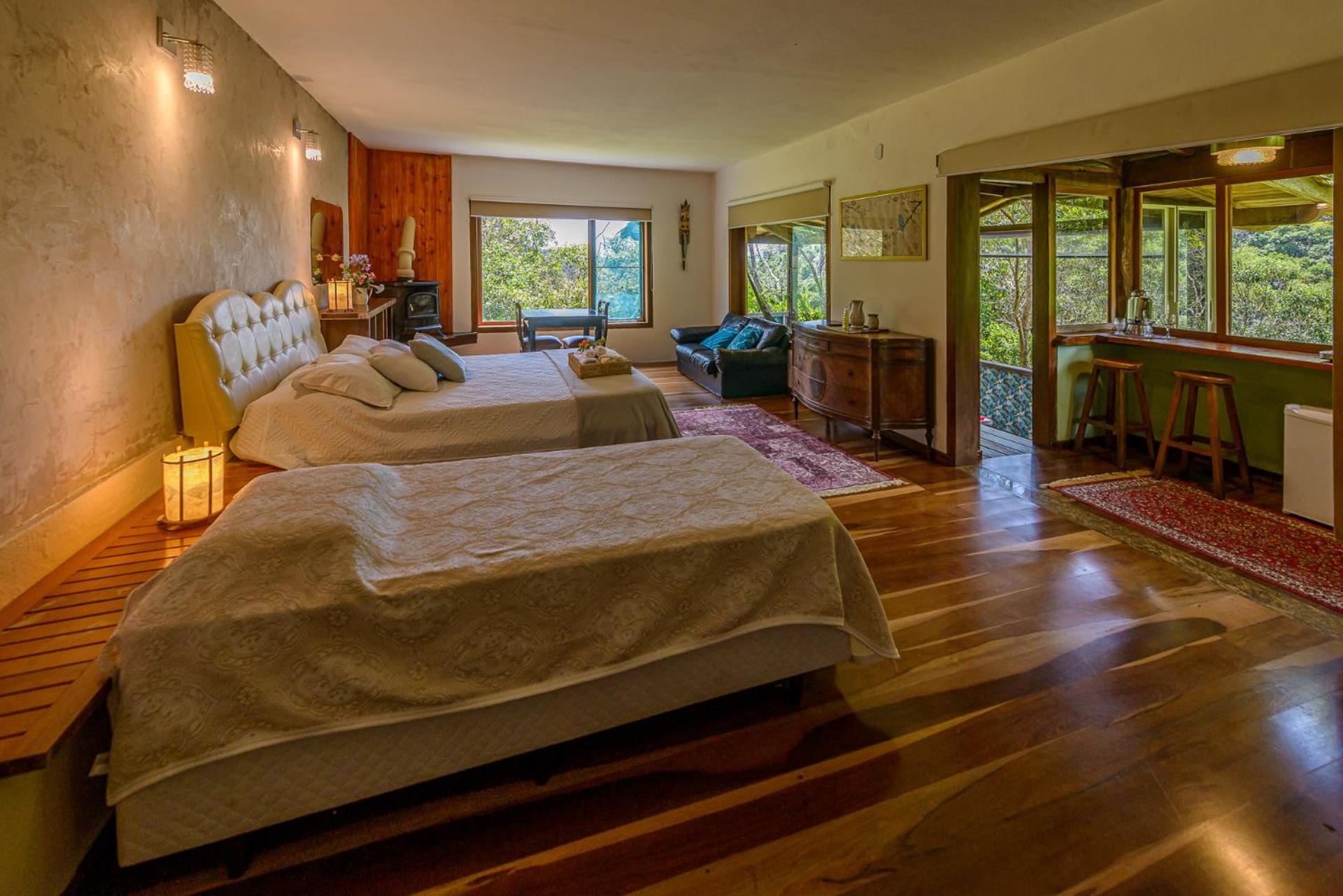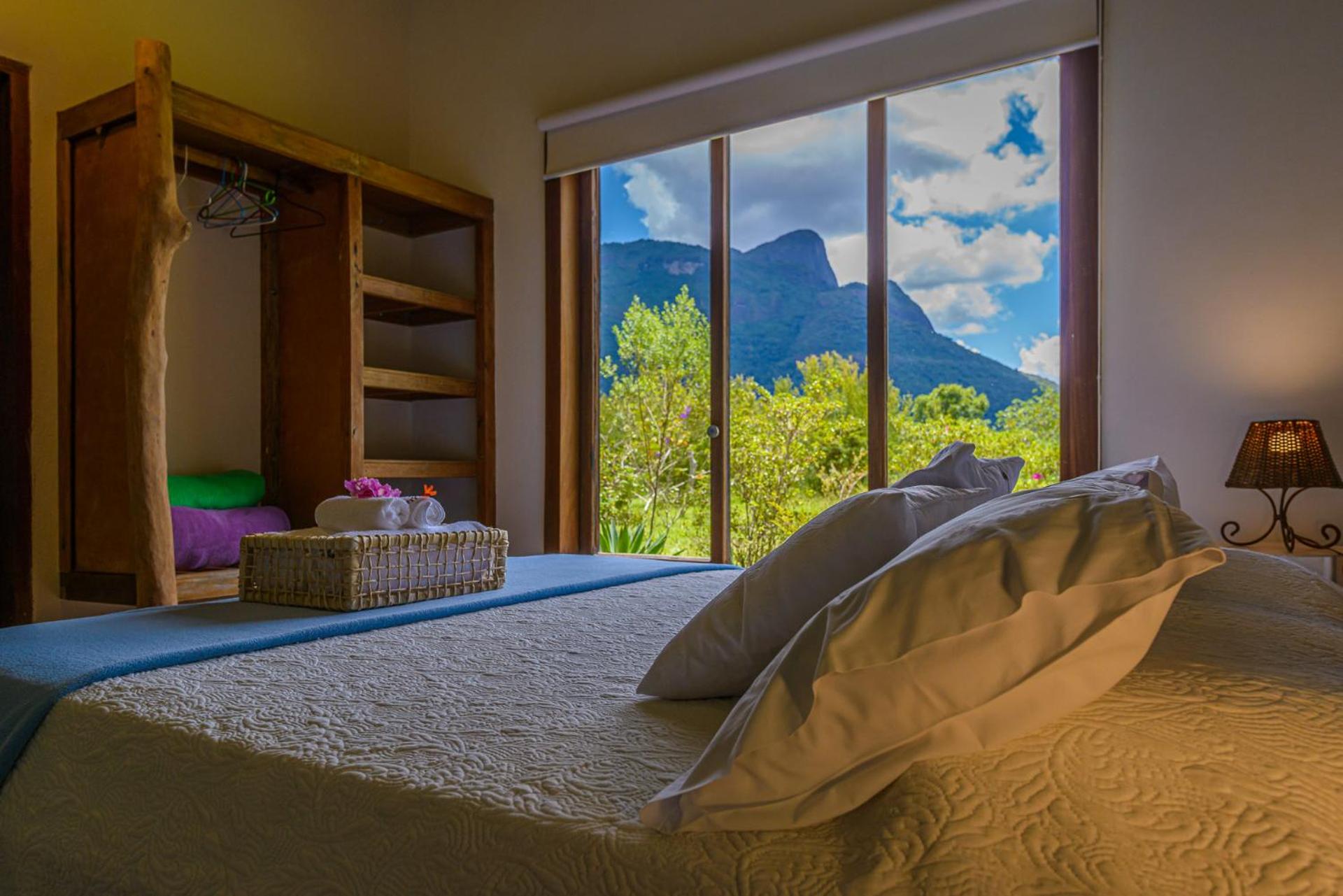 A cama é super grande. A vista do pico, pela grande janela, dá um excelente despertar. Silêncio para dormir. E o café da manhã é ótimo. As coisas são gostosas, bem caseiras. Frutas para colher no gramado. O Rickson nos recebeu com grande carinho. E tem um trecho maravilhoso de rio na própria pousada.