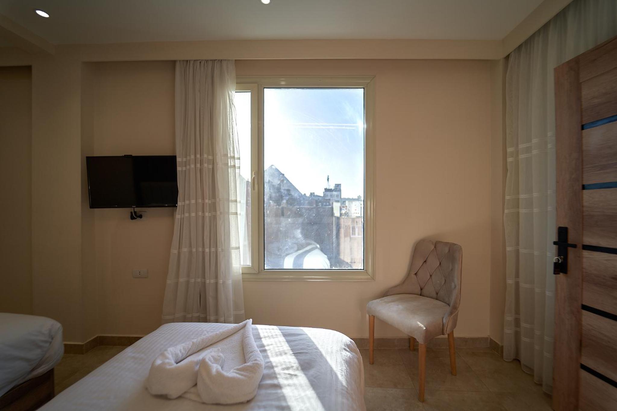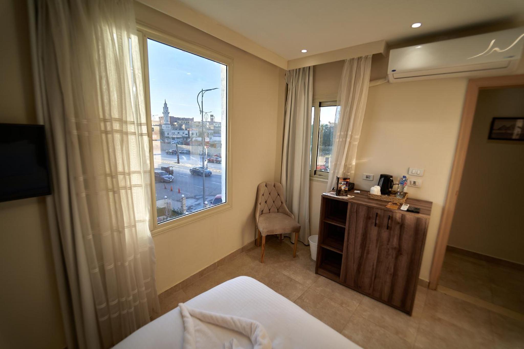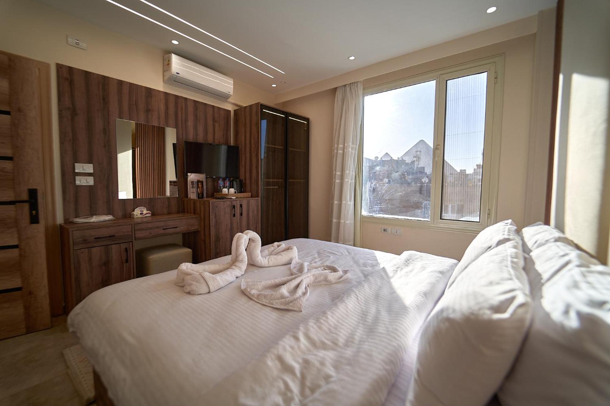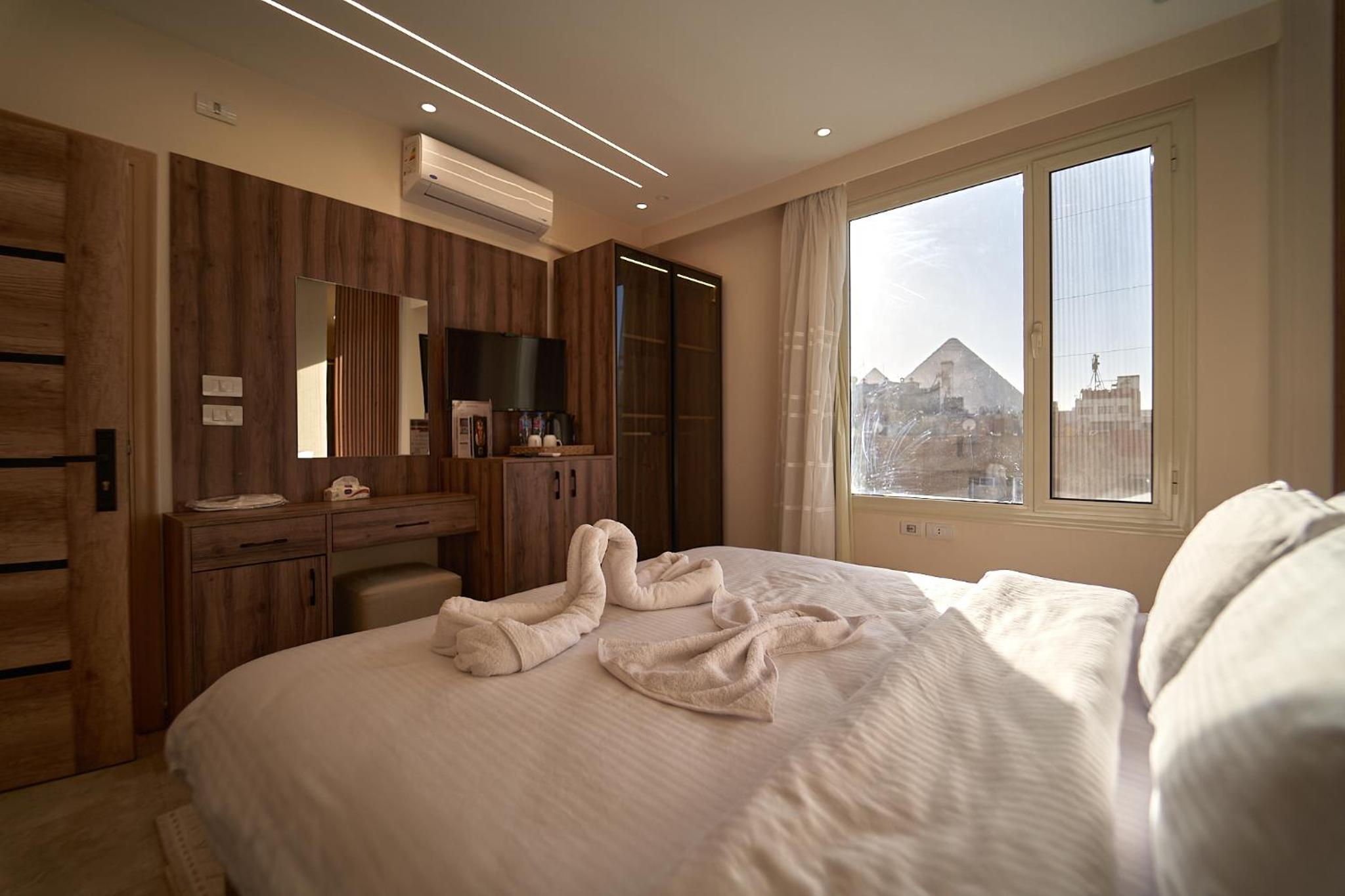 Beautiful hotel, it opened recently as Ahmed told us. Ahmed is the owner of the hotel and we were lucky enough to meet him. He helped us with everything we wanted to book in terms of tours and attractions. As for the hotel everything was perfect. The room was renovated and modern and it had everything we needed. It was really comfortable and clean as well. Our favourite part of the hotel was the rooftop, where we were having homemade breakfast with the outstanding view of the Pyramids. Location was great as well since we were only 10 minutes away from the pyramids and there were plenty of shops around the hotel. 100% recommended if you ever visit Giza.