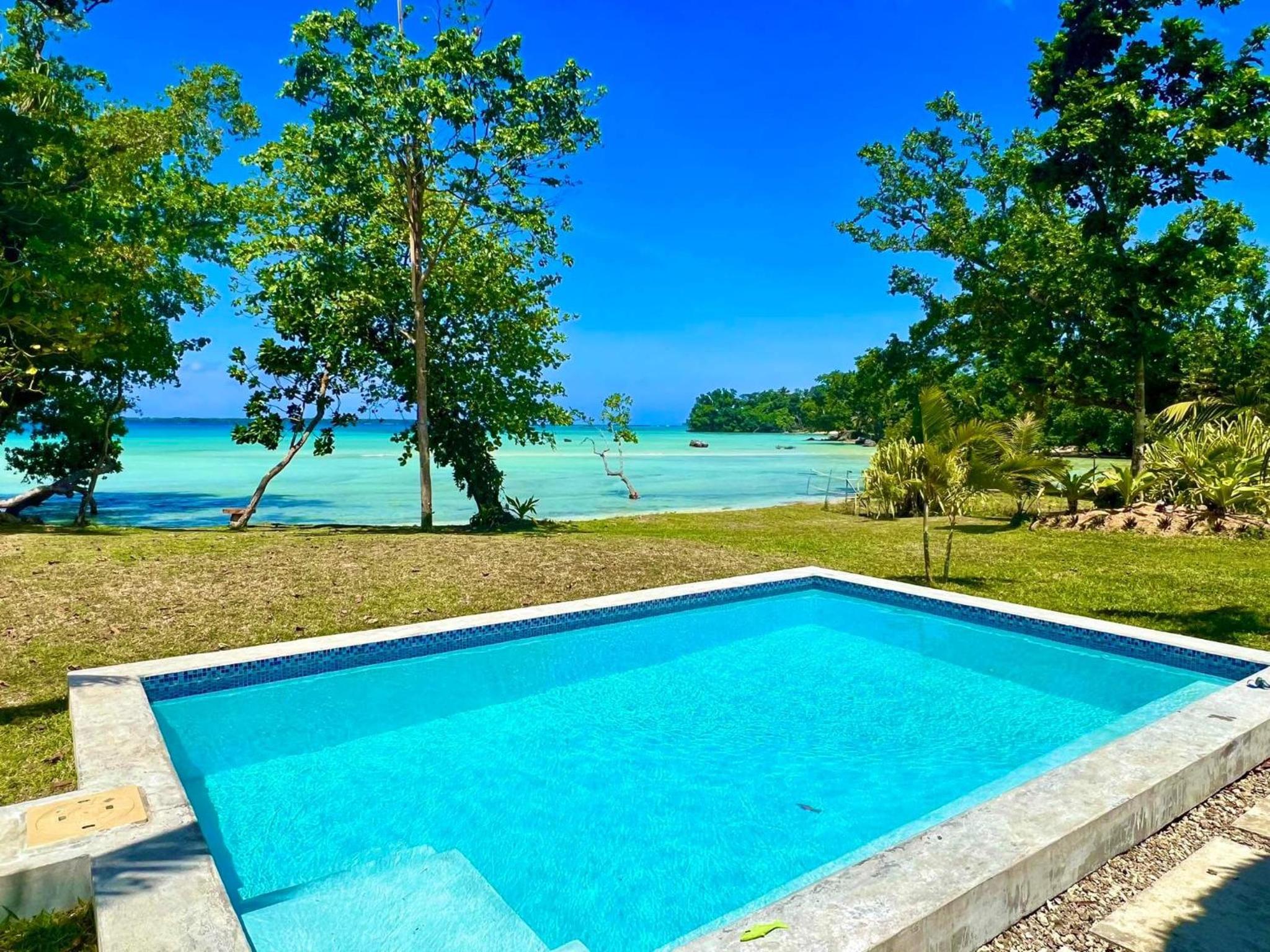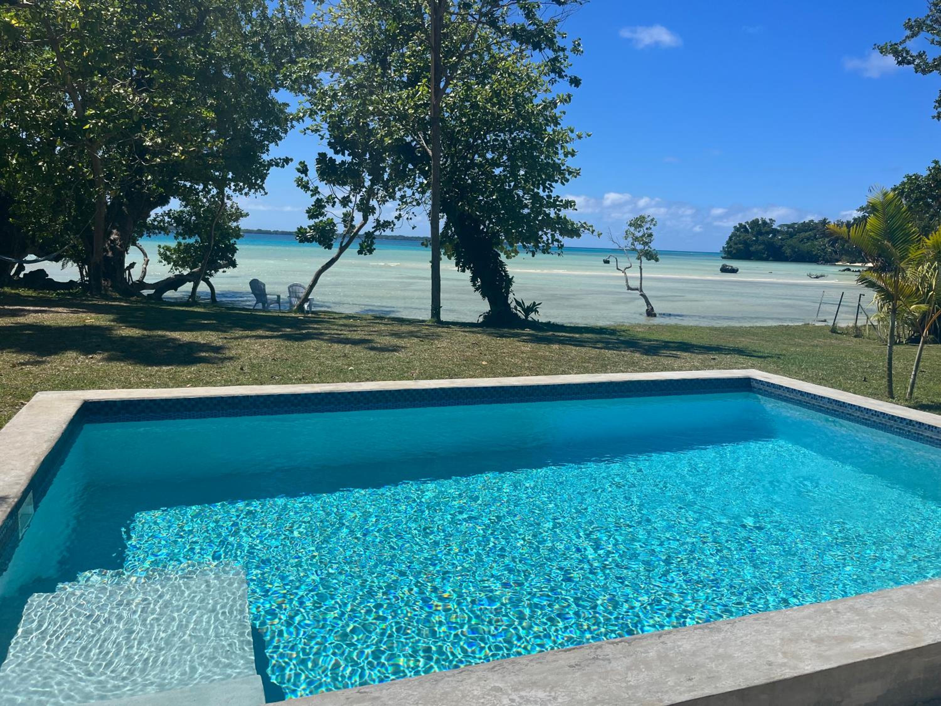 Indulge in the serene beauty of Luganville from the pool at Lope Lope Beach Bungalows. The stunning view is the perfect backdrop for relaxation and creating lasting memories.