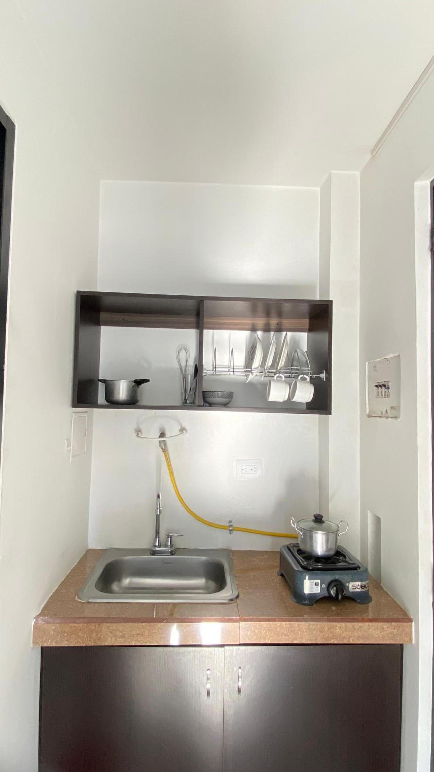 Bonito, iluminado, muy bien ubicado. Aseado. Tiene una cocina pequeñita, con lo básico.