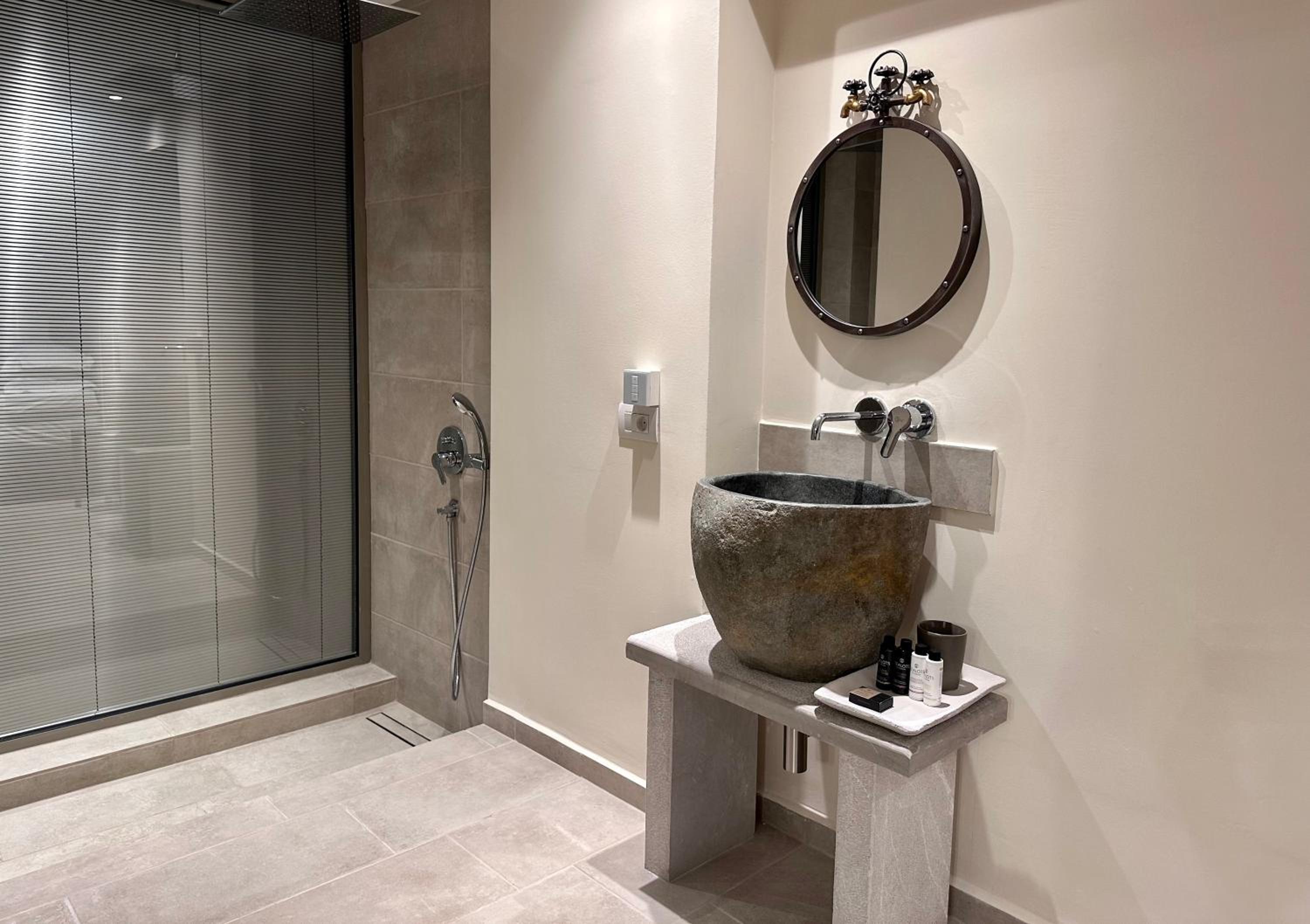 Inside, the suite was well-decorated and felt high quality, with thoughtful touches throughout. The bathroom, in particular, was excellent, probably one of the best we’ve come across in our stays in Greece. The bathroom products were also lovely (I even tried to find them in stores afterwards, but no luck!)