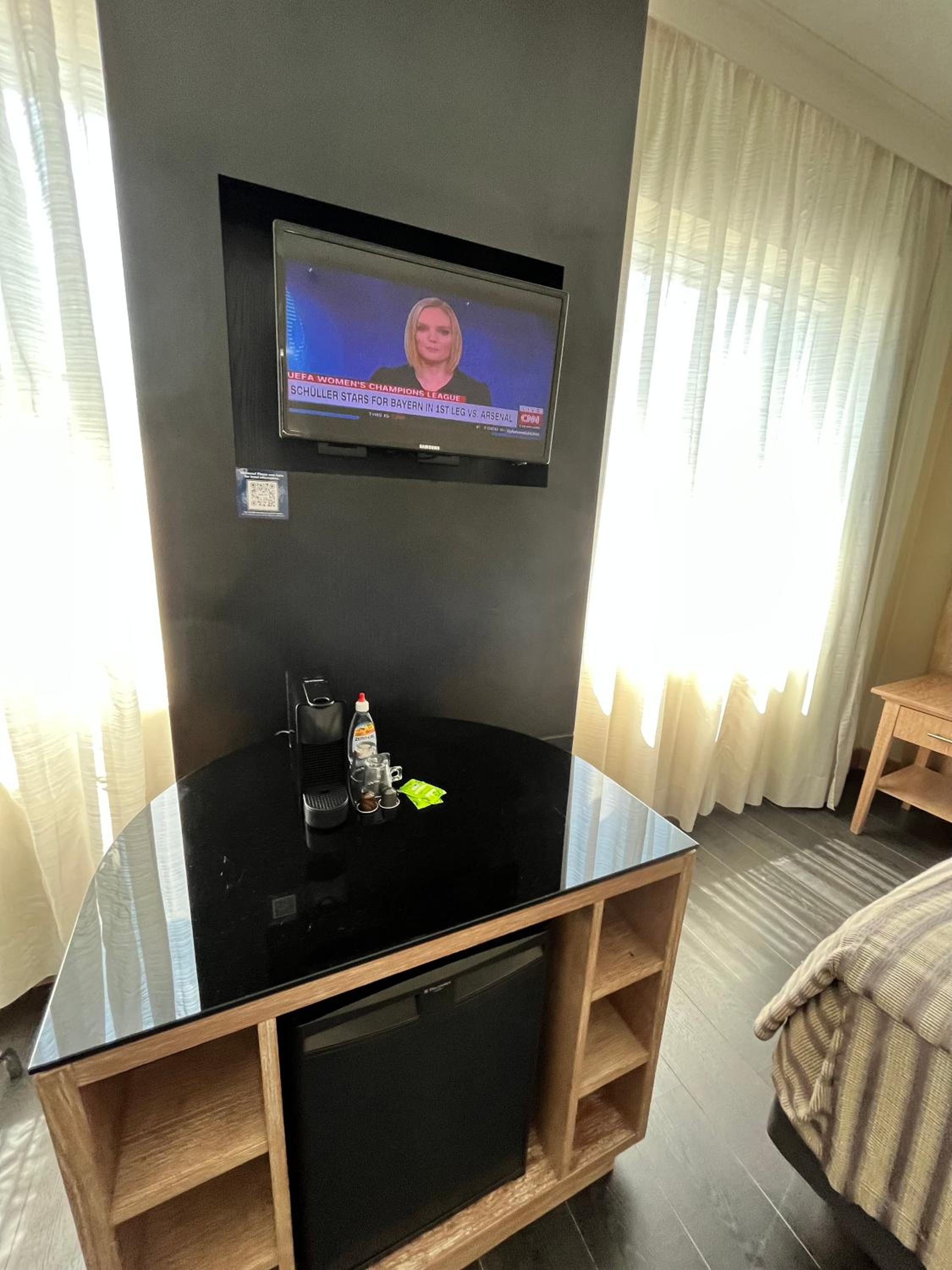 Reading lamp without bulb on one side, blanket too thin/not suficient, no socket on the bedside, very small TV, no water bottle in the room.