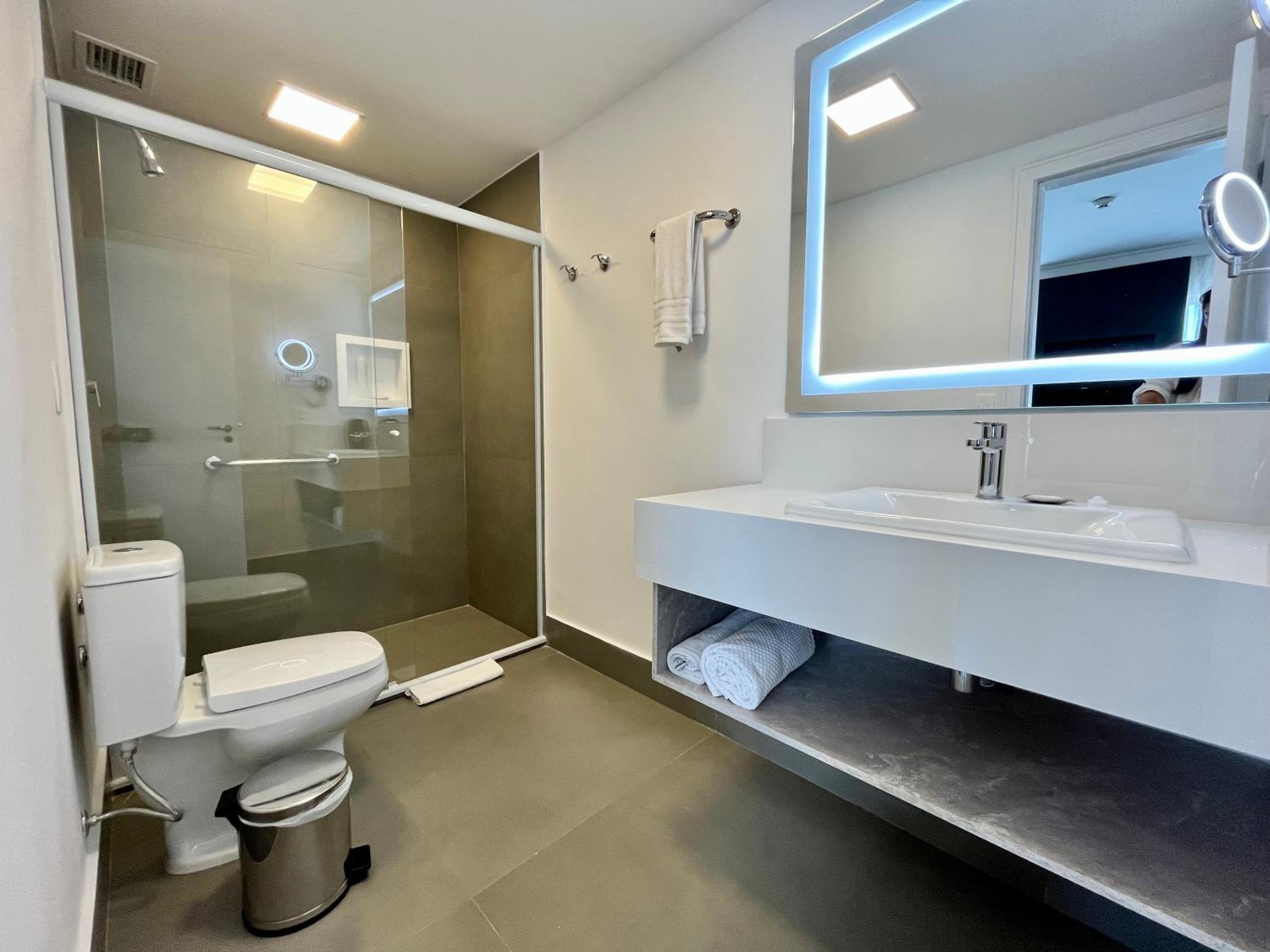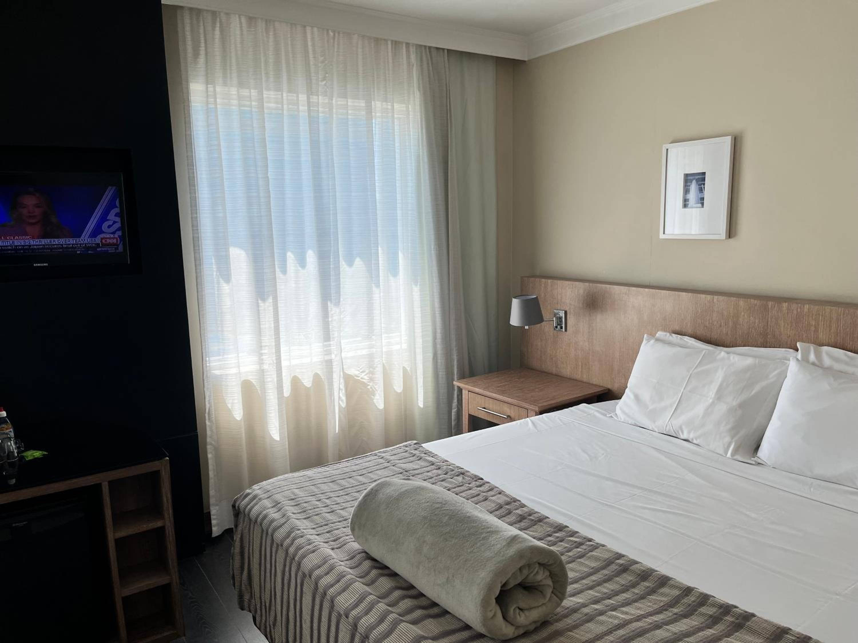 Os quartos nao tem acustica, escuta mto barulho dos corredores e vizinhos (ficamos no 17 andar). O cafe da manha, comprei a parte, 53$, achei que nao vale a pena, em outros hoteis é bem melhor a qualidade e variedade servida.o banheiro vaza agua pelo box, e molha tudo.