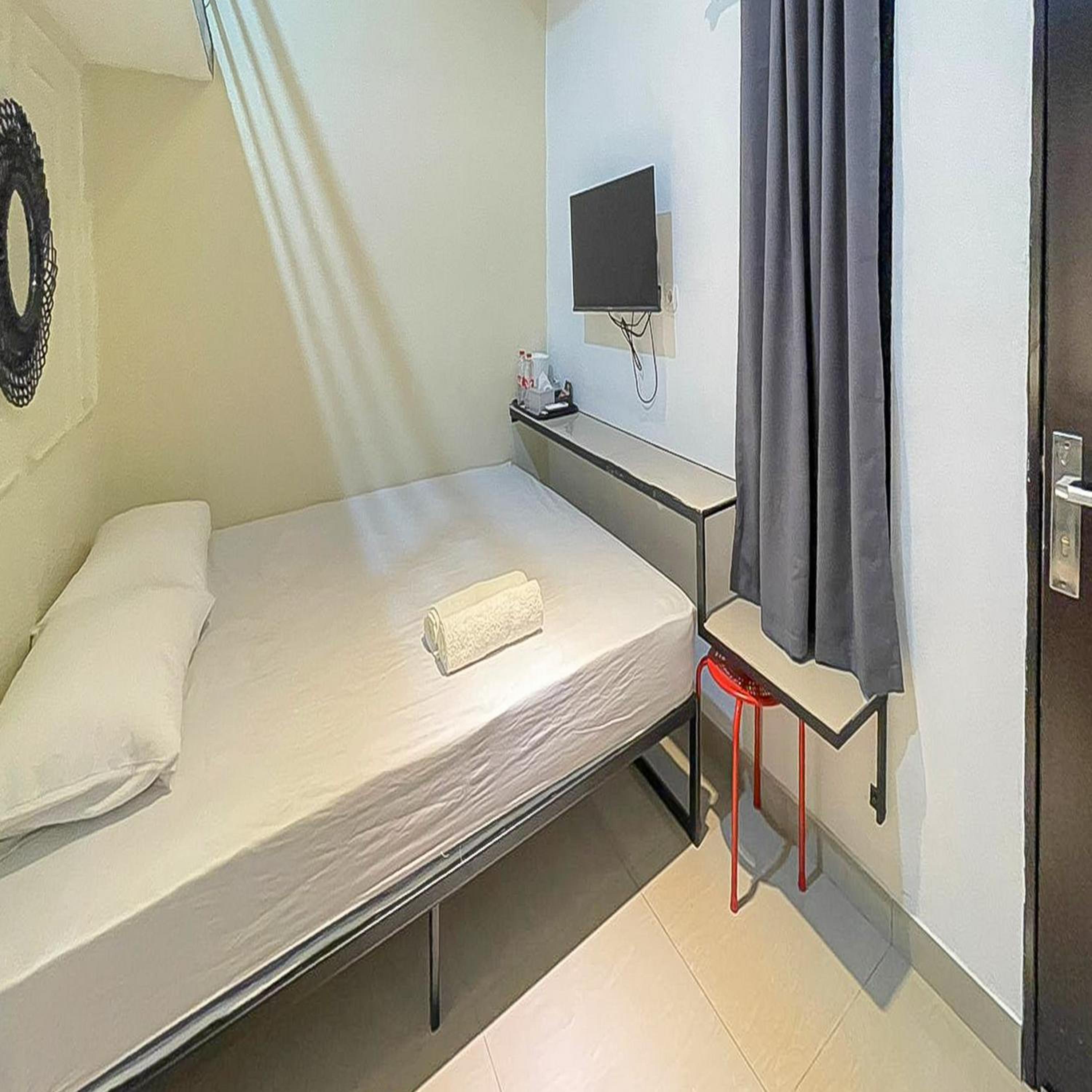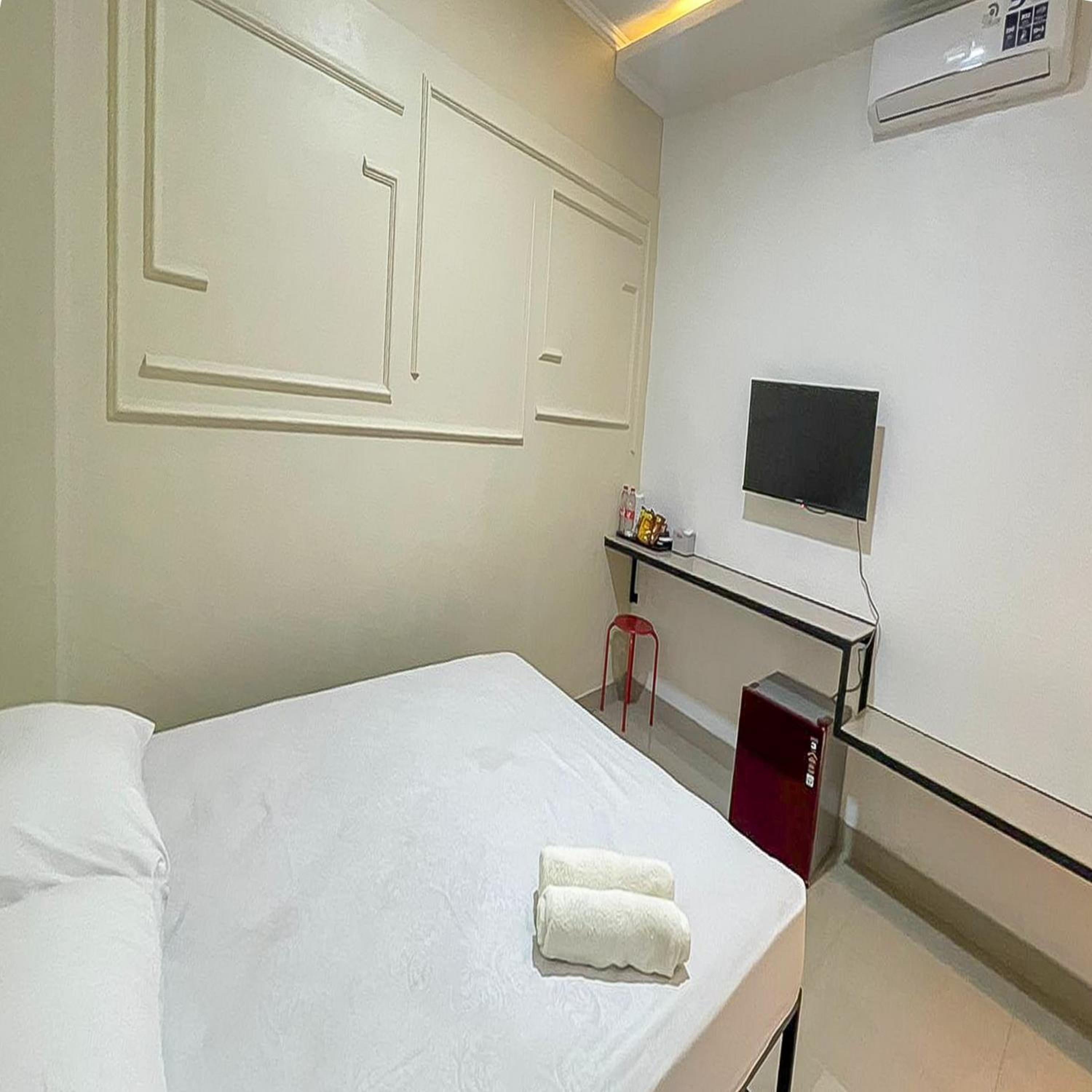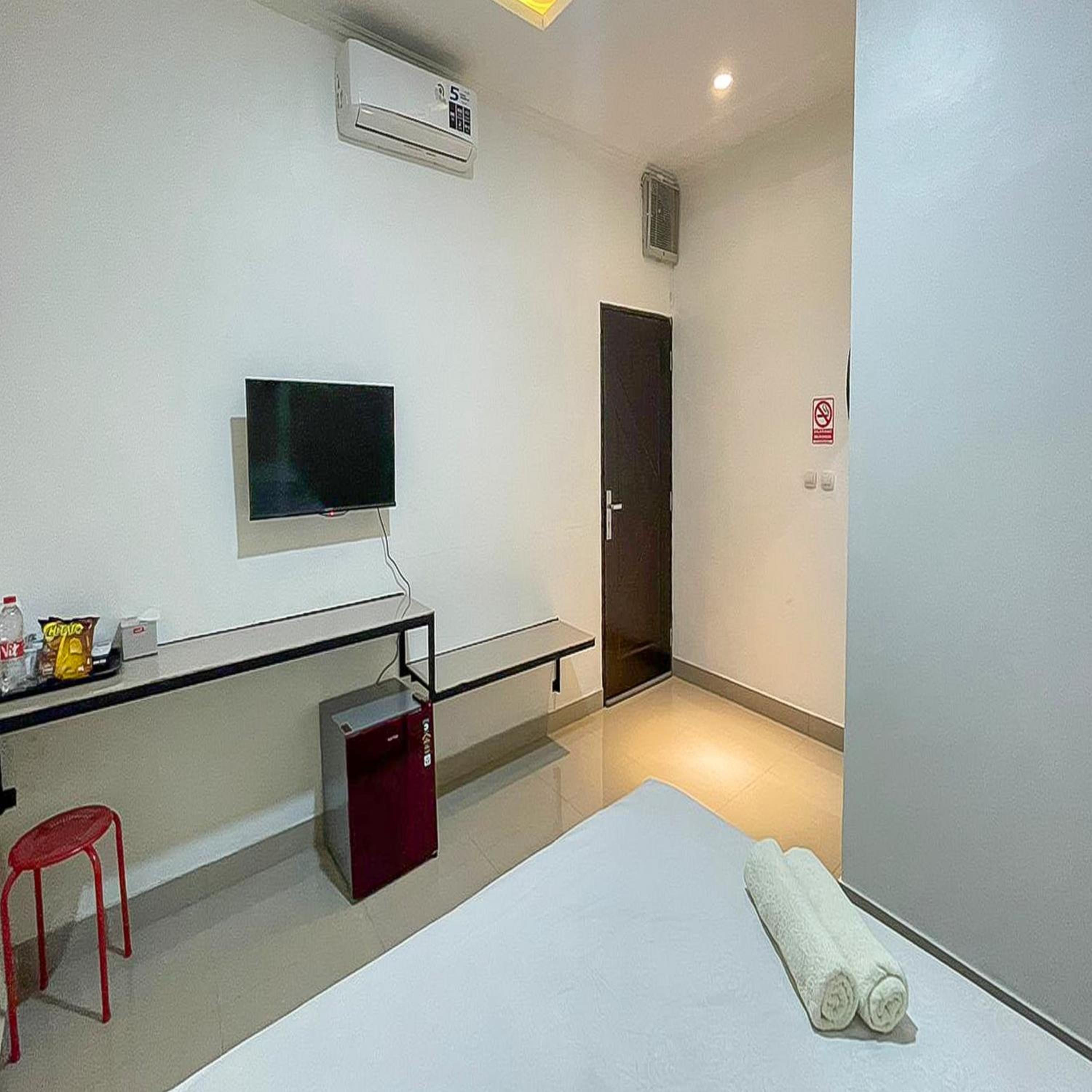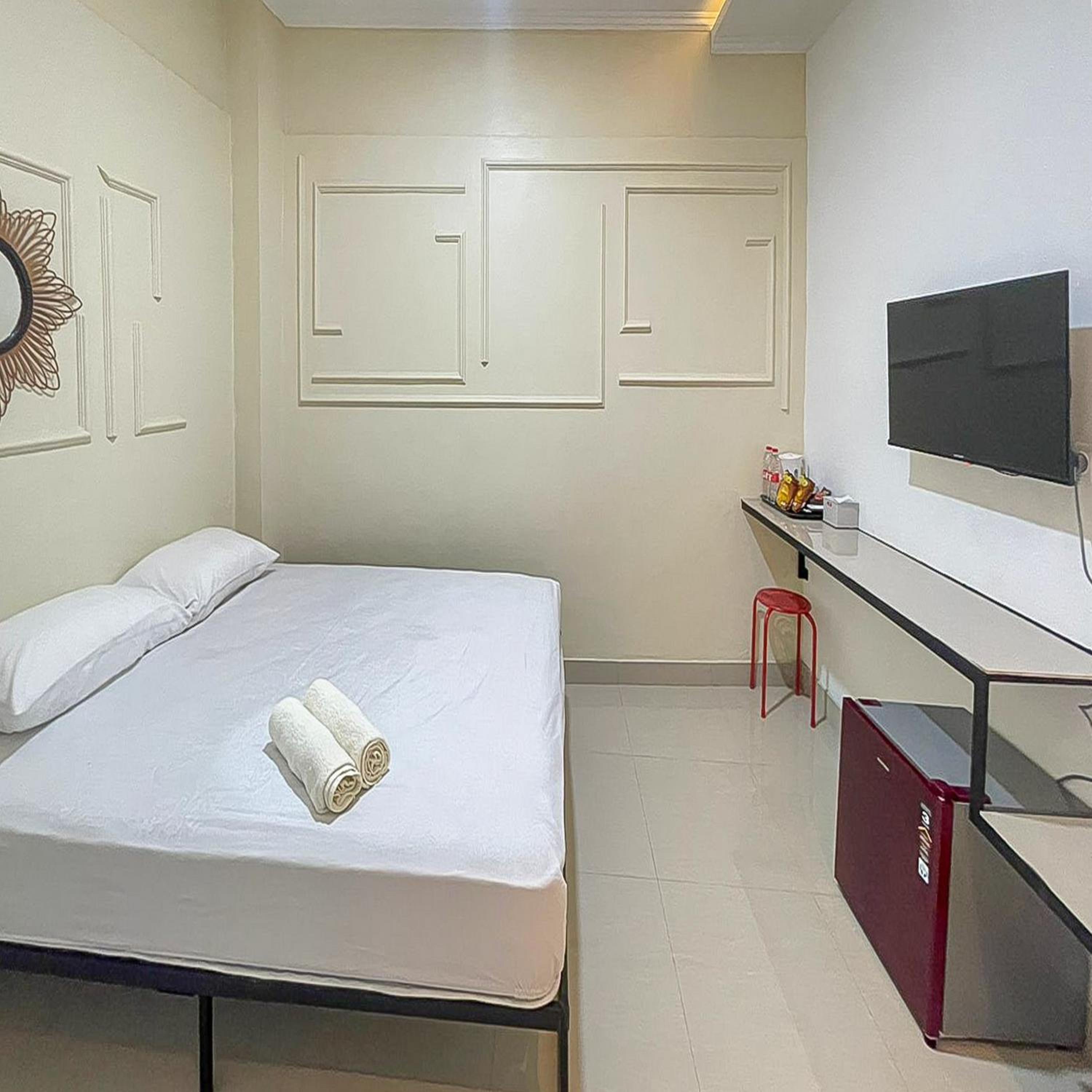 Each room at JM Tuparev Mitra RedDoorz is equipped with essential amenities such as a desk, flat-screen TV, and cozy bedding for a comfortable stay.