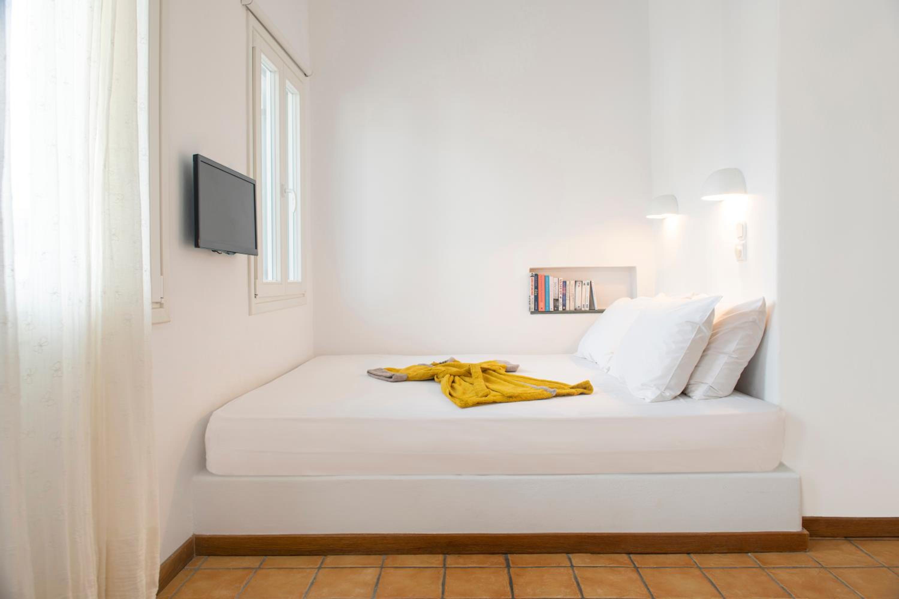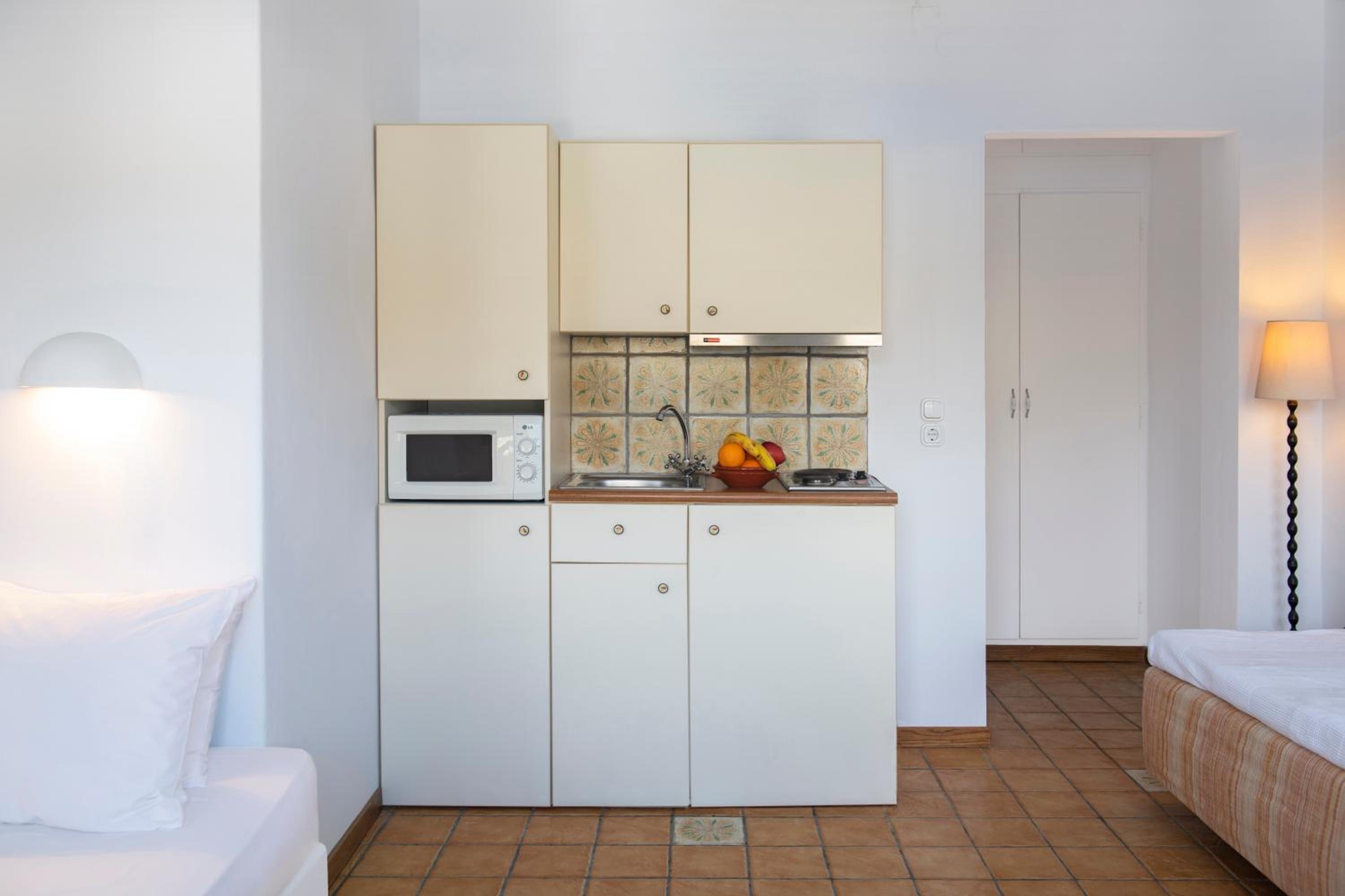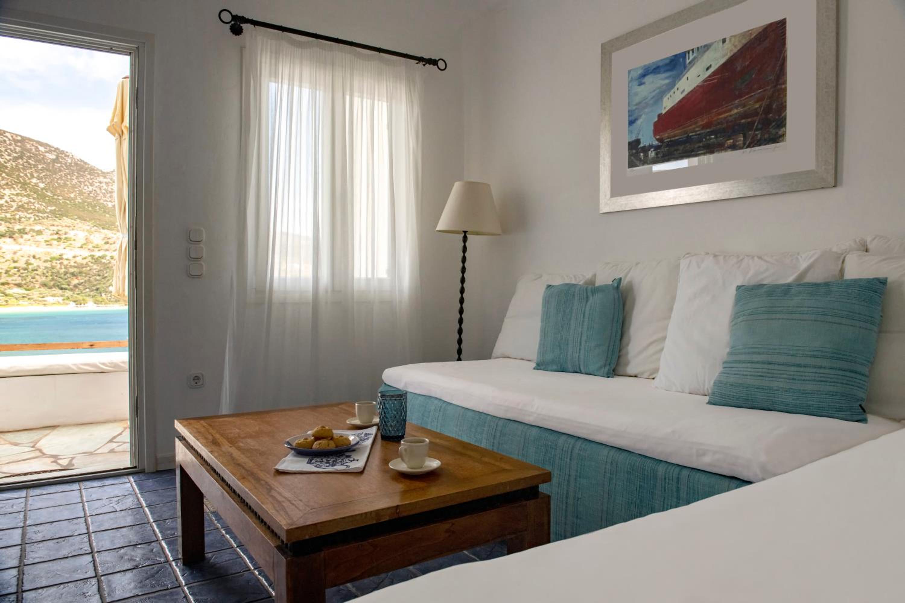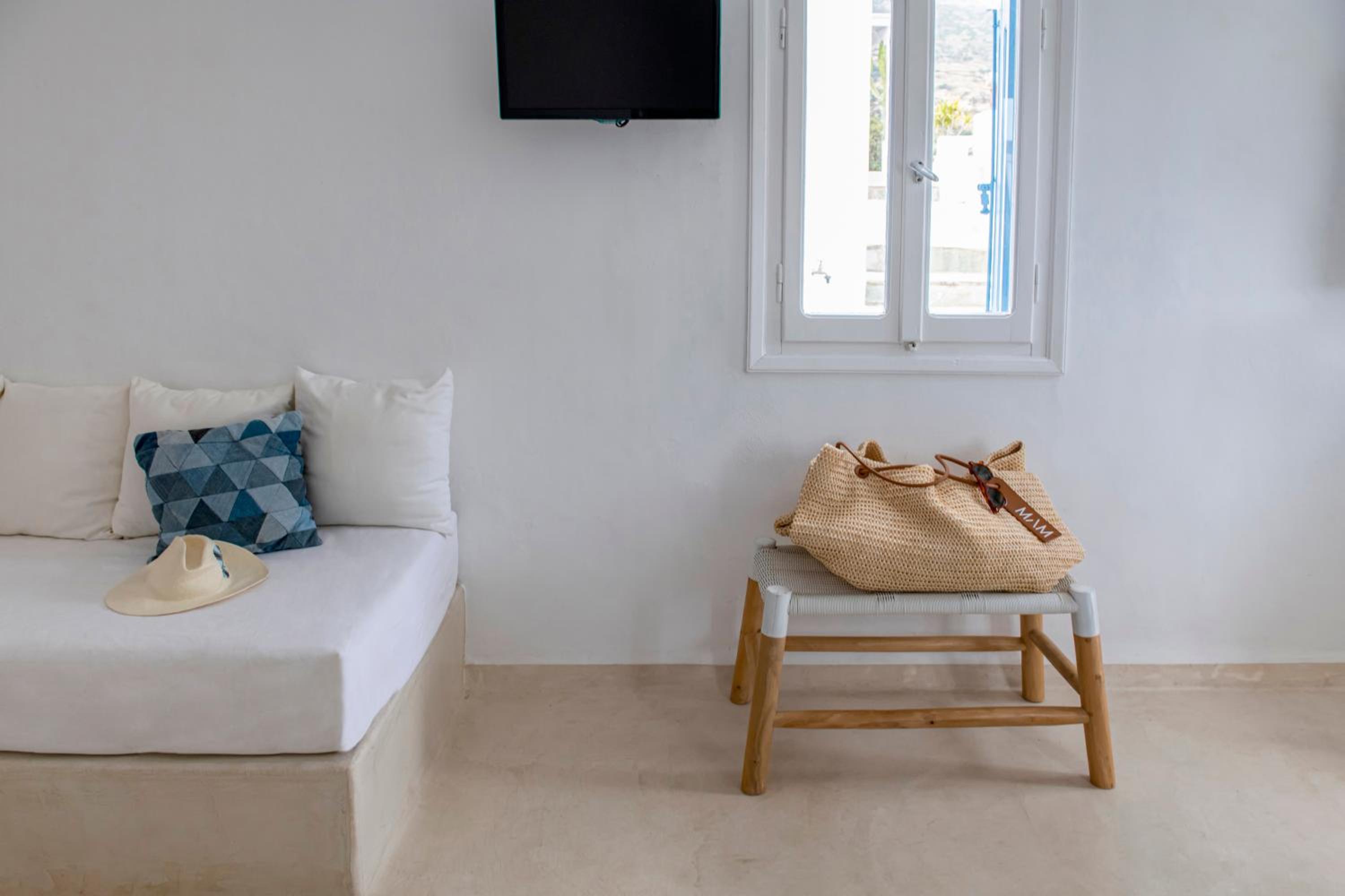 Basic room but very clean, with everything you need and a comfortable bed. The outside area and the view however are incredible!! Spent a wonderful 2 days relaxing in front of the crystal blue water. It's only a two minute walk to a couple of beachside taverns where you can eat delicious home cooked Greek food with your toes in the sand. Vathi feels very traditional and unspoilt.