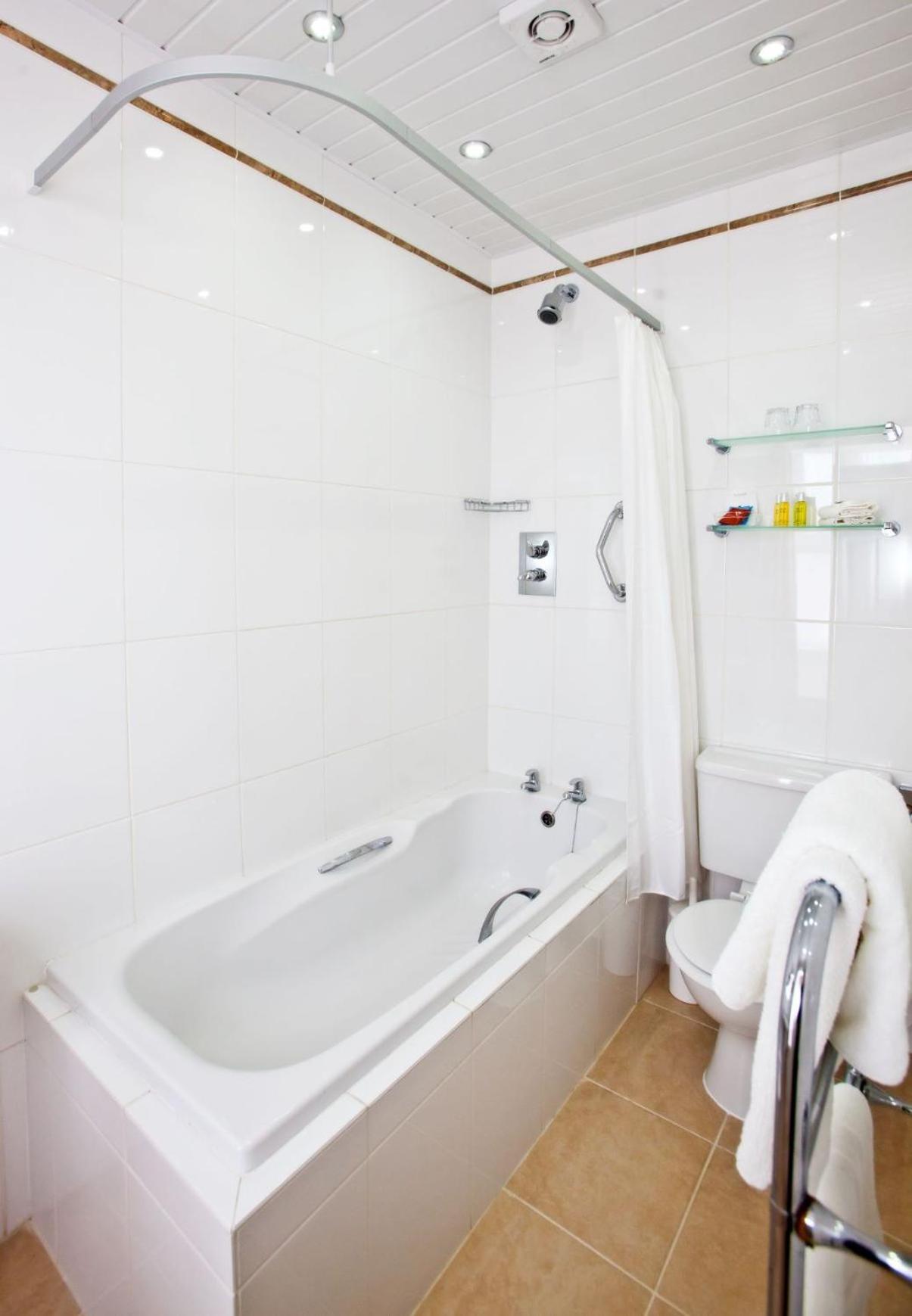 The shower over the bath was excellent (but the bath panel kept moving). The toiletries were welcome (but no hair conditioner). Every day we received new clean and fluffy towels (but very little space to house them in the bathroom).