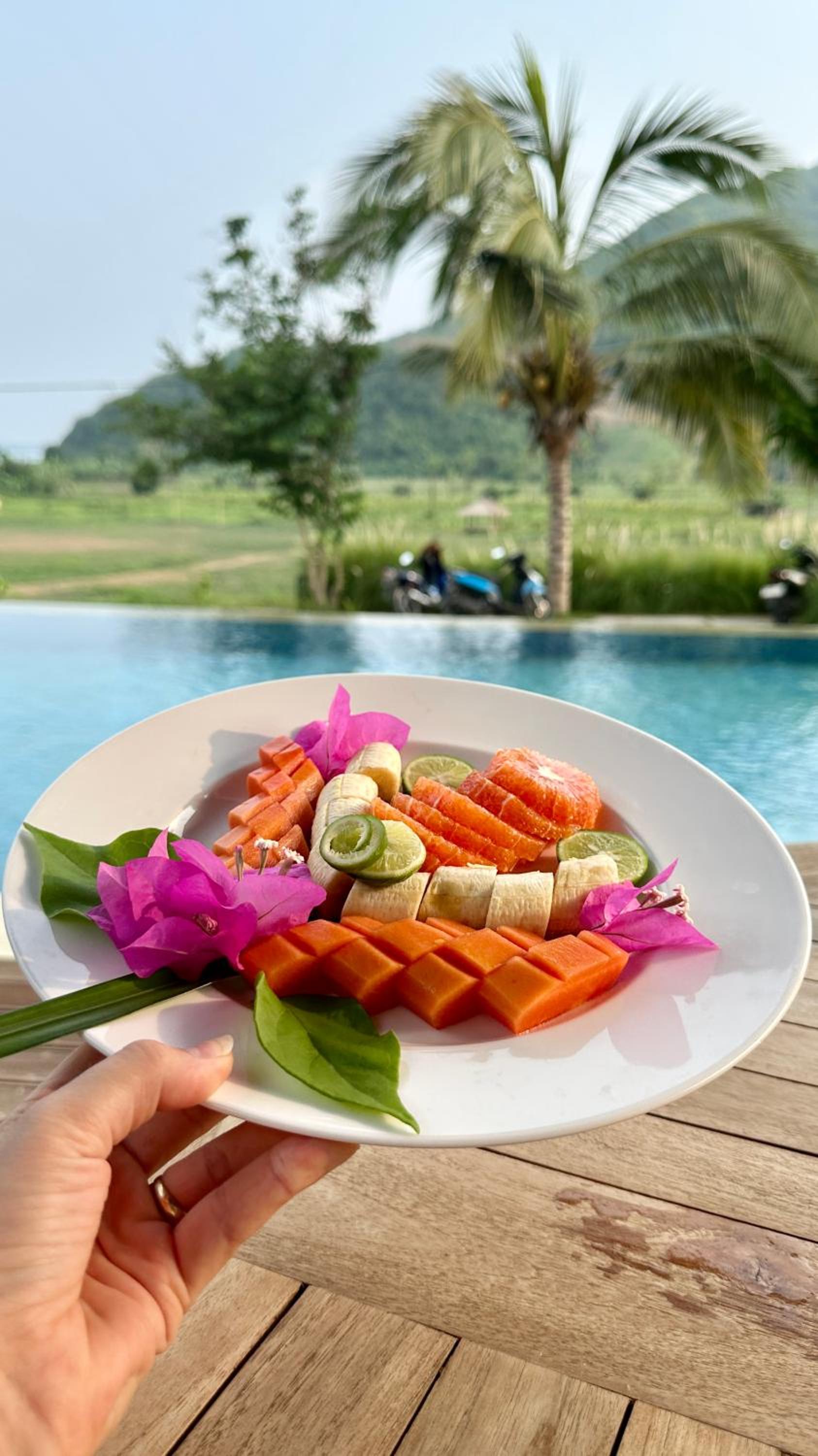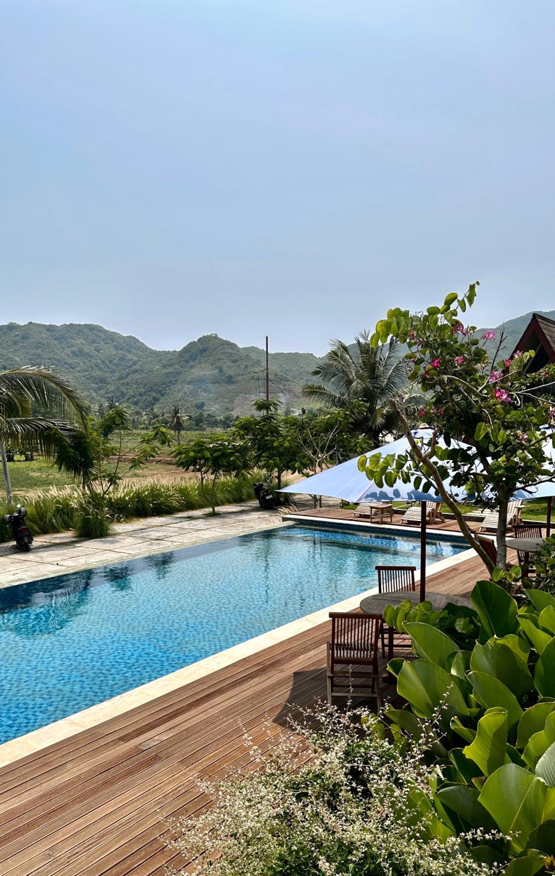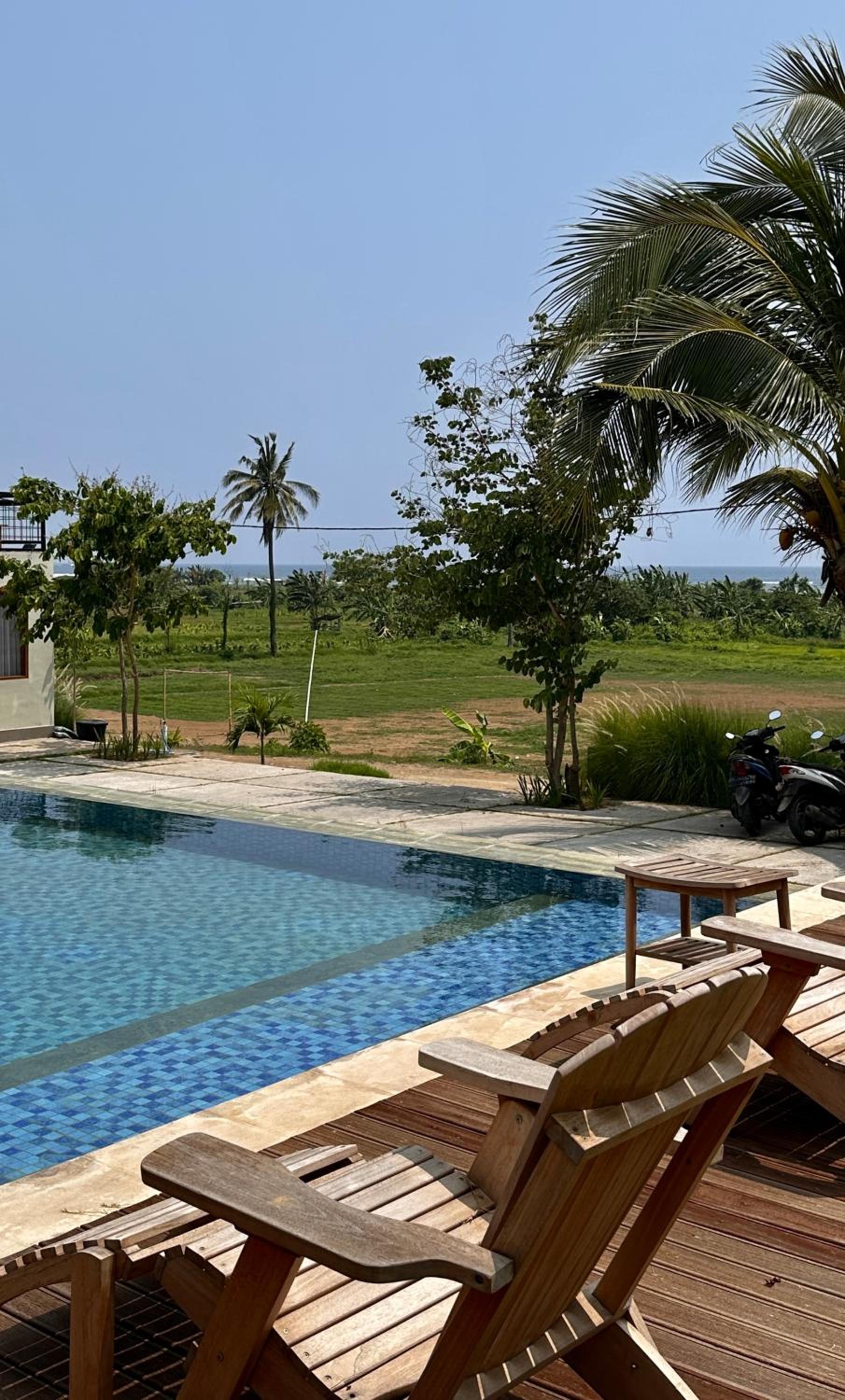 The view is very pleasing, on the foreground is the green agriculture and the background is the hill and the ocean, wonderful to wake up to this view. the pool shares the similar view and it's a rectangle shape that I can actually swim (very short) laps. Short walk to the surf spots. The beach and area is quiet which is nice.