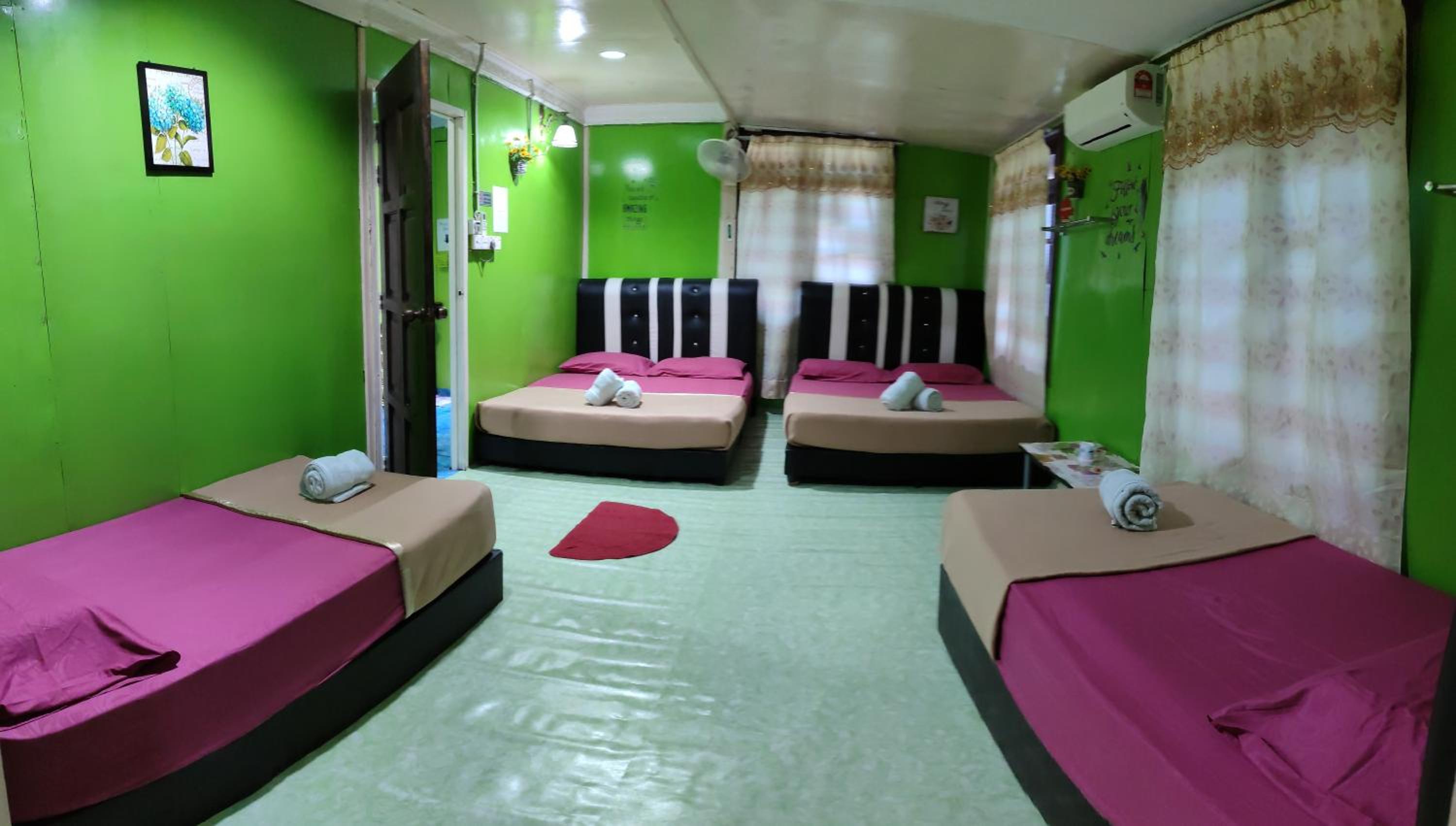 Logement simple mais très propre avec une climatisation efficace, complétée par un ventilateur. Nous avions la chambre 3 (6 couchages, nous étions 4) qui a la chance de ne pas être mitoyenne, ce qui limite les problèmes d'insonorisation. Literie des 2 lits doubles correcte (mais pas celle des 2 lits simples). Le fonctionnement de la salle de bain, usuel en Asie, où douche et WC sont mélangés surprend un peu au départ mais on s'y fait très vite. La zone commune (pantry) propose un peu de vaisselle, du thé et de quoi repasser. L'état d'esprit backpacker des guests rencontrés sur place était très sympa. Après avoir compris comment les infrastructures touristiques étaient implantées sur l'île (gros resorts à Long Beach et Coral Bay), on n'a pas regretté d'être au cœur du village de pêcheurs, avec une vraie vie locale (école, police, hôpital) et à 2 pas des petits restos très animés en soirée, juste avant la mosquée (superbe, on la croirait posée sur l'eau).