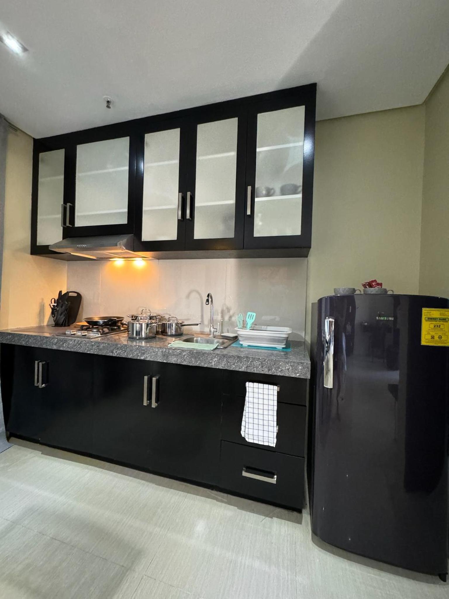Kitchen and the kitchen ware was awsome, the room was clean and tidy.