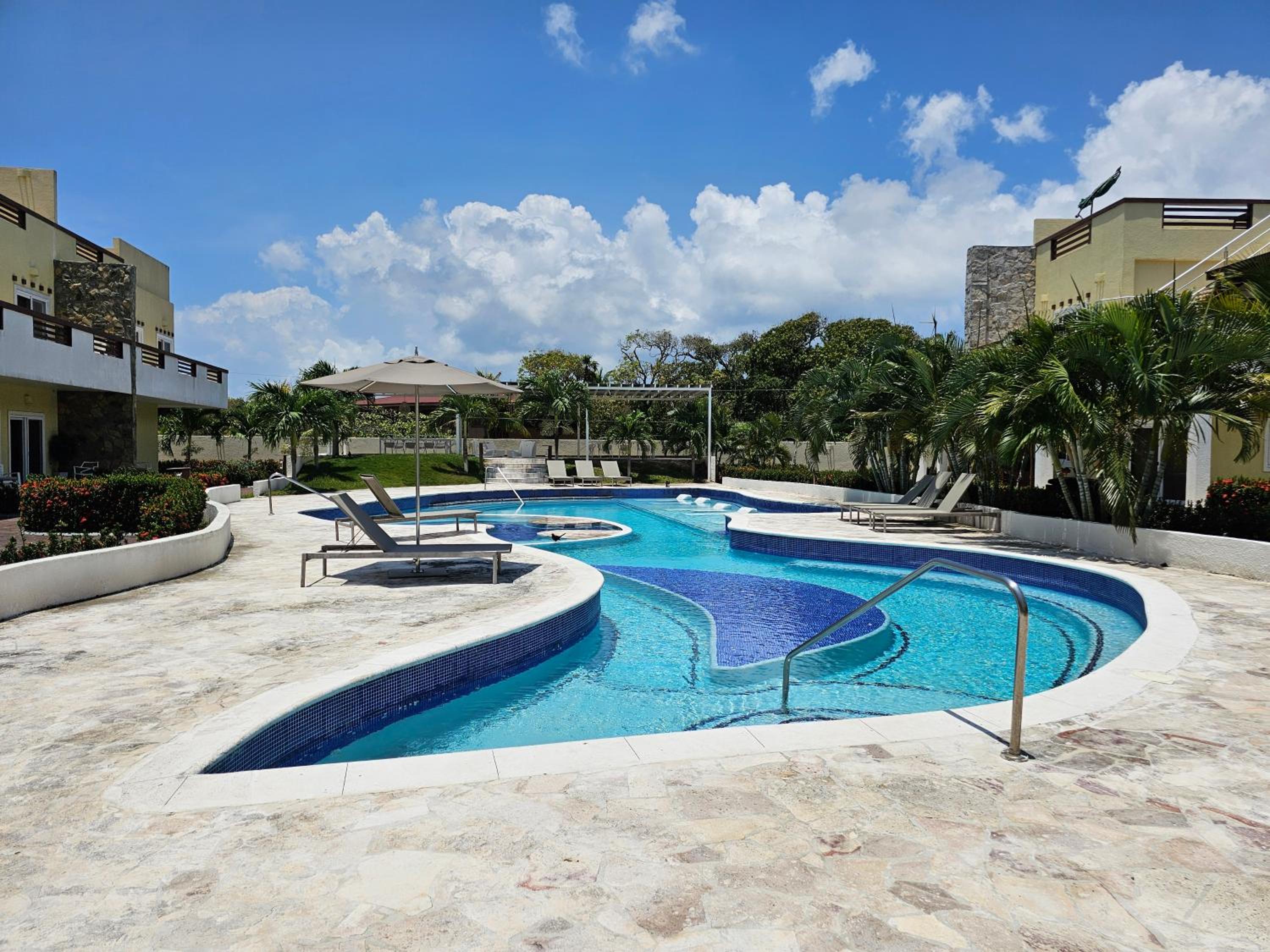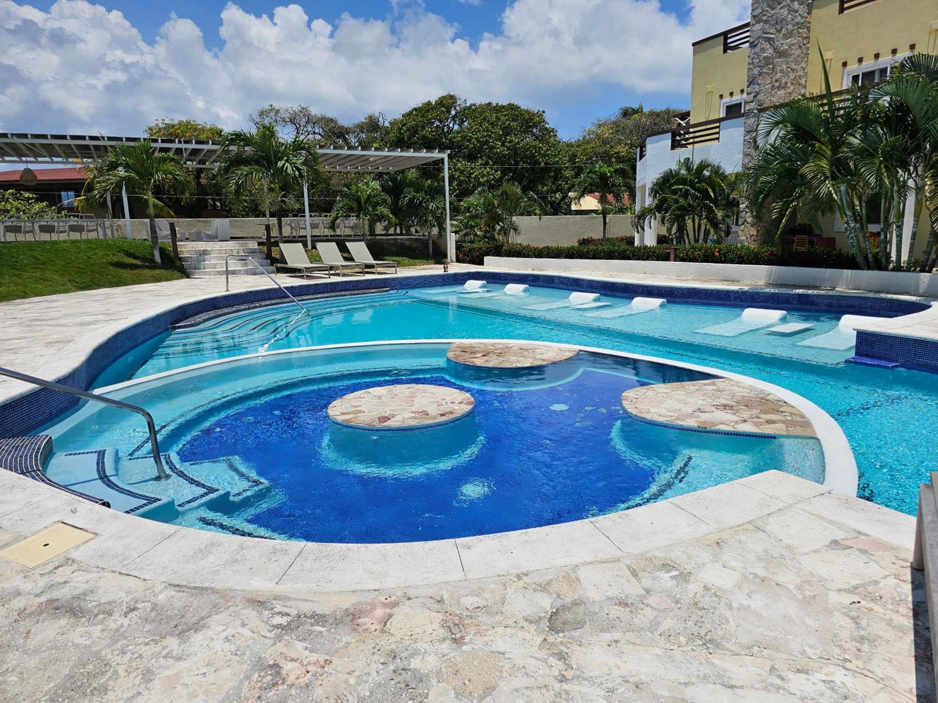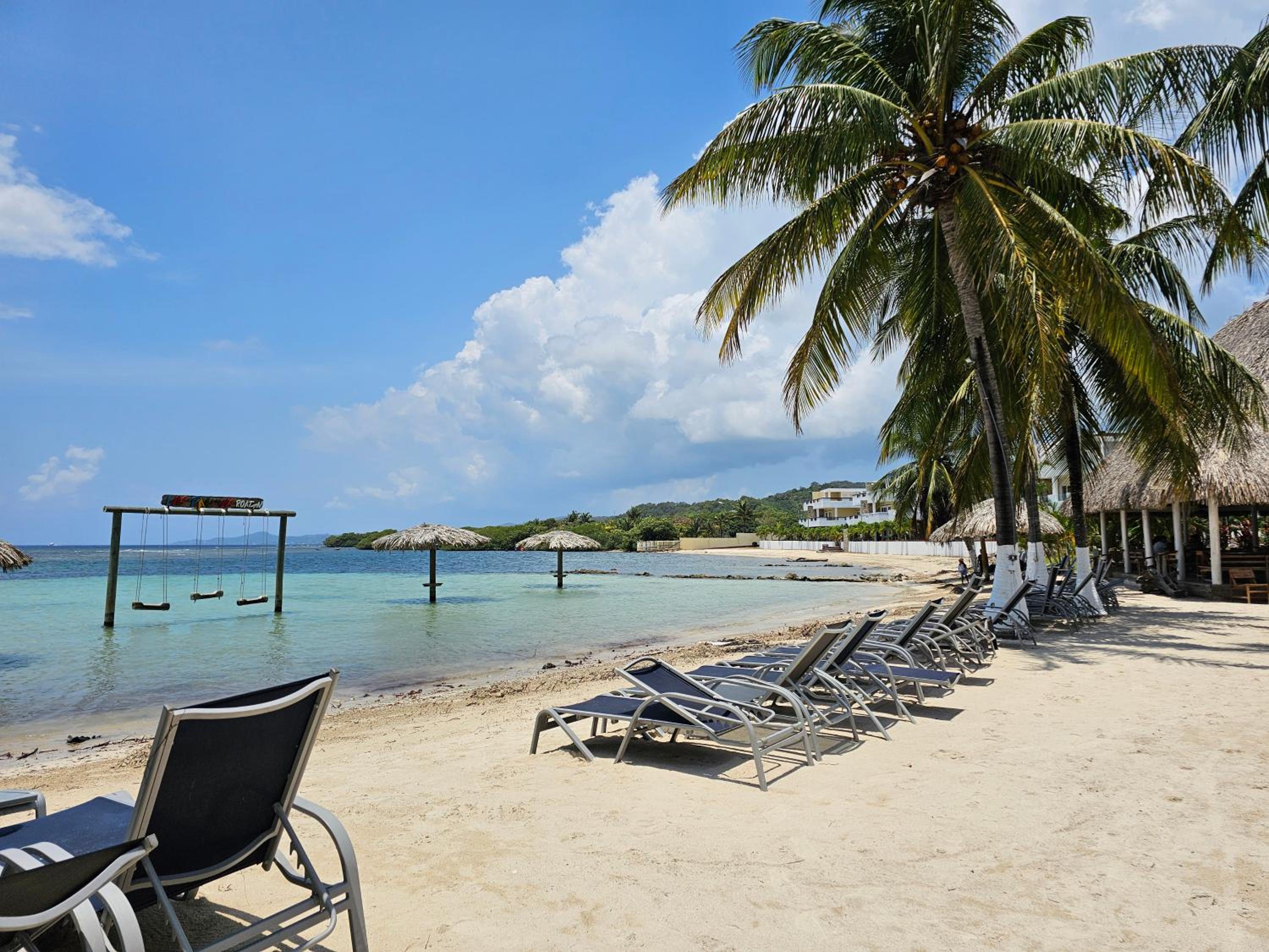 The huge pool was refreshing and very clean. We didn't have any issues with sand fleas or mosquitoes as we've had in the past at other Roatan hotels. Free pickup at the ferry and transportation to the airport was fabulous. Our driver showed up early and quickly got us to where we wanted to go. They give you a free gallon of water when you arrive since you can't drink the tap water in Honduras. There are two restaurants on site that have great menus and service. The property is between the ferry and airport and close to both of them for a short commute. This property seems to be more for residents as there seemed to be more older clientele there for longer stays. Property was nice, quiet and exactly what we needed for a short stay over.