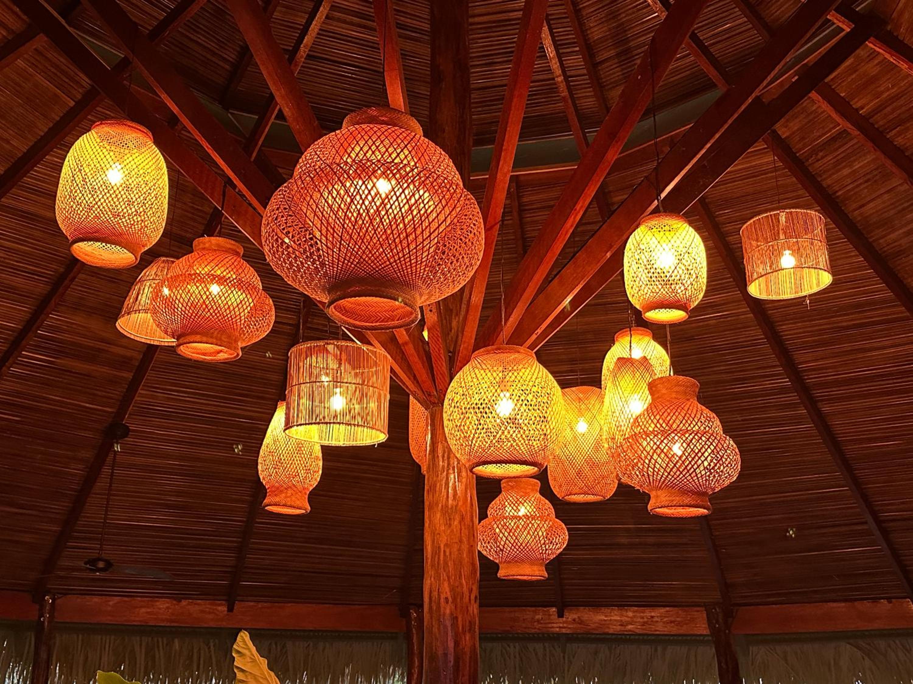 Sustainable Comfort: Relax in simply furnished bungalows perched atop wooden columns, each with a private balcony and hammock. Enjoy locally sourced amenities in the private bathrooms.