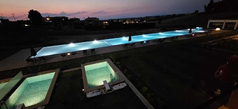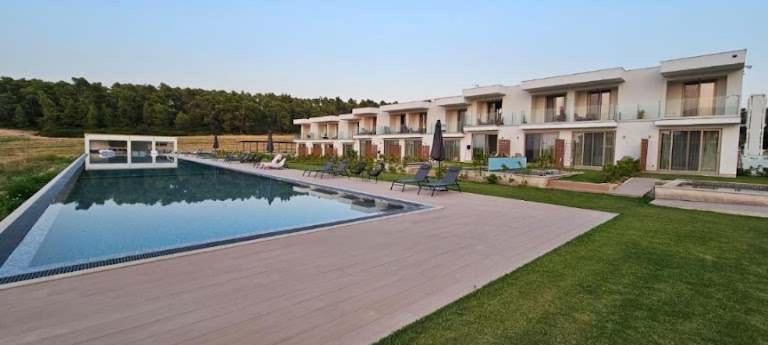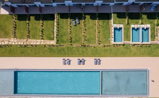 Experience the ultimate relaxation at Oikos Sani Suites with stunning pool views from your own private balcony. Enjoy the serene atmosphere just 2.5 km away from the beautiful Sani Dunes Beach.