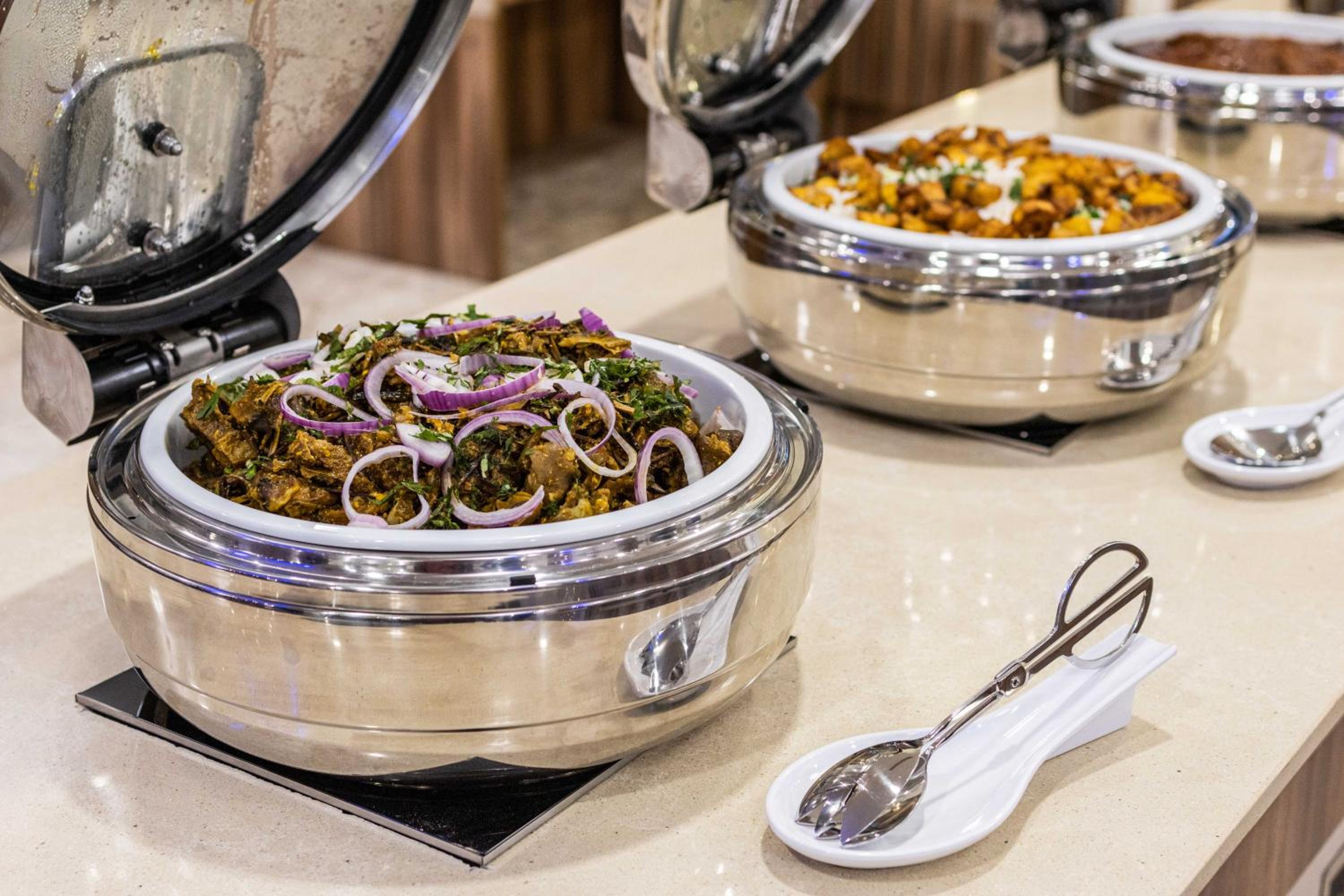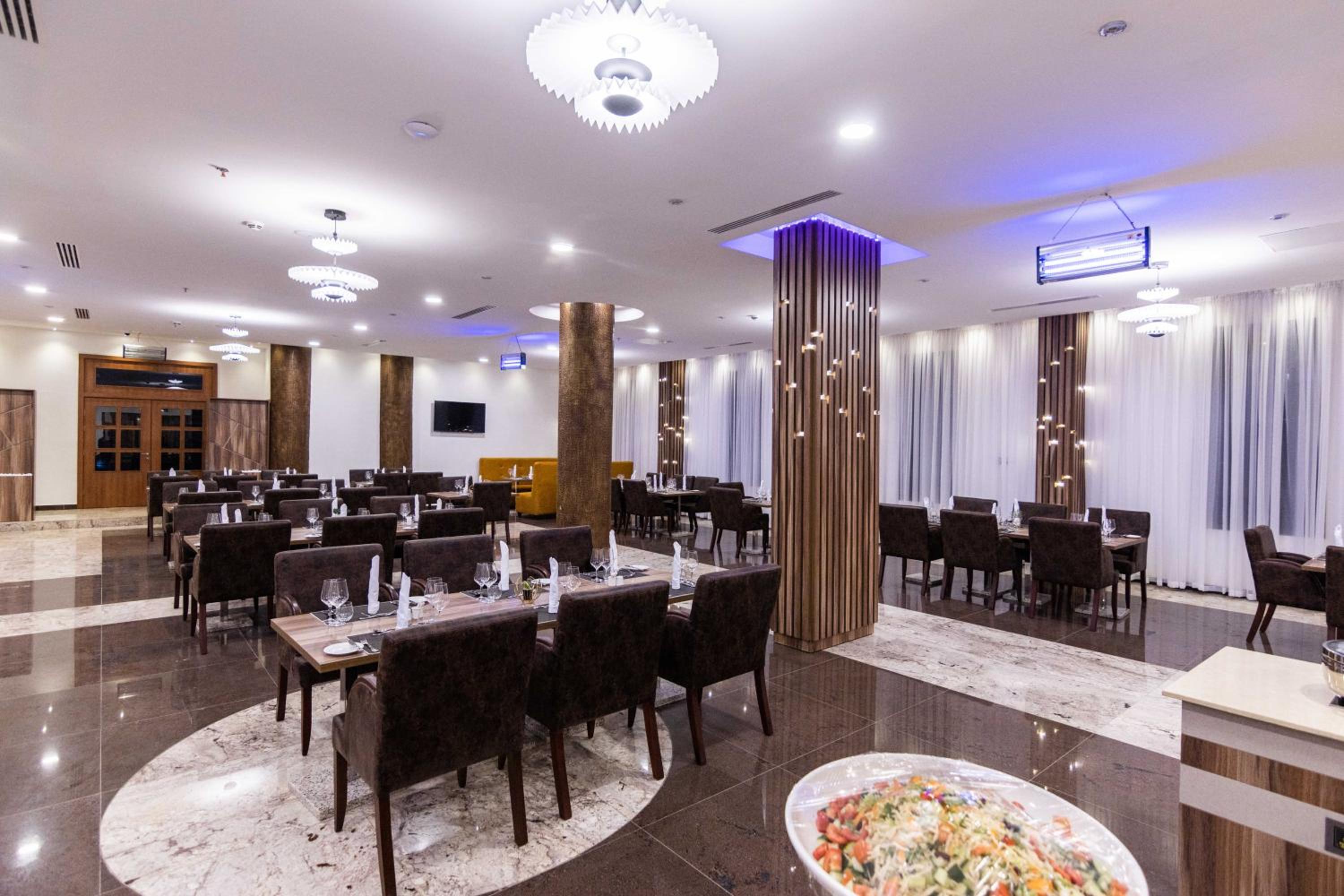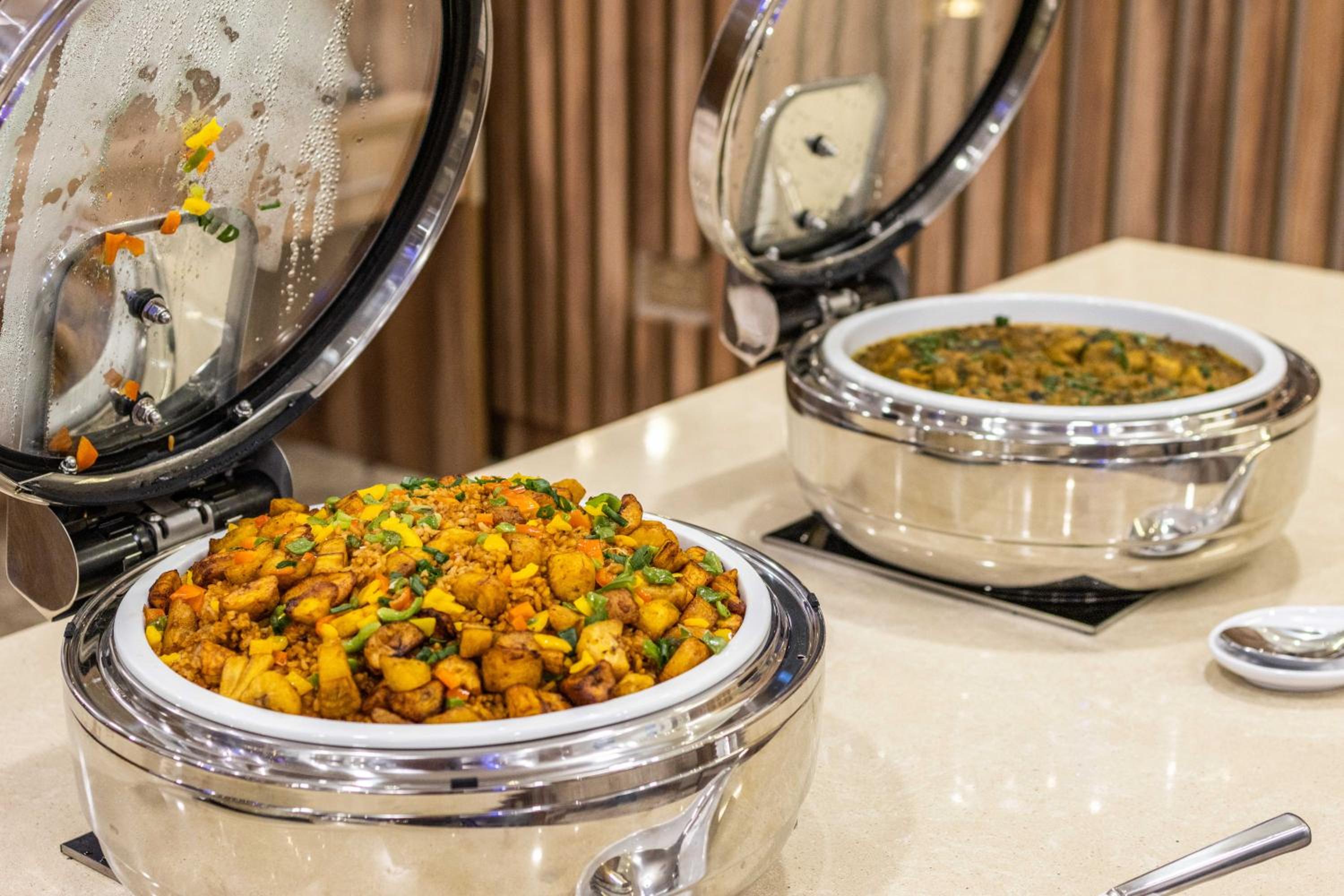 Guests can enjoy a delicious breakfast buffet with various options and dine at the on-site restaurant offering a diverse selection of African, local, and international cuisine.