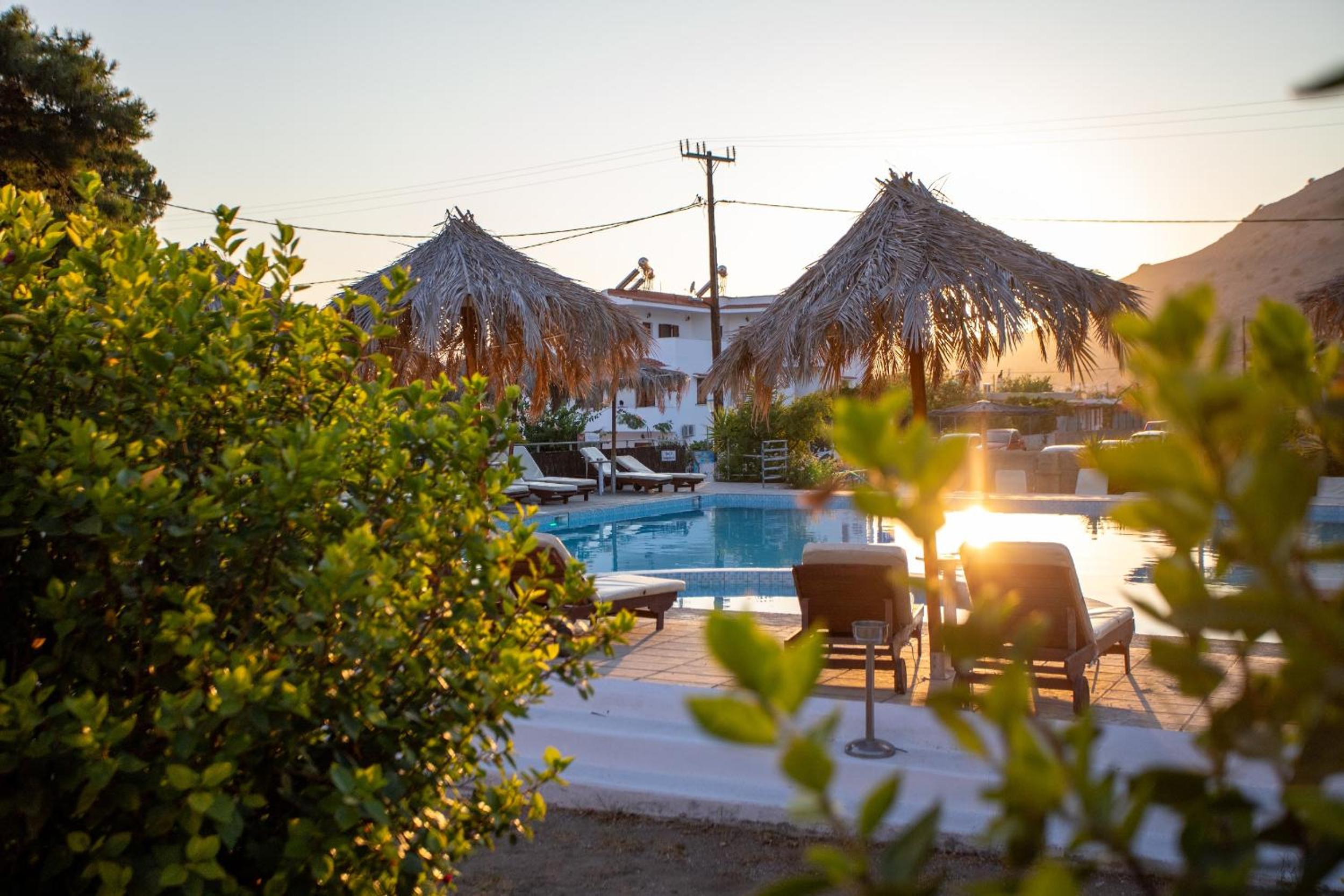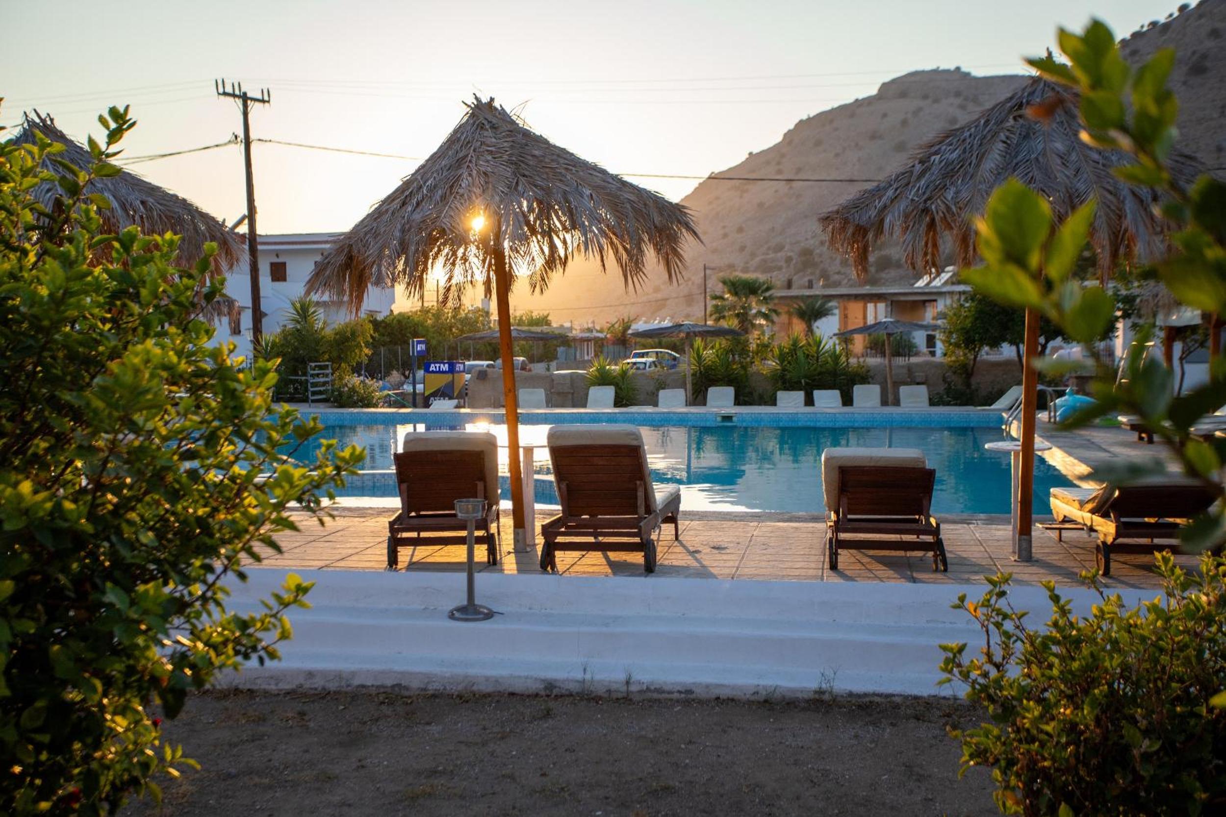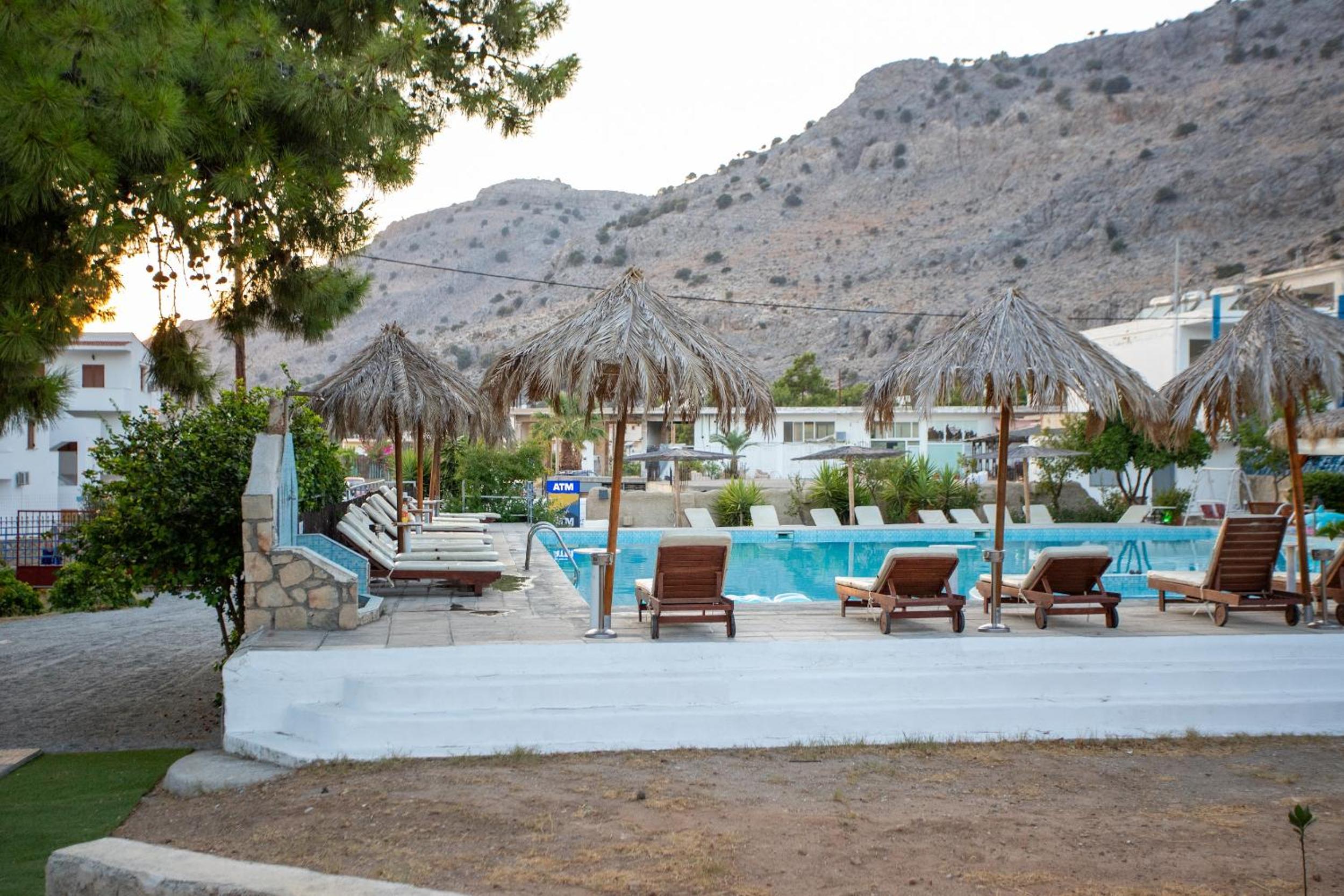 Las instalaciones de la piscina y el espacio de la habitación y el baño. Buena ubicación en Pefkos. Parking privado.