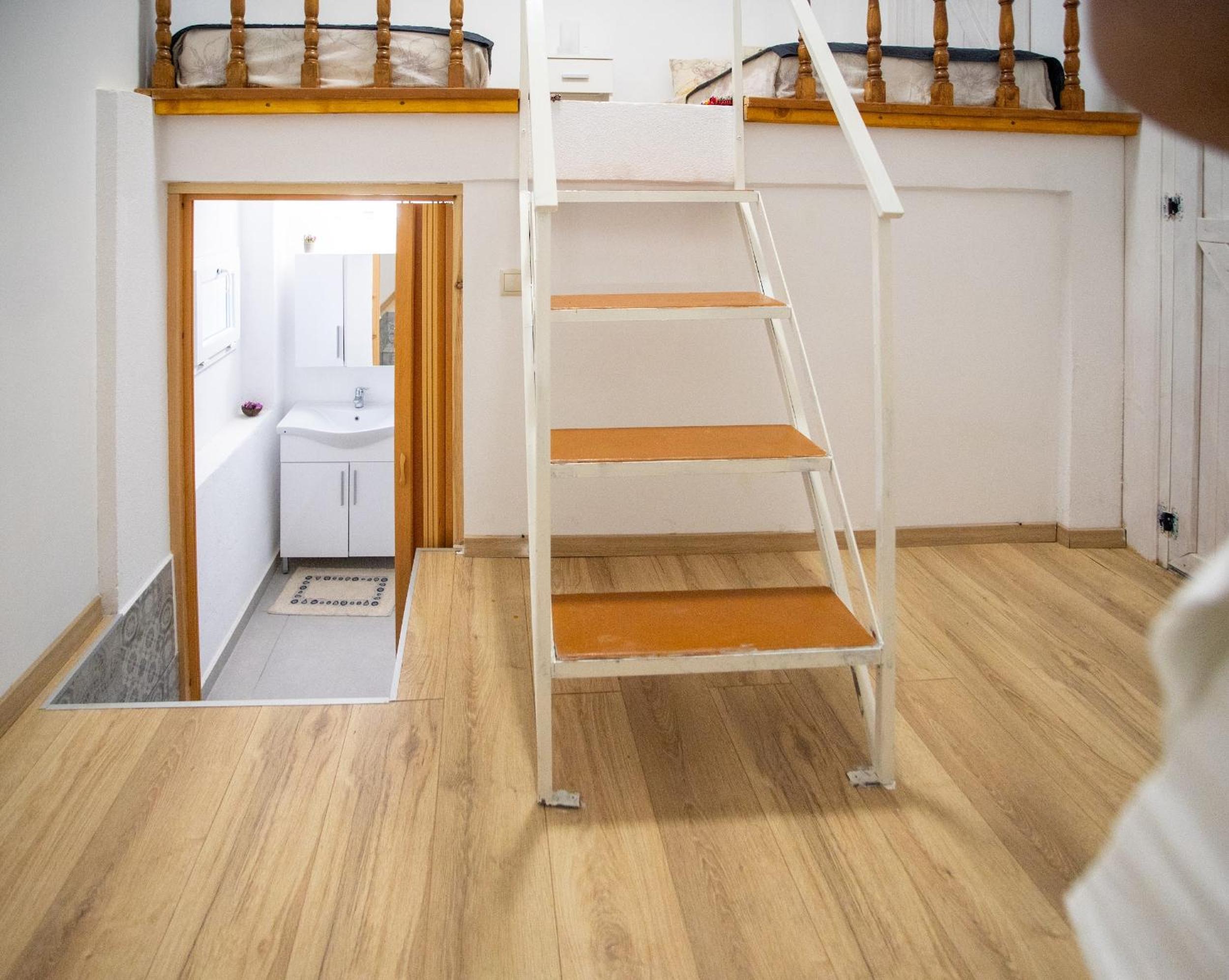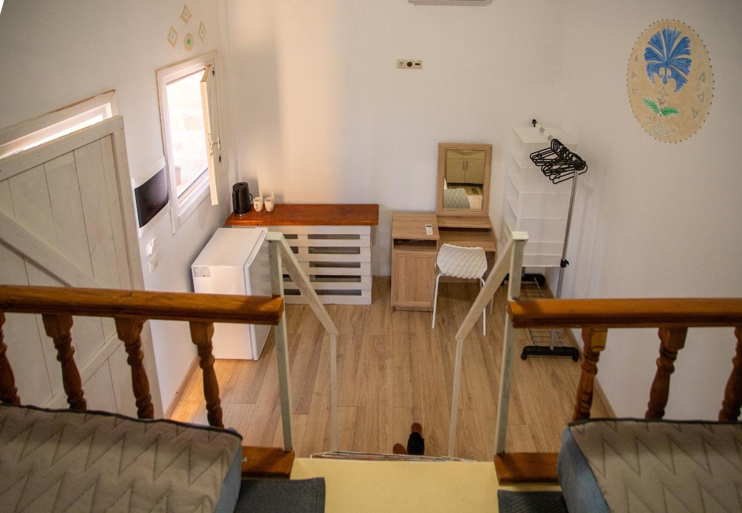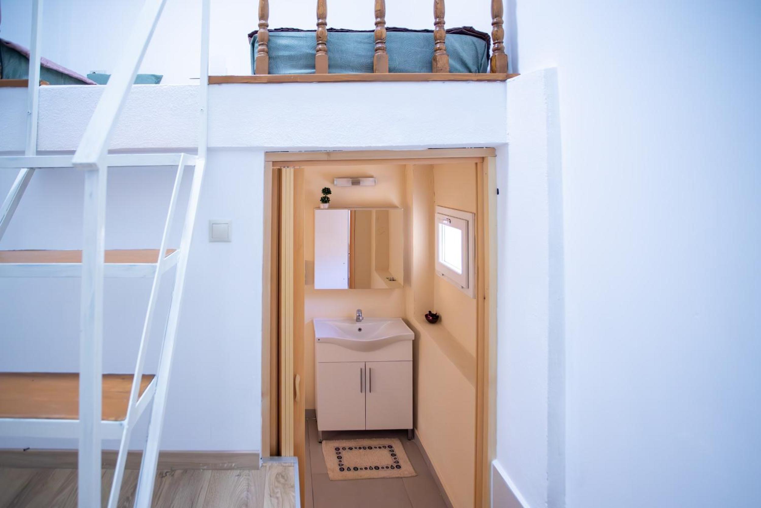 Lay out was dangerous steep stairs to the sleeping area steps down to the shower had a deep drop no cutlery not even a spoon no crockery apart from 2 cups and 2 glasses