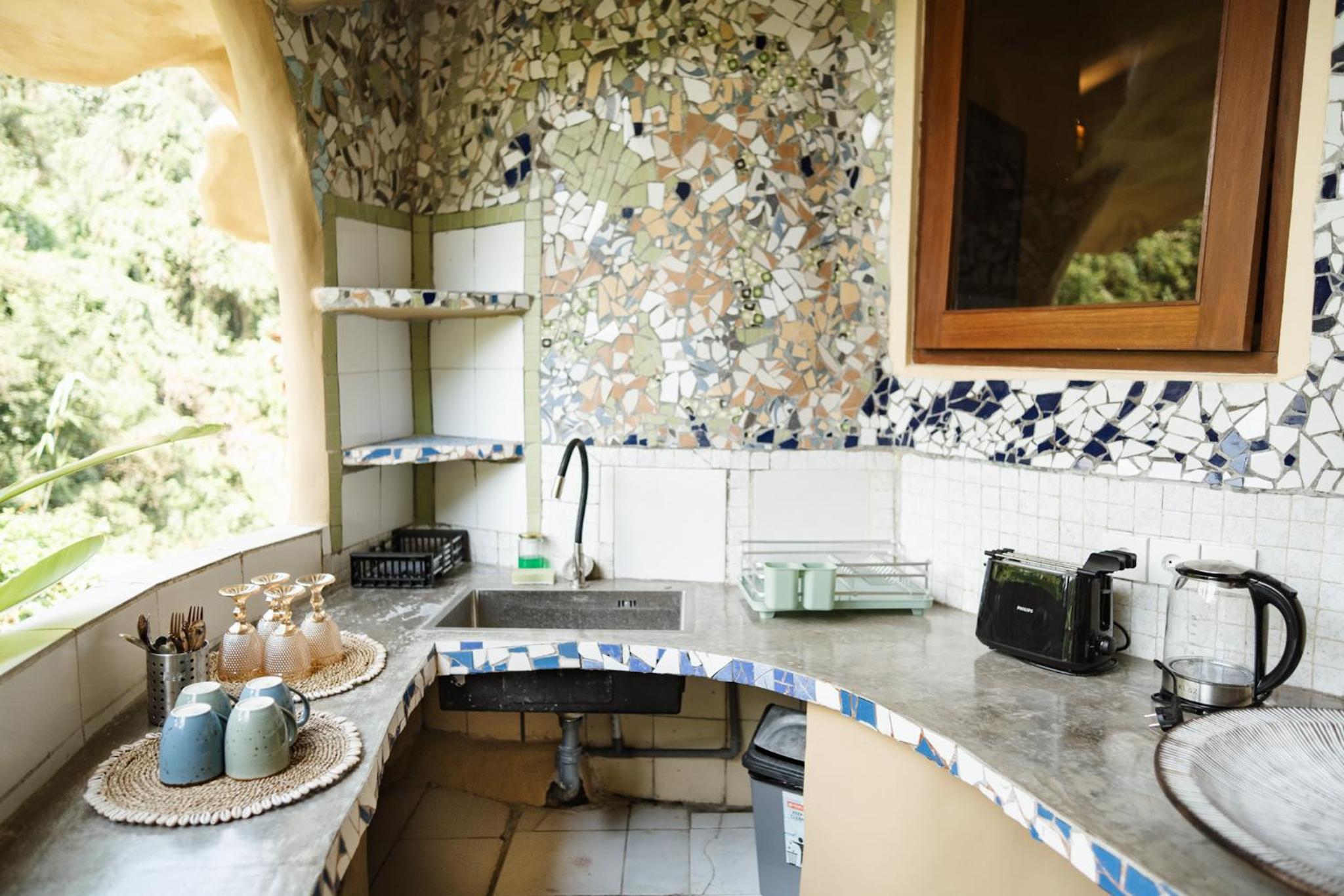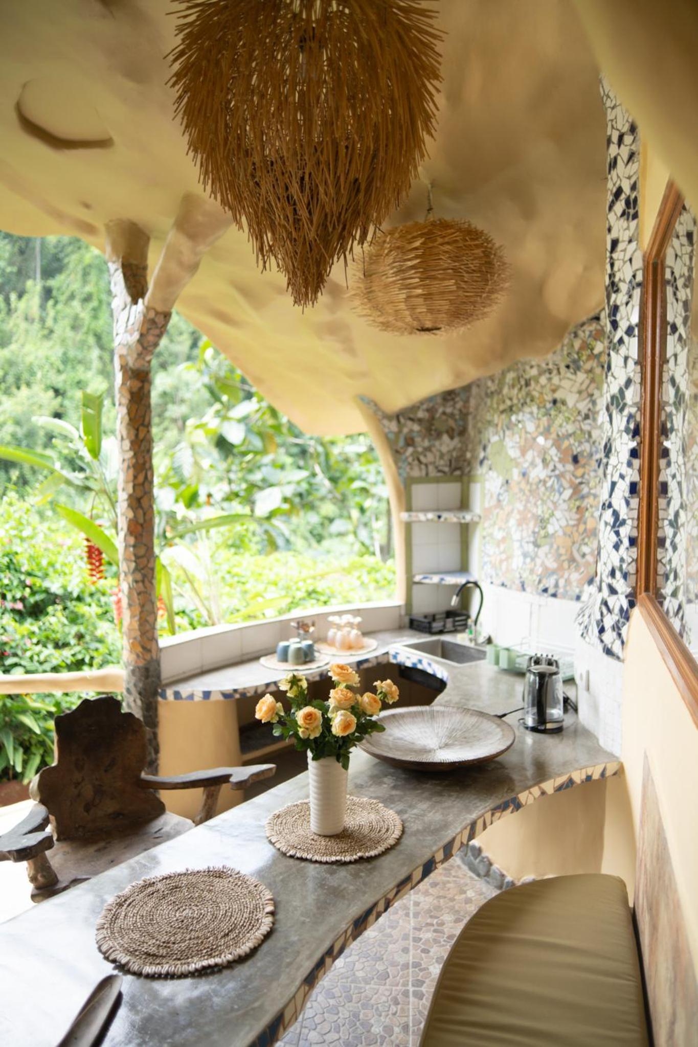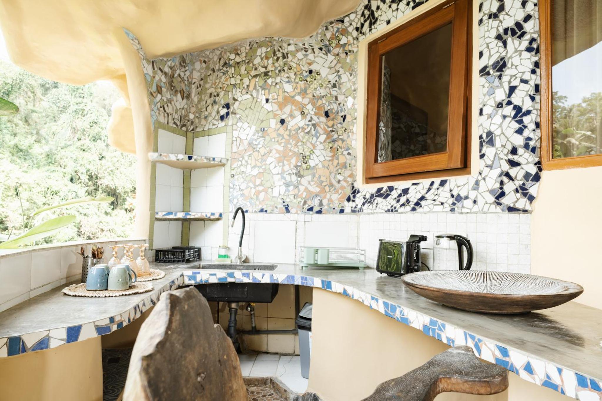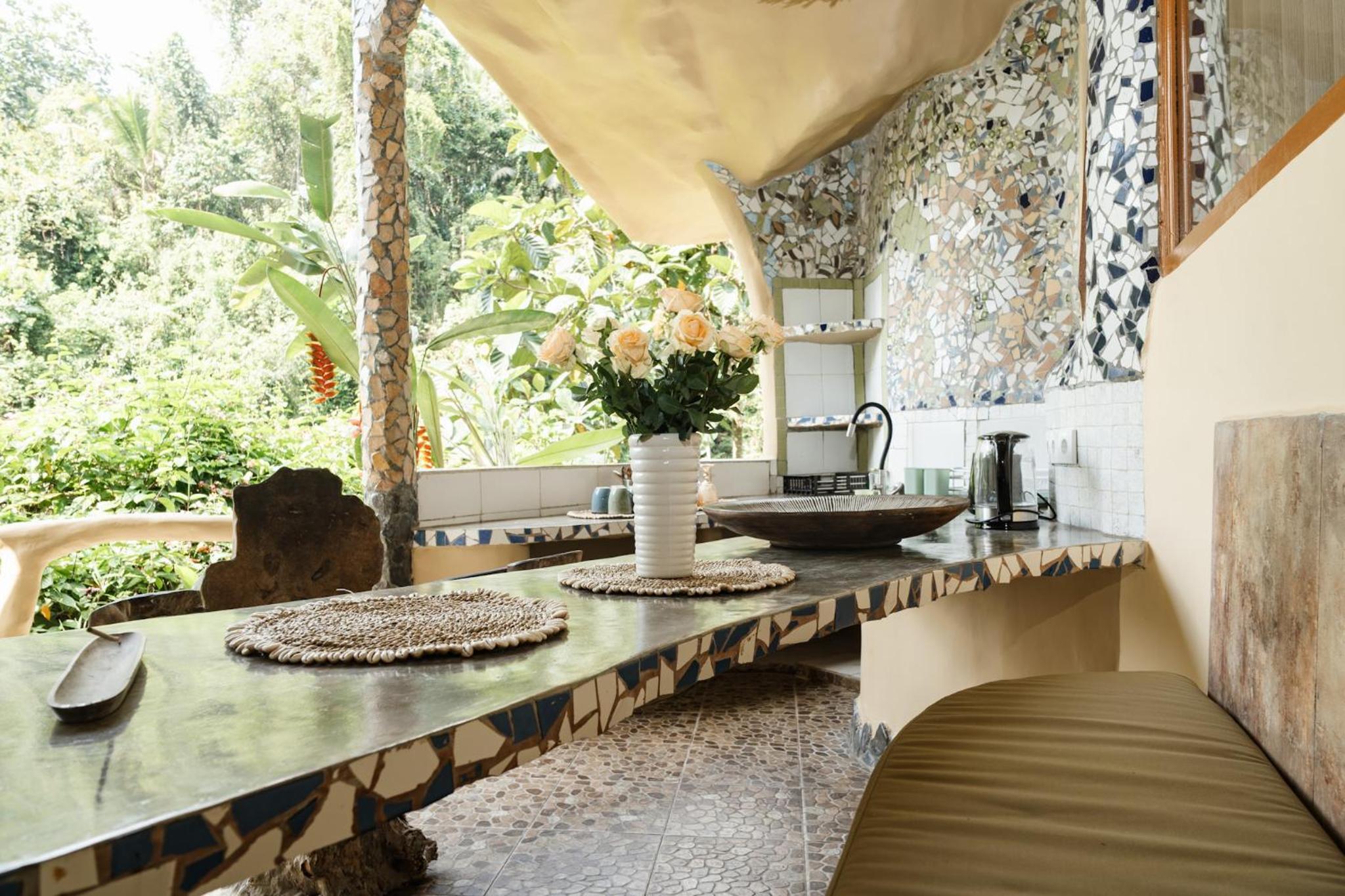 The place is absolutely stunning, designed in a truly original way that combines Gaudí-inspired elements, Balinese influences, and unique artistry. The room was comfortable and inviting, and the staff was warm and attentive. There is a lovely small pool with breathtaking views, and yoga classes are offered on the property. Breakfast is available on-site. We enjoyed our stay very much and will definitely be back.