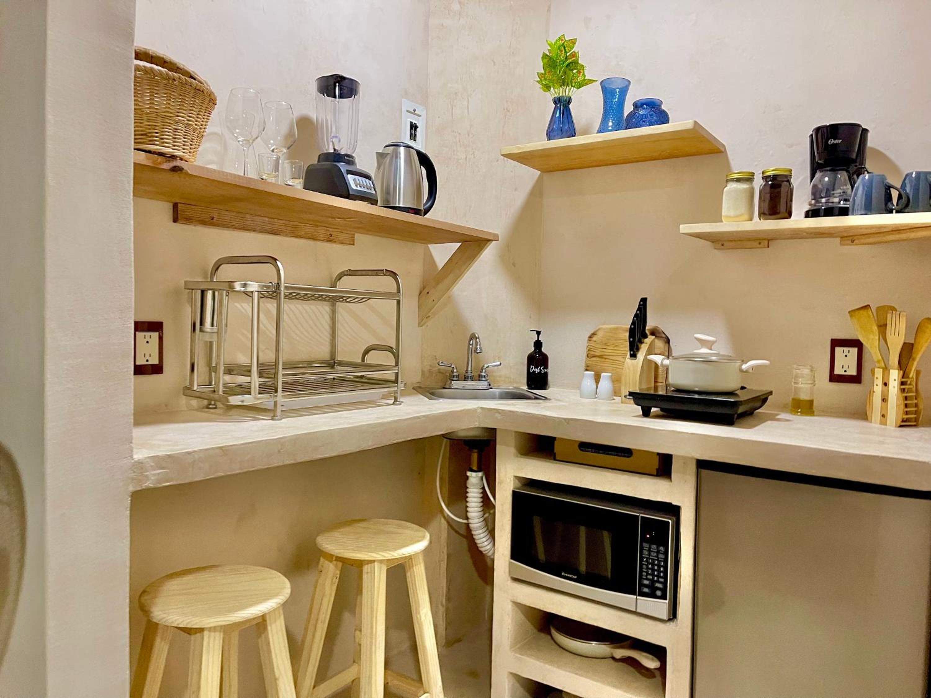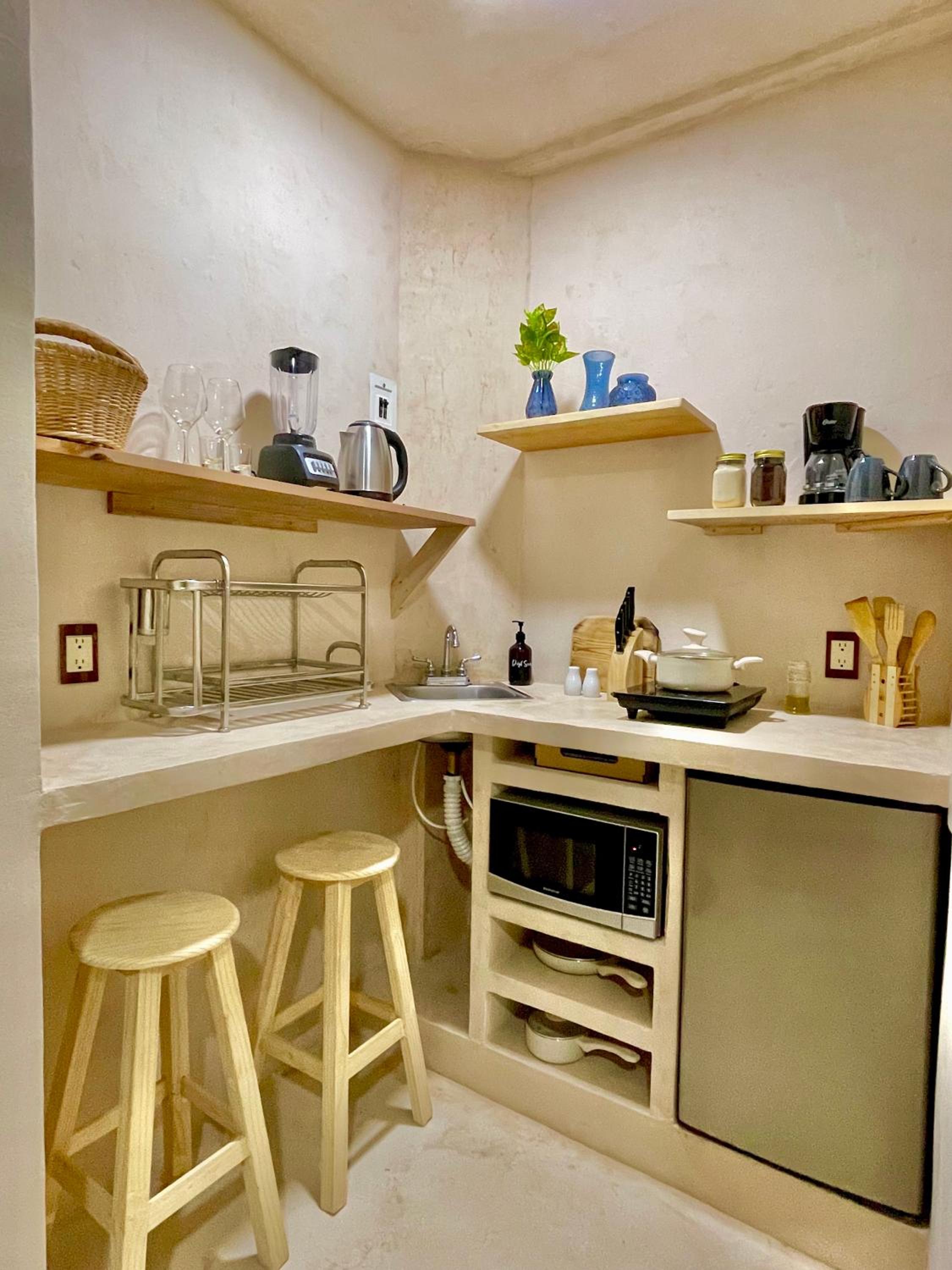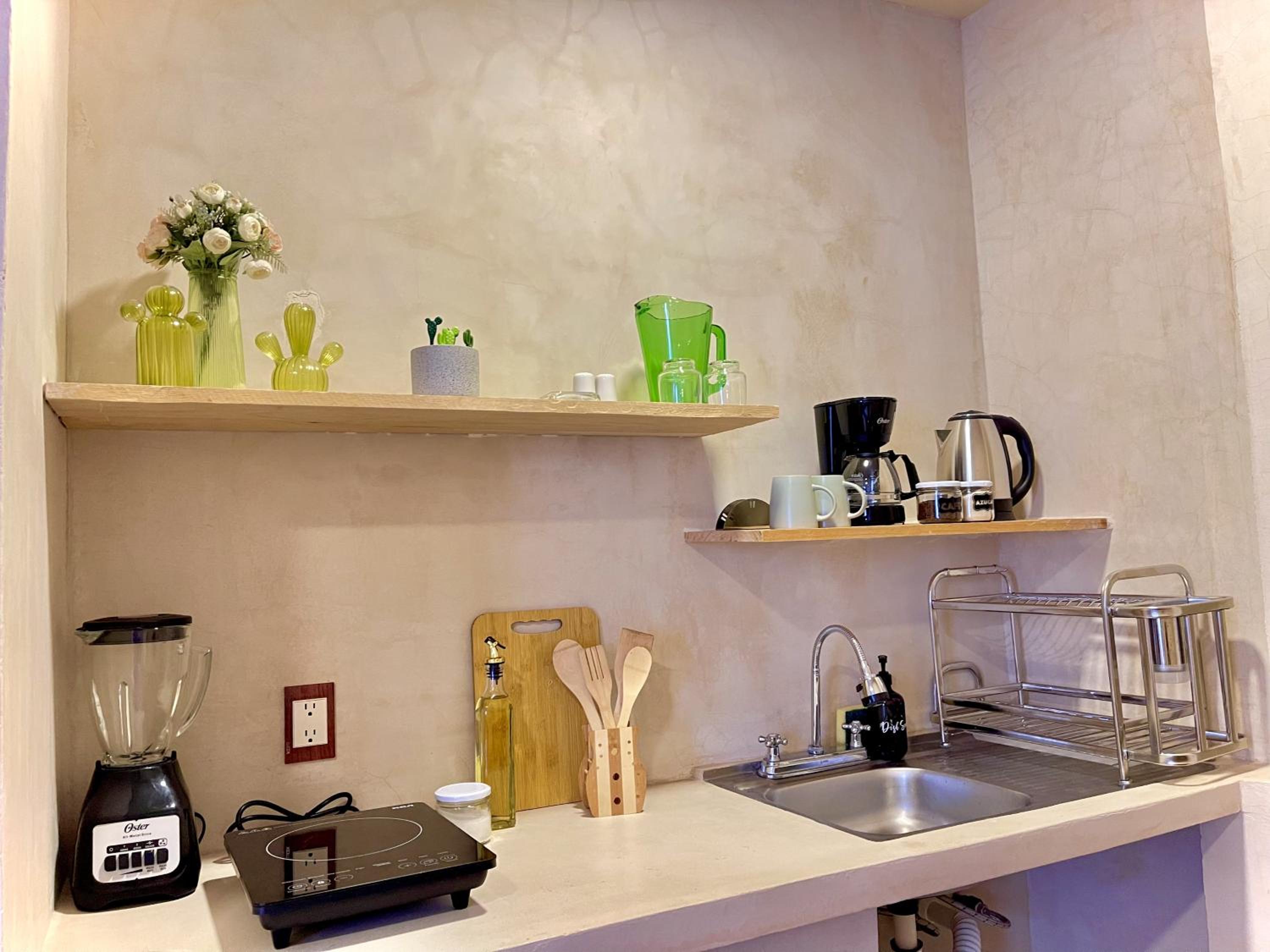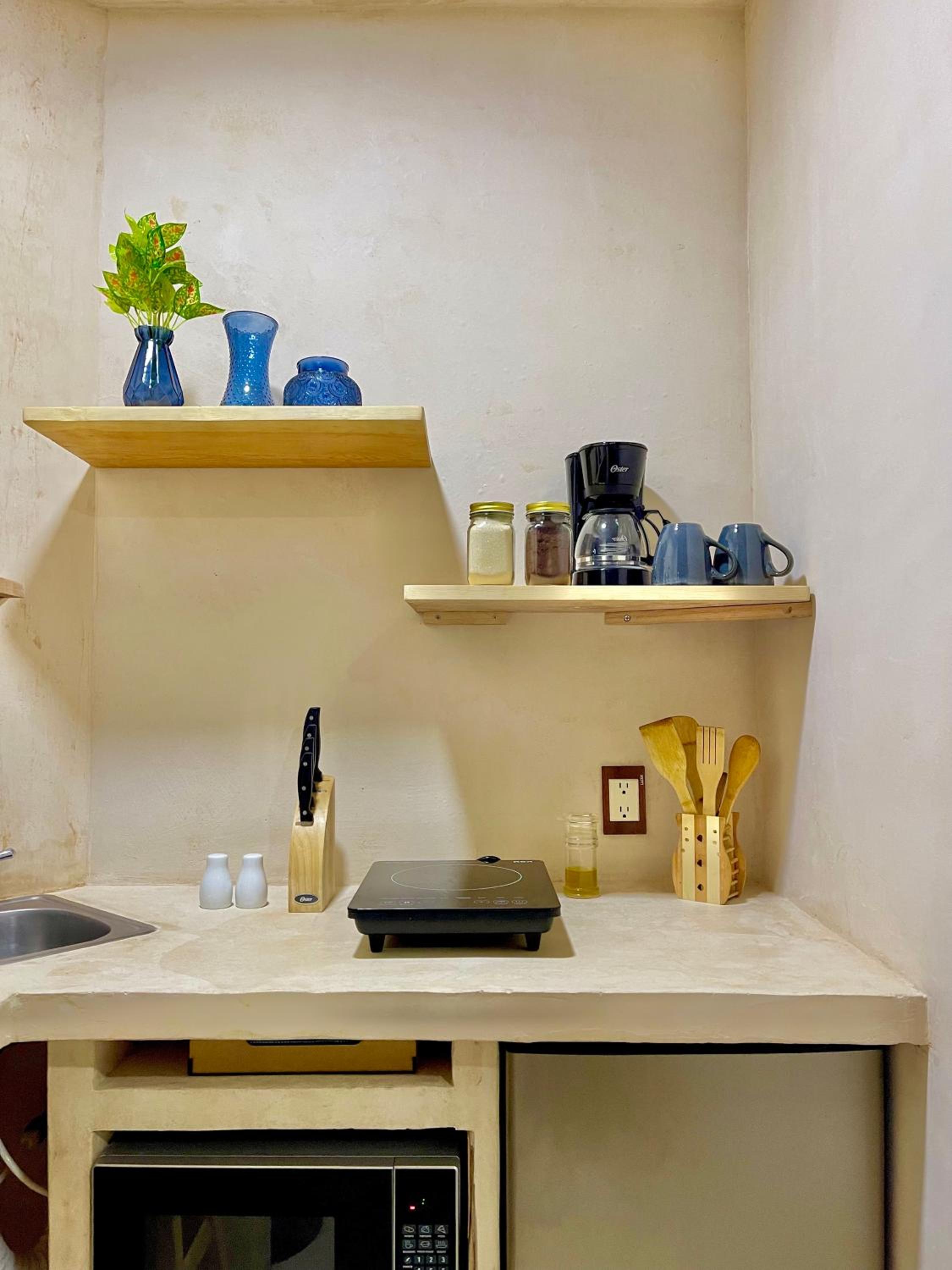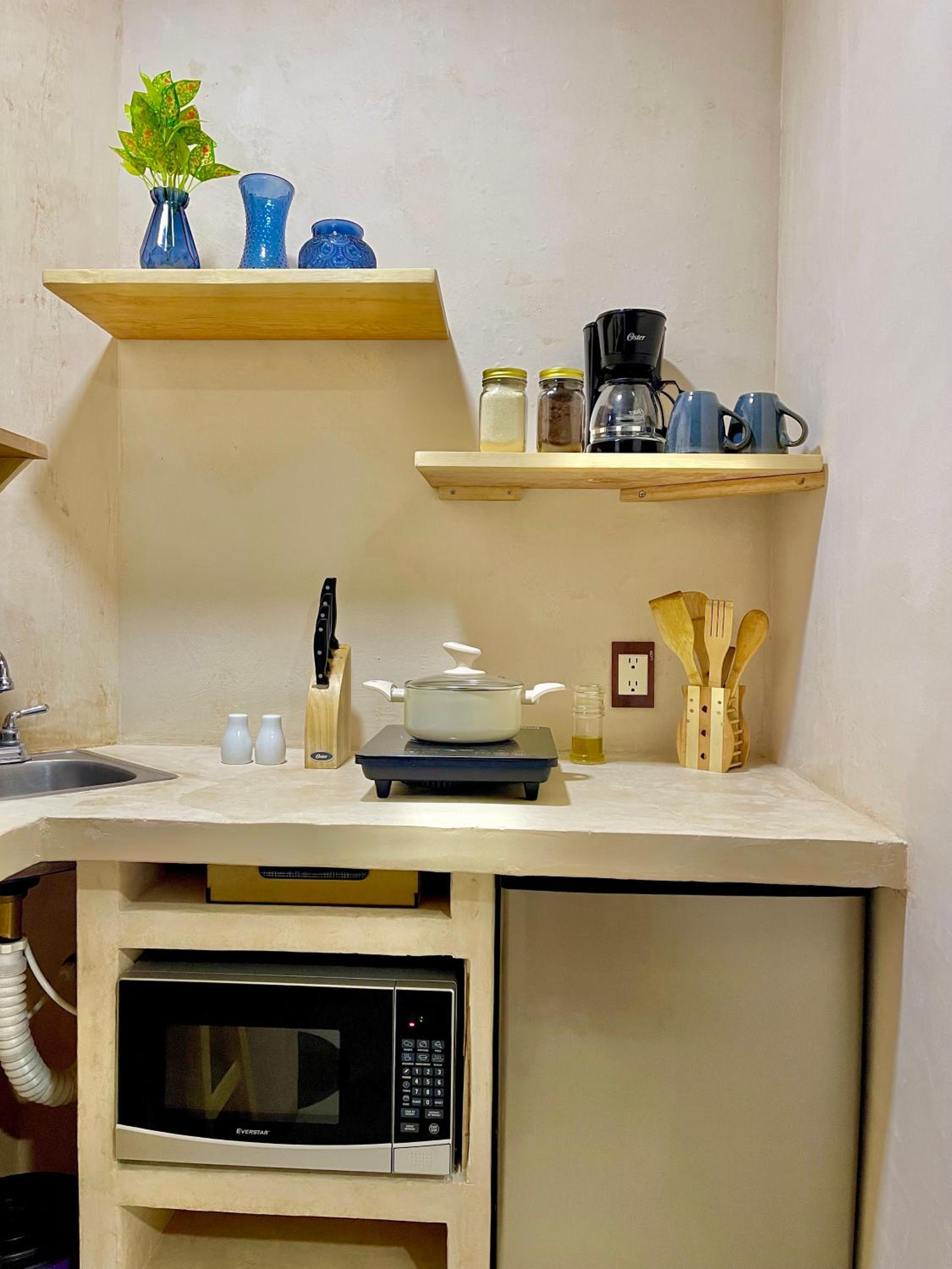 Tiene todo para estar súper cómodo, te dejan café y una cocina con lo necesario más tu balcón. Bellísimo lugar