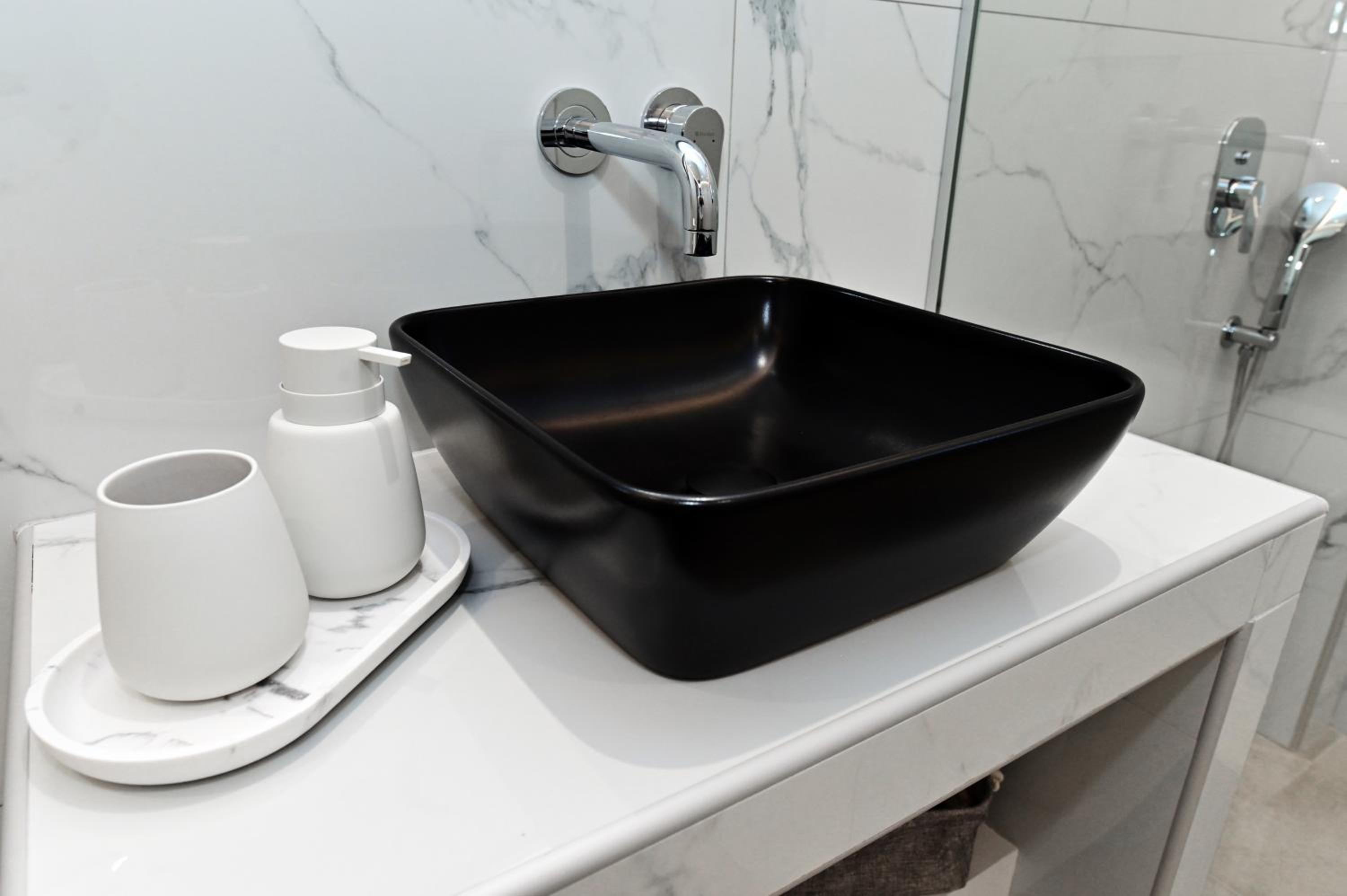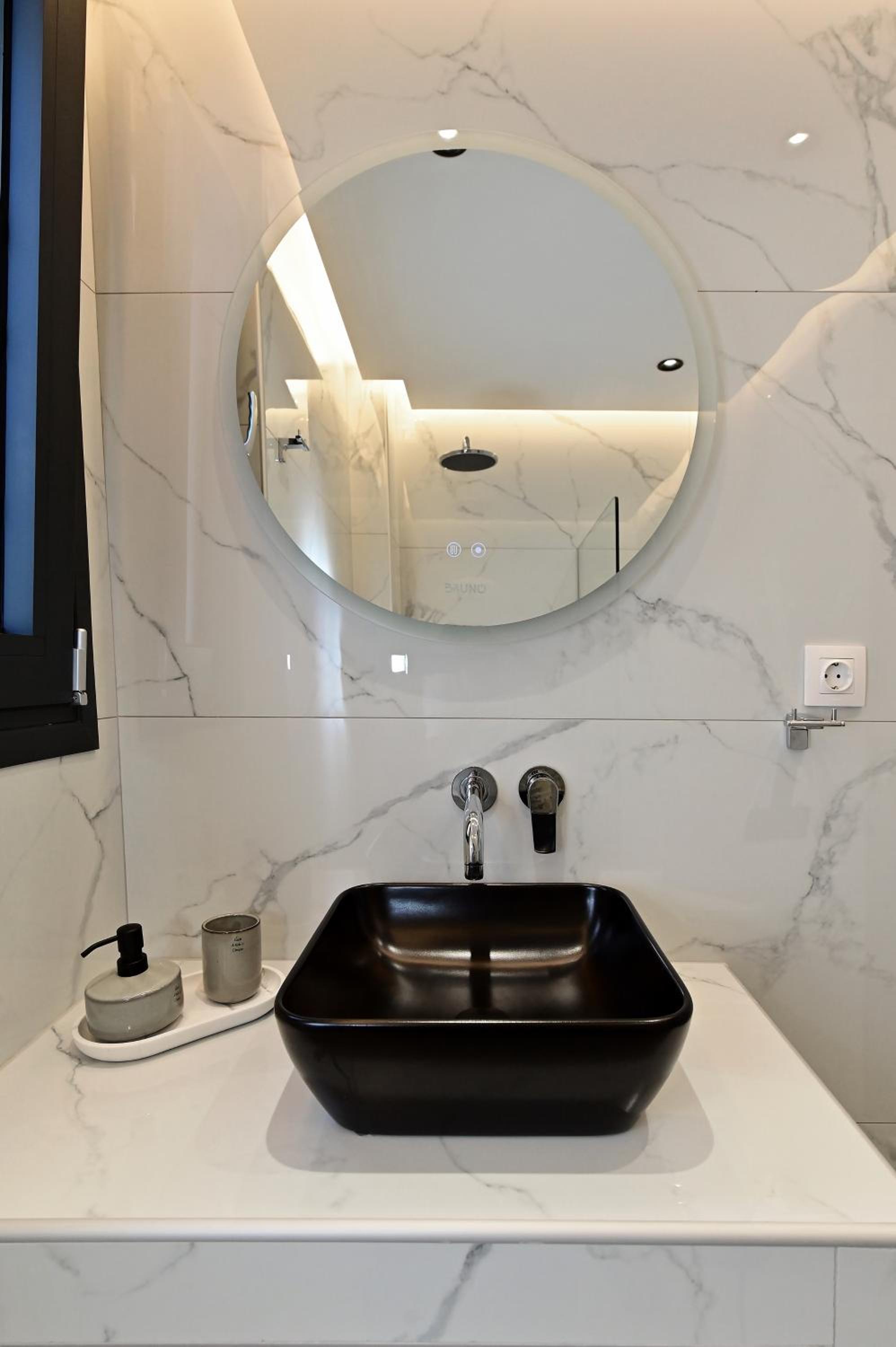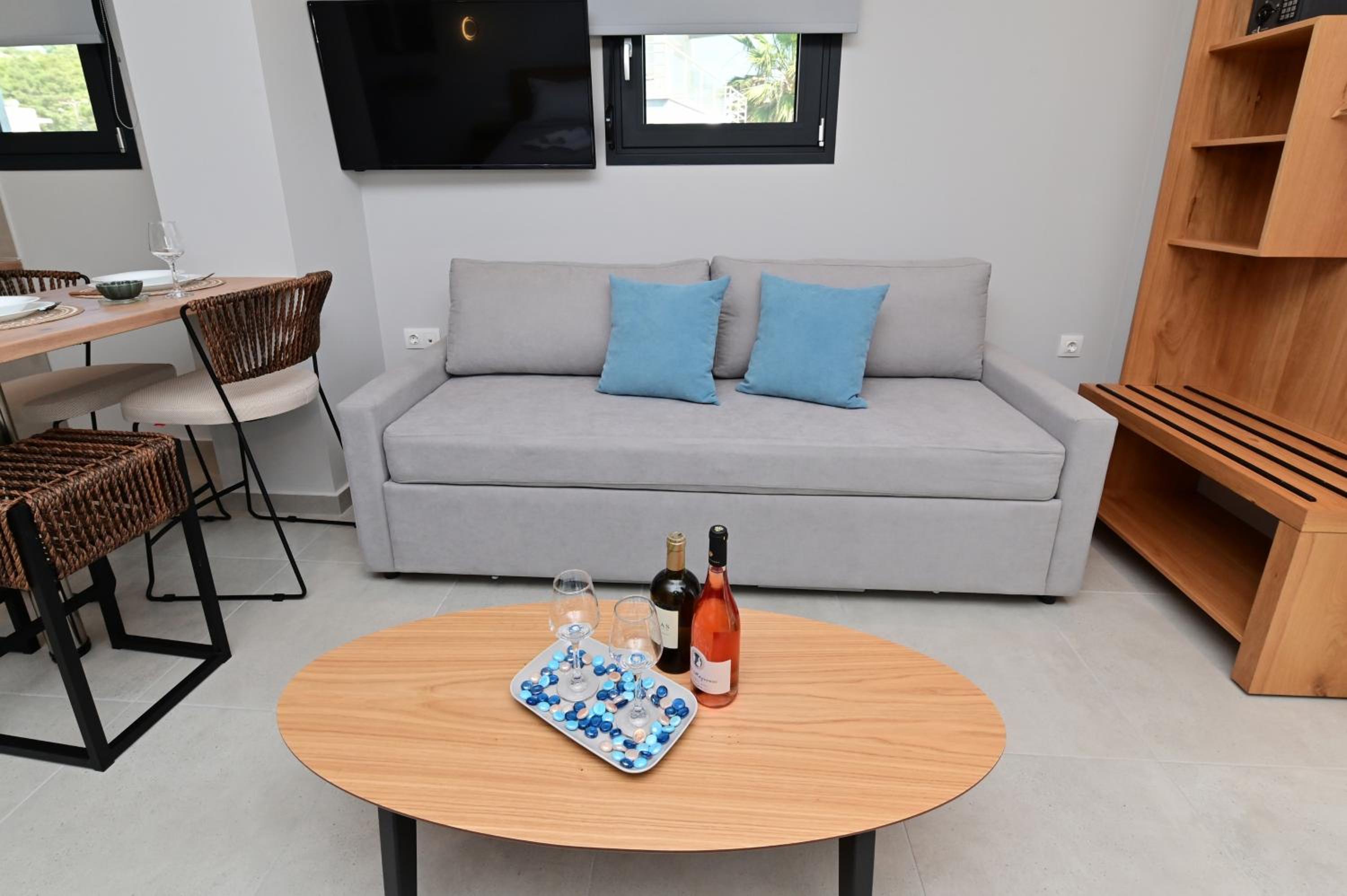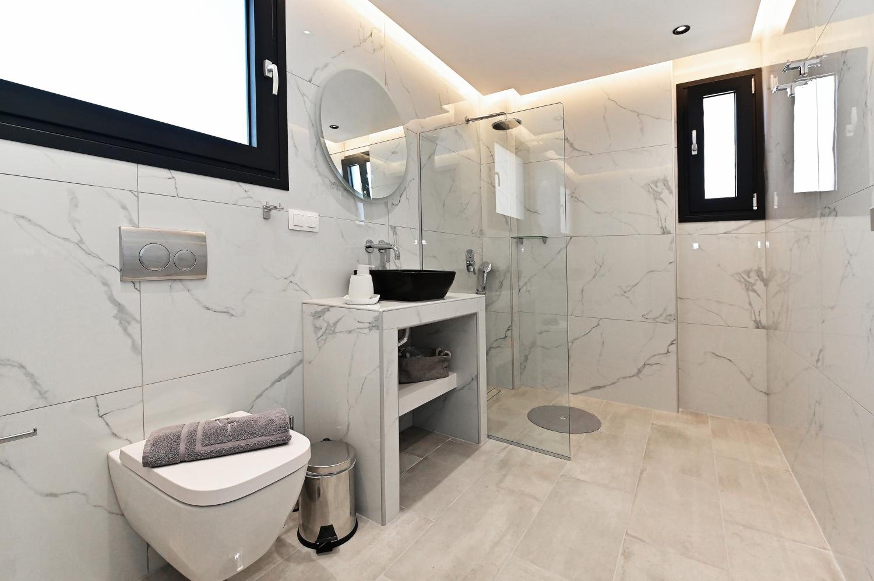 There is no direct car access to the apartment's entrance, the on-foot access through a narrow path in front of the other villas' terraces, facing the beach. Sea water cleanliness is disputable. Manual control of the HVAC system kept us awake all night. Not logically narrow space around the toilet seat in a newly designed building.