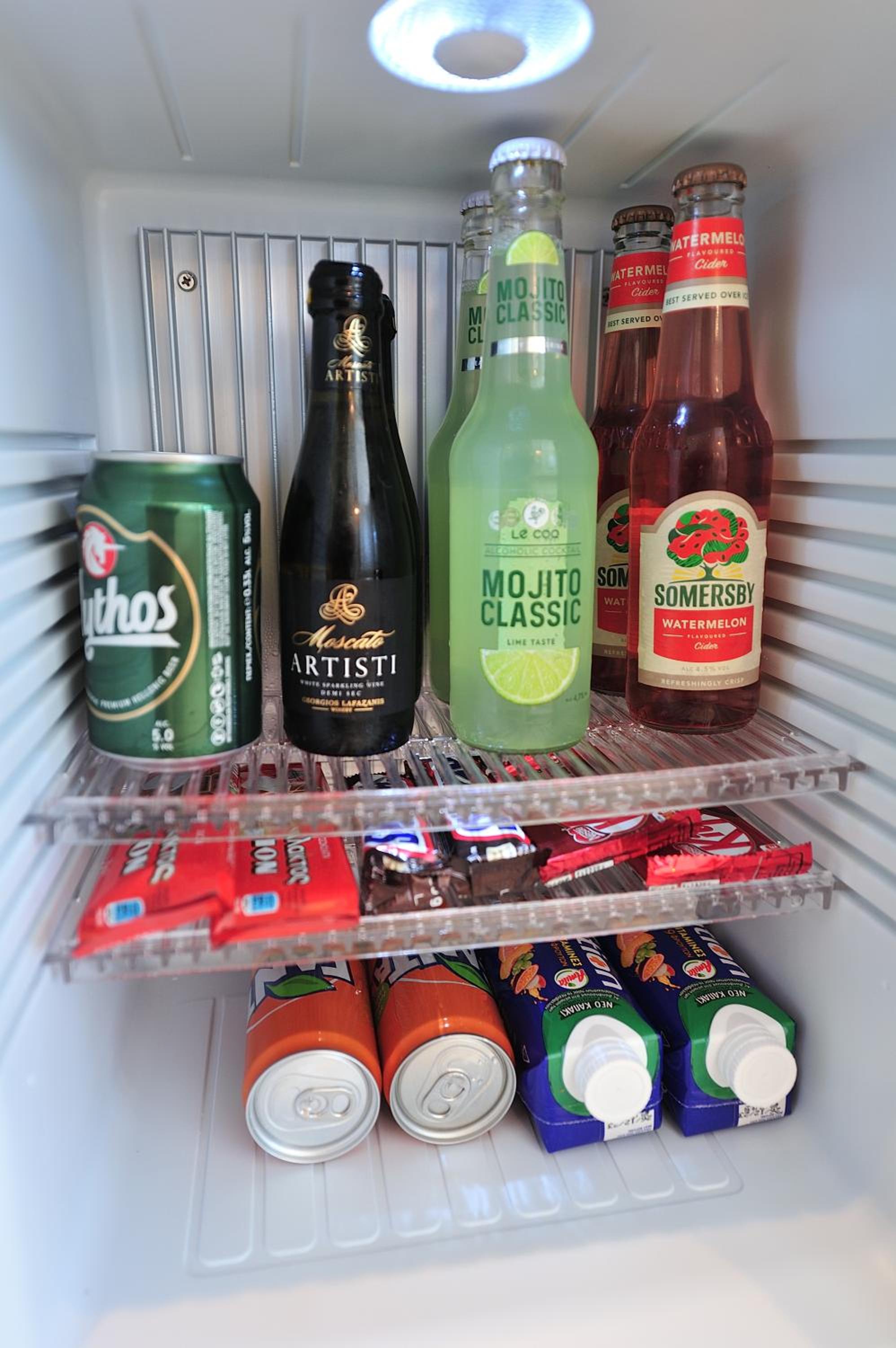 They have a cute shower, enough space overall, a small refrigerator you can use, a big comfy bed and multiple light switches so you can choose the lightning of the room. They even have a couch and a TV, and a balcony with mountain or garden view with the jacuzzi and a table with two chairs! There’s also a coffee machine with coffee pads in your room you can use whenever you want to and tea bags with hot water.