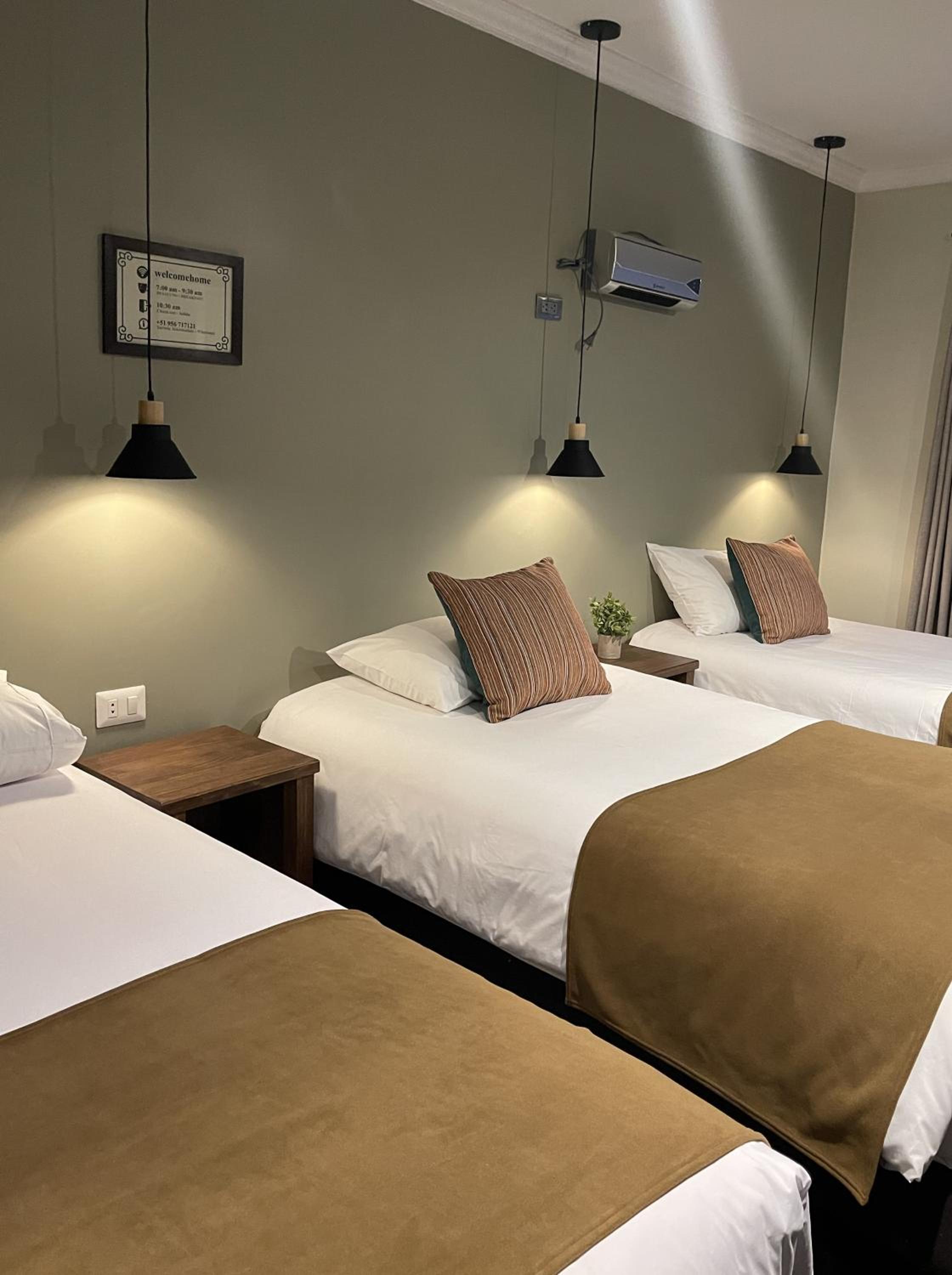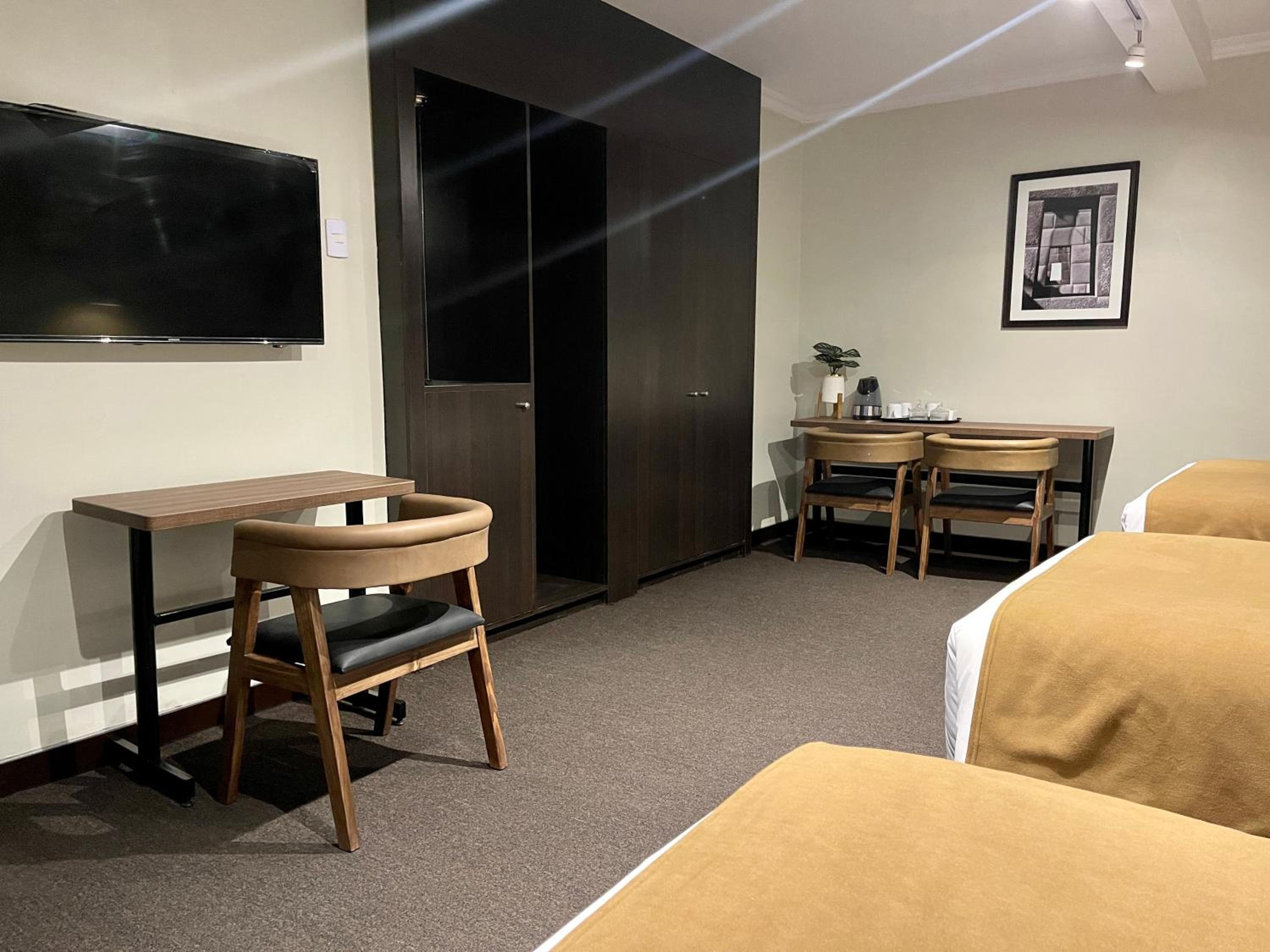 Fomos em 02 famílias. Fiz as reservas pela booking, Qd chegamos ao hotel fui informada que não tinham quarto triplo com cama de casal e que teríamos que ficar num quarto com 03 camas de solteiro, mas que no segundo dia de estadia iriam mudar. Qd retornei de machupichu, me colocaram no mesmo quarto e apenas juntaram as camas. O quarto da outra família que estava conosco tinha carpetes, pois o chão e muito gelado e o quarto que nos ofereceram não. Tivemos problemas com o chuveiro que não saia água e nem água quente. Informaram que estavam arrumando um problema na água e o que posso relatar é que foi muito transtorno. O banheiro e muito apertado, vc não consegue usar a pia e fechar a porta.