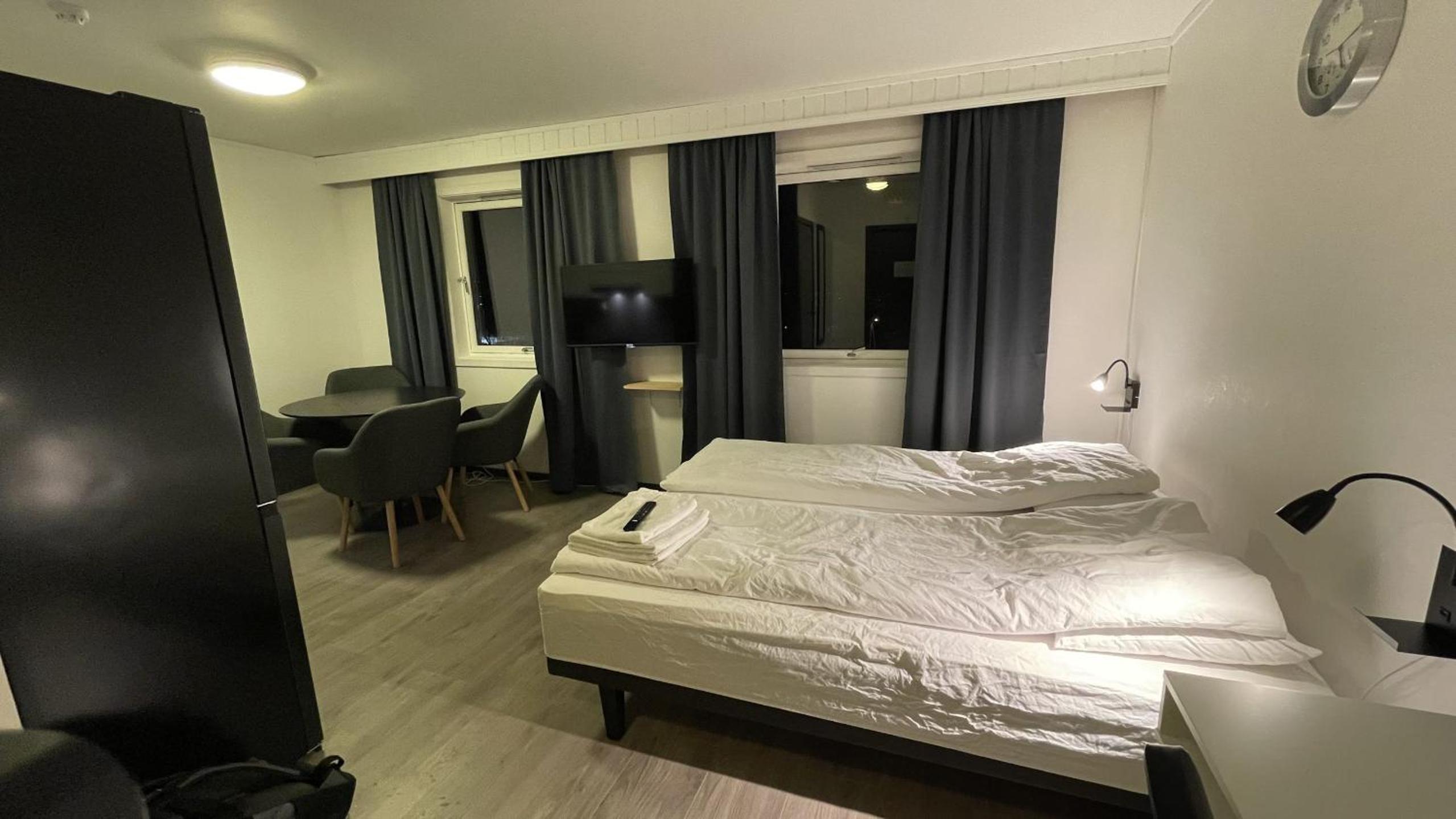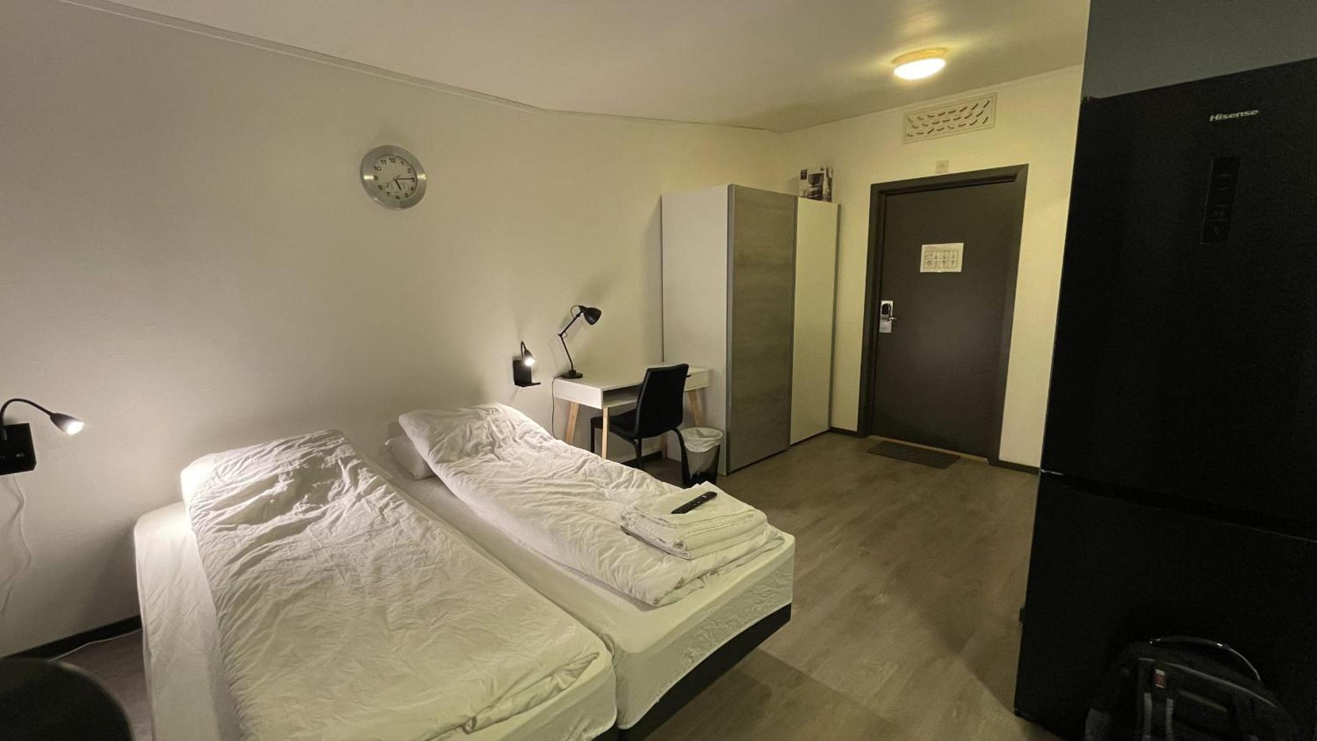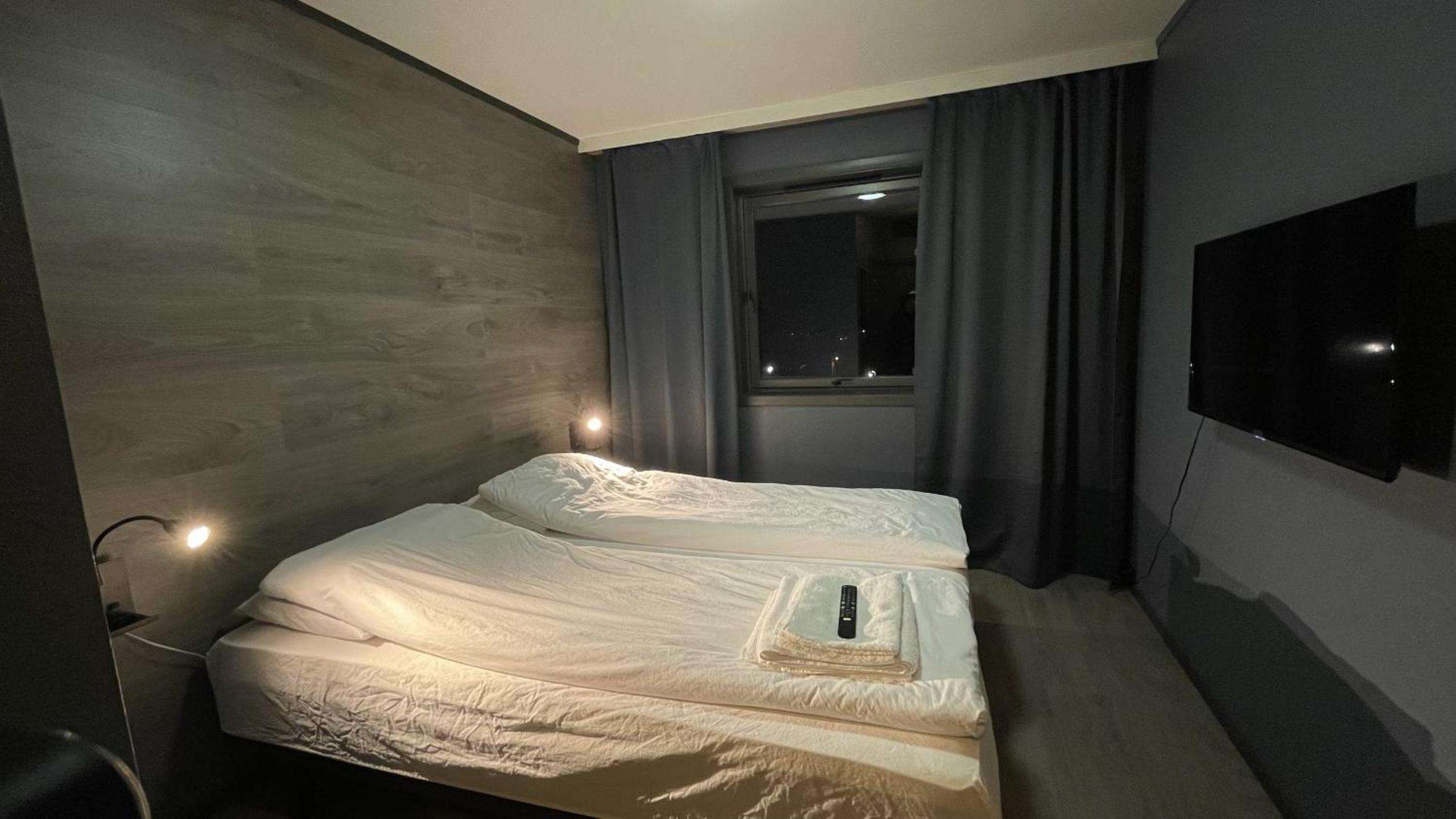Enkel og grei innsjekking uten personale. Hyggelig og hjelpsom person på telefon. Kontakter er godt tilgjengelig, viktig for PC og mobillading.