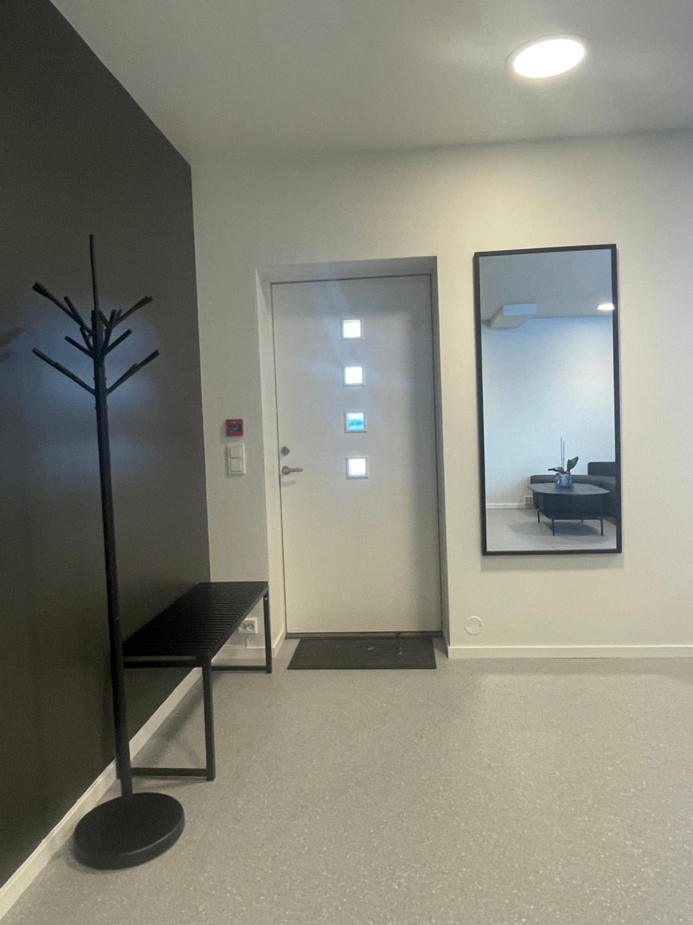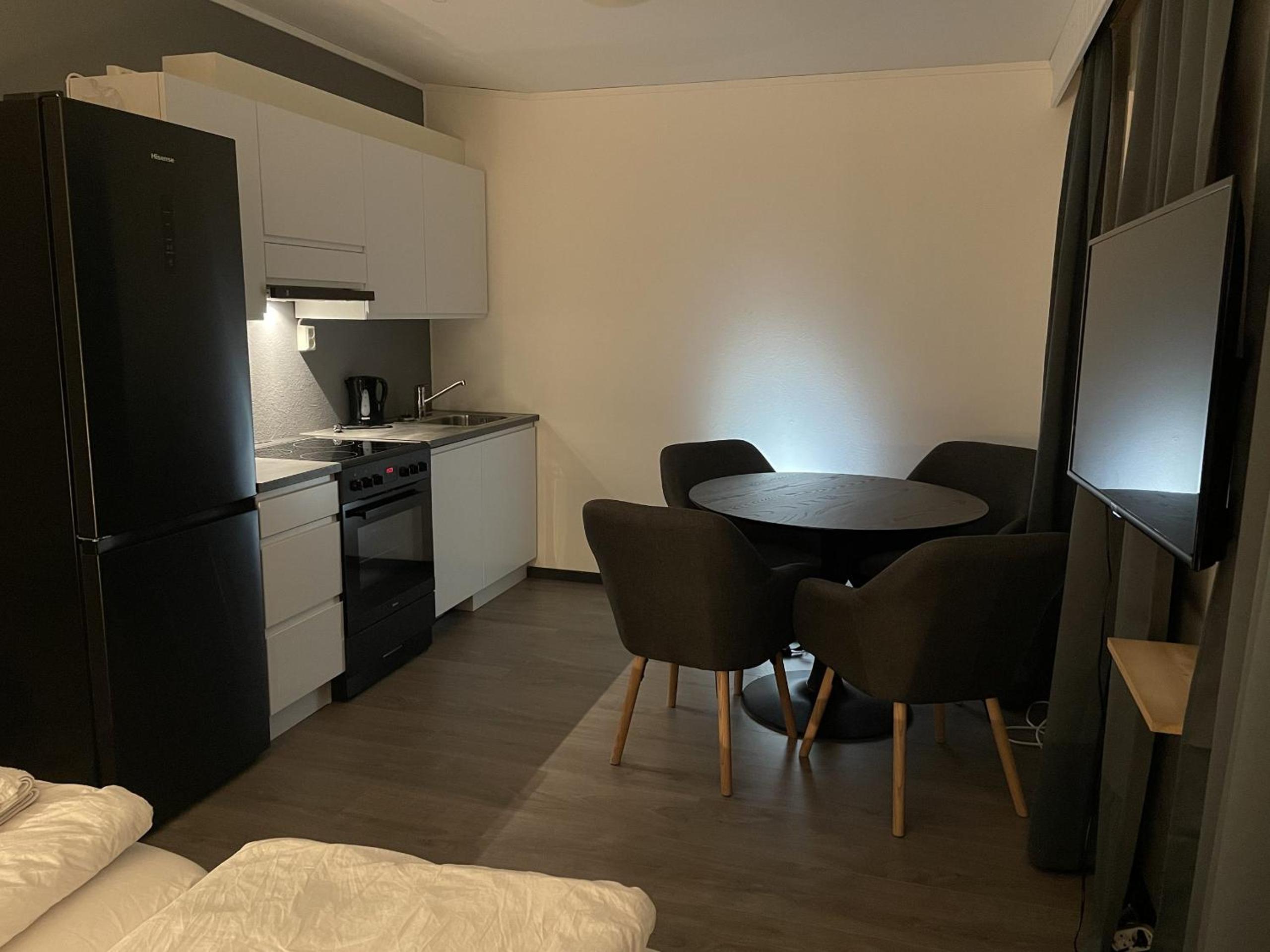 Fint med tilgjengelig kjøleskap i fellesarealet i underetasjen. Rommet var stilrent i både farger og utformingen generelt. Veldig greit med parkering rett utenfor inngangen.
