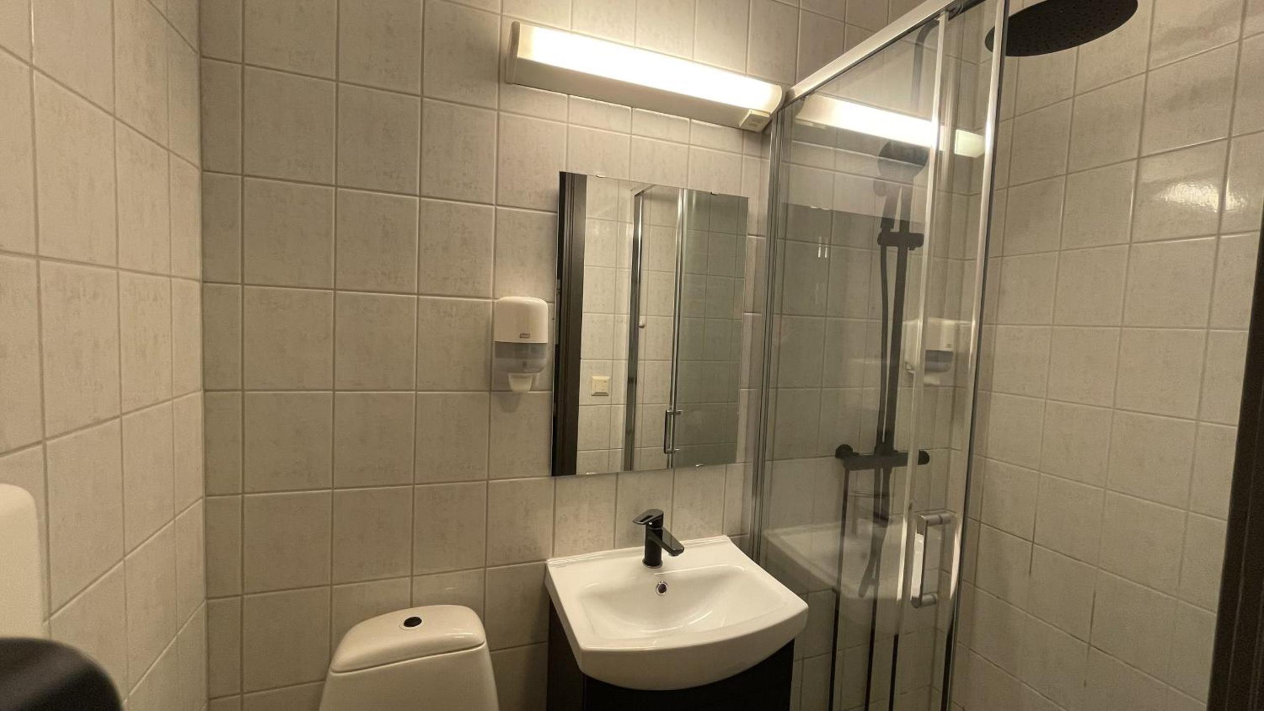 Ikke toalettpapir på toalettet ved innsjekk. Vann flyter over store deler av badegulvet når man tar en dusj.. man brenner seg på varmtvannsrøret i dusjen