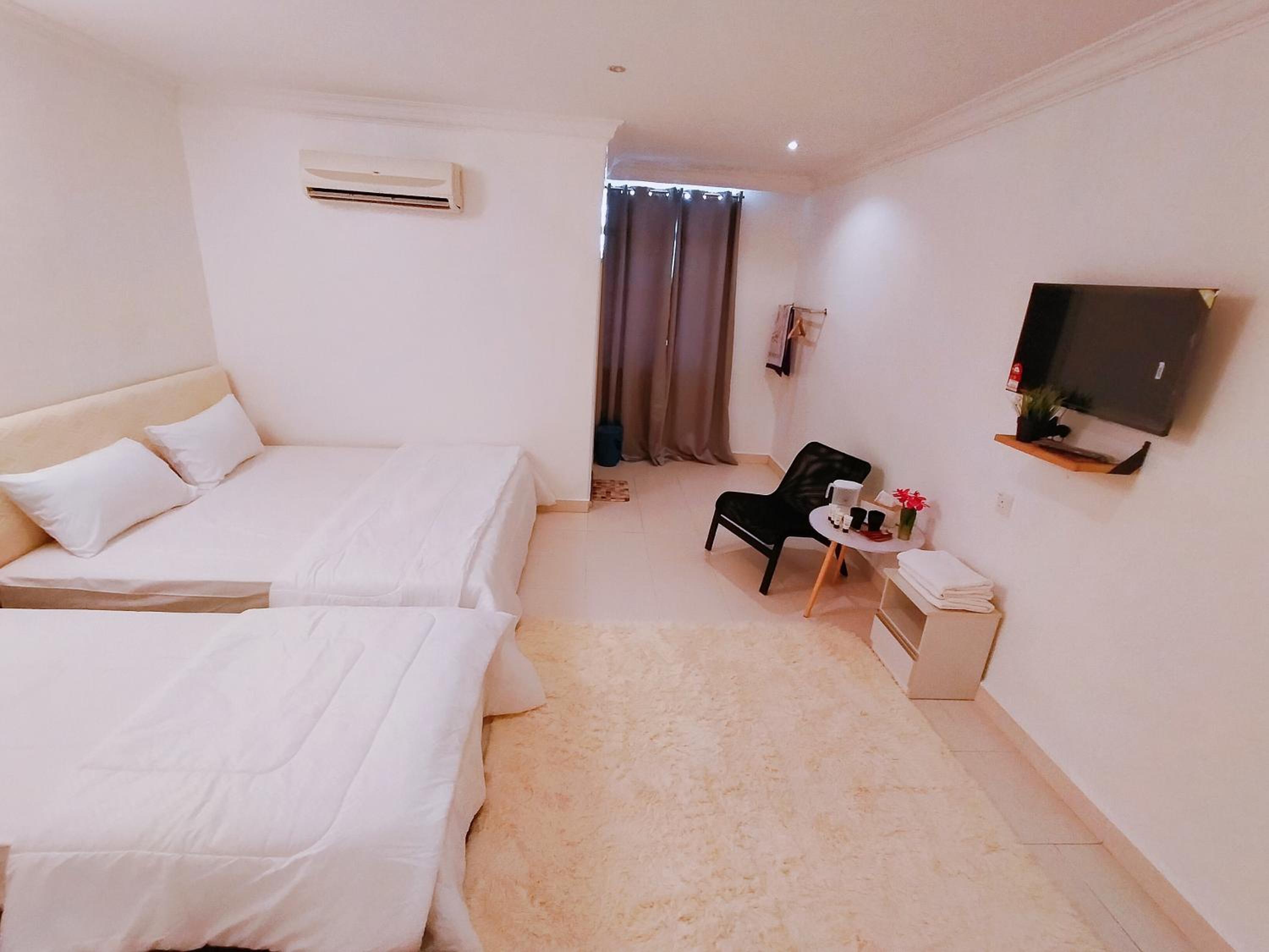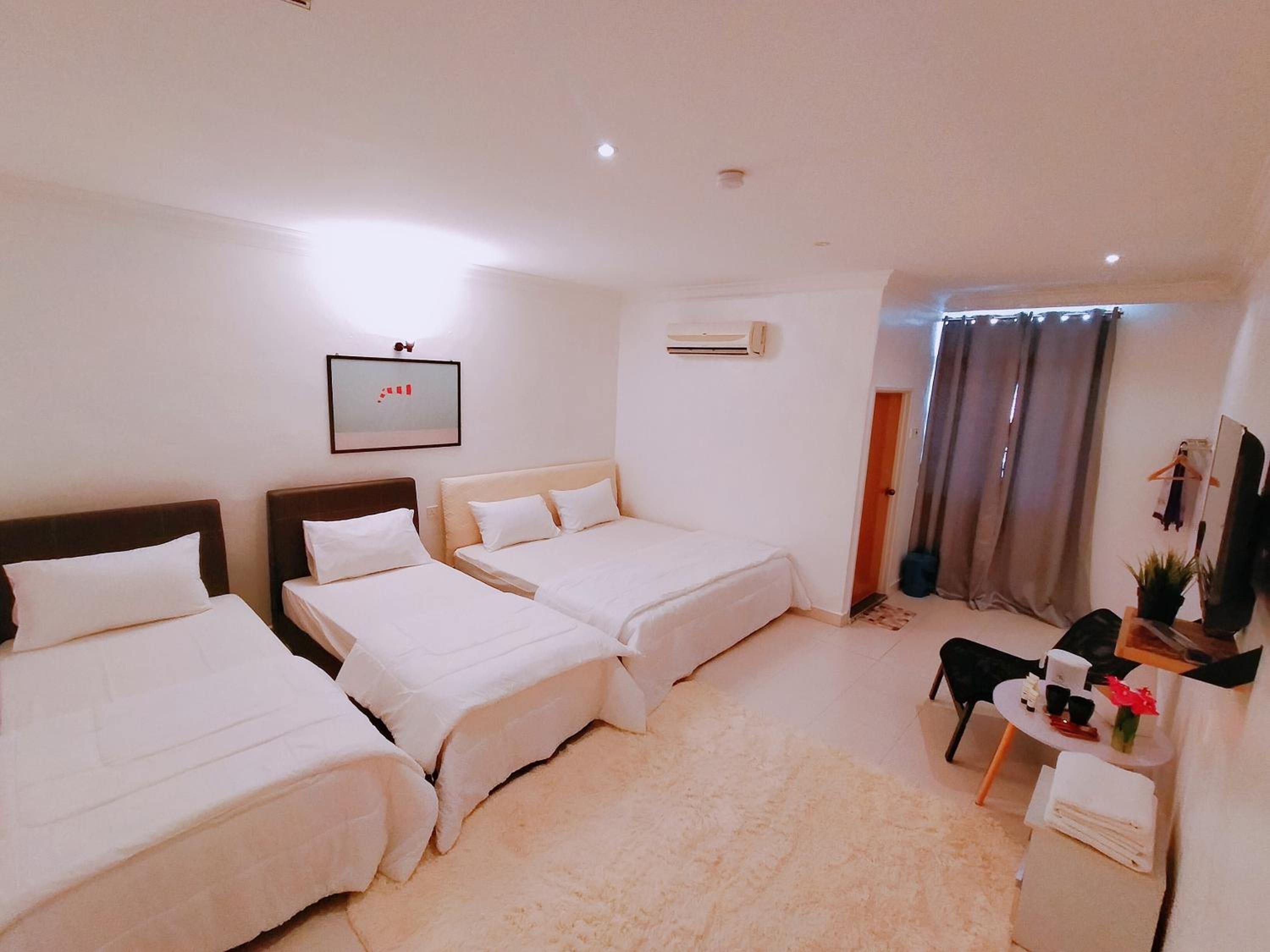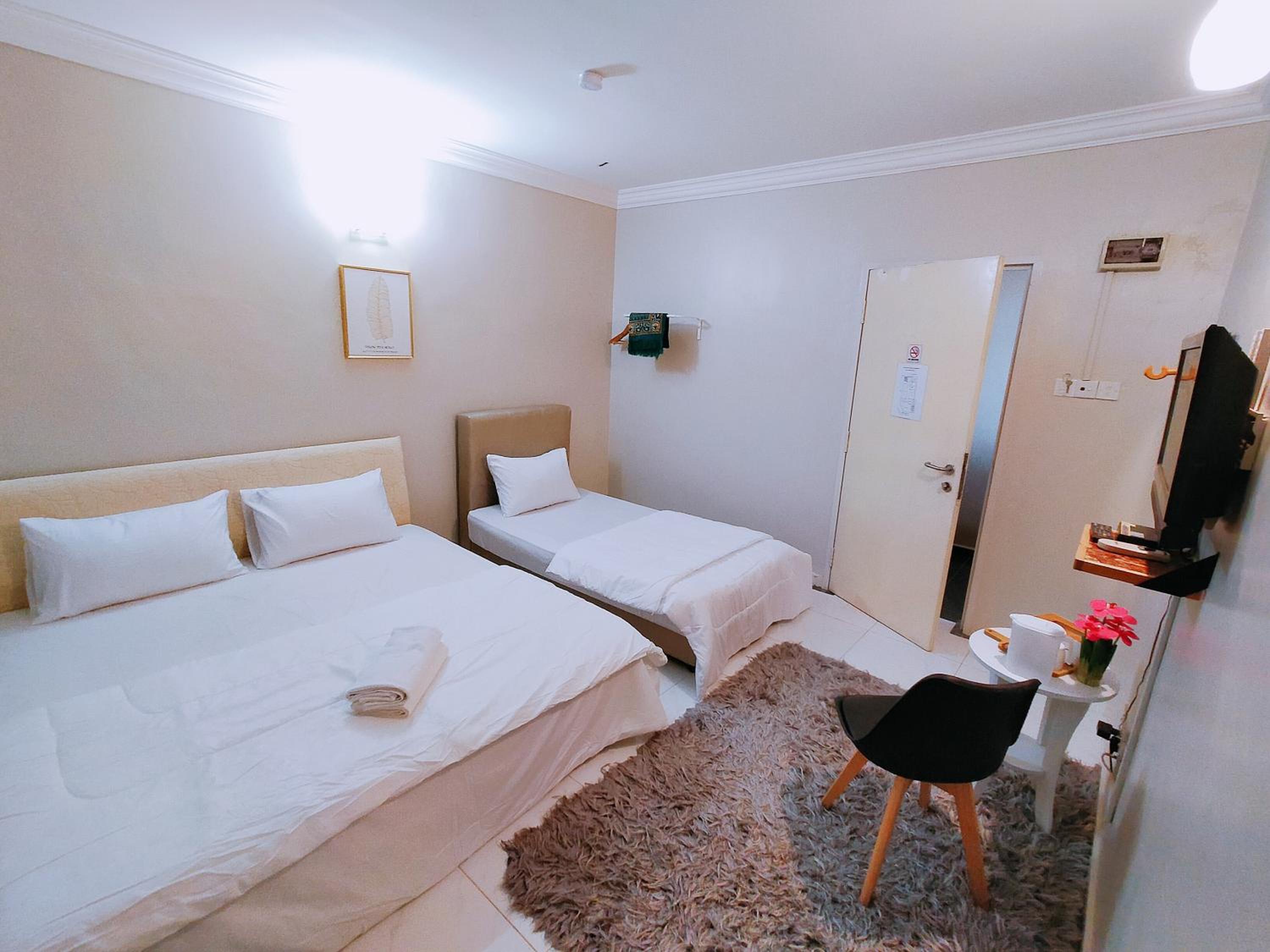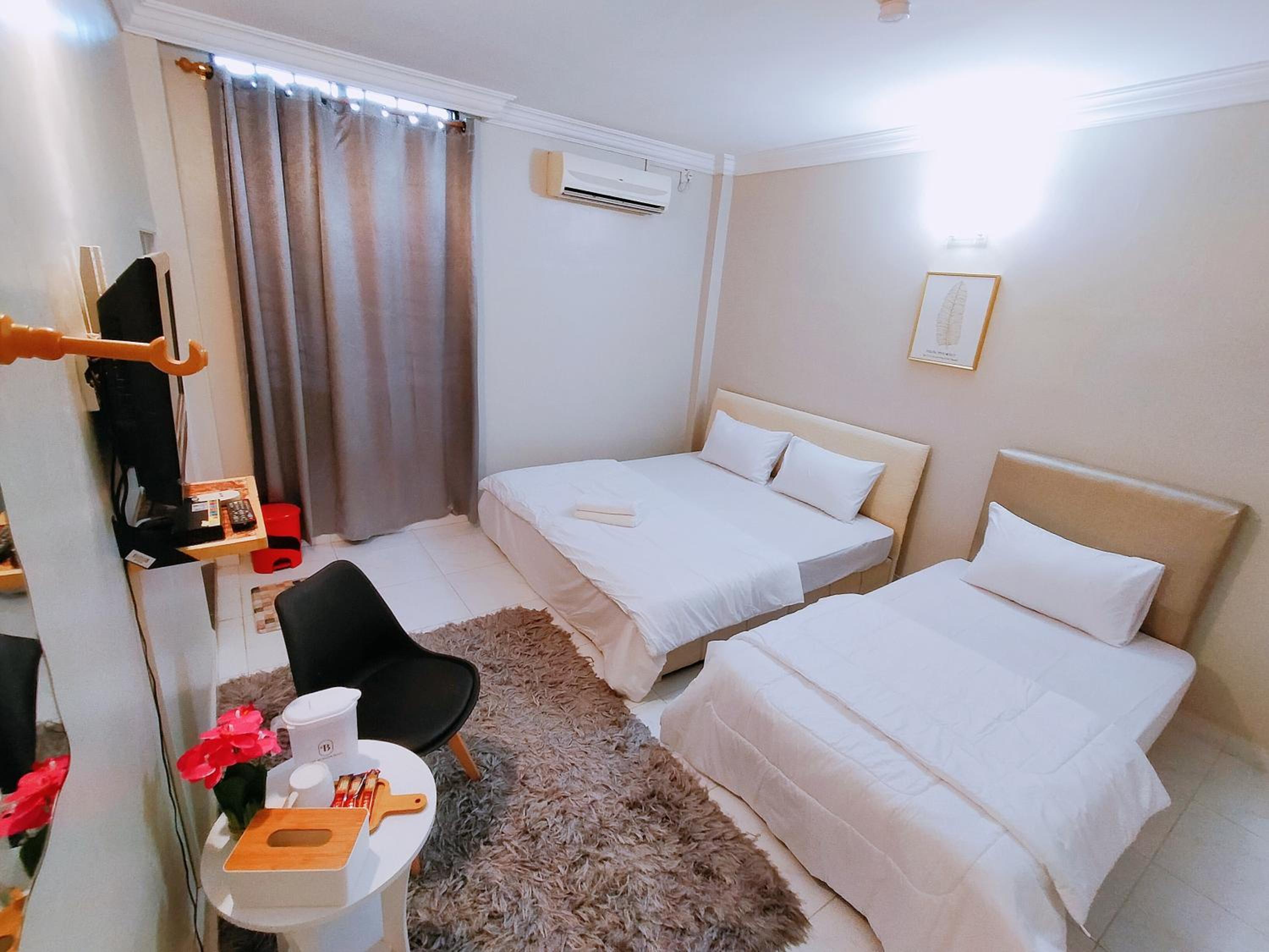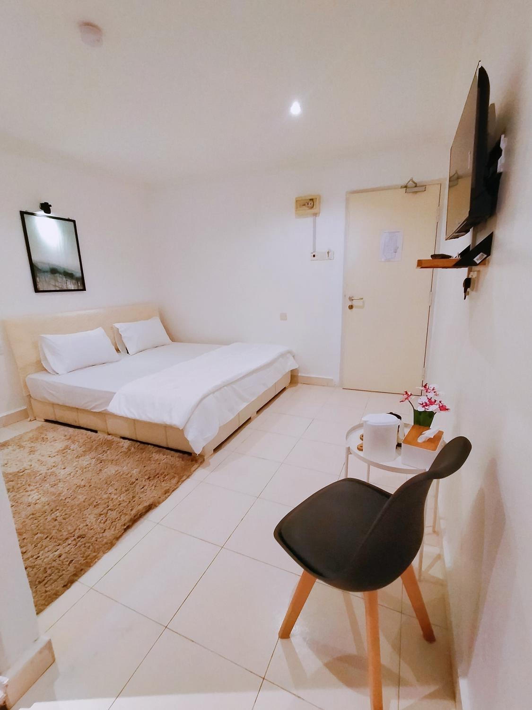 Tempat charger fon satu je ada.tu pun dekat dgn tv.. sepatutnya buat satu lagi soket utk charger kat tepi katil
