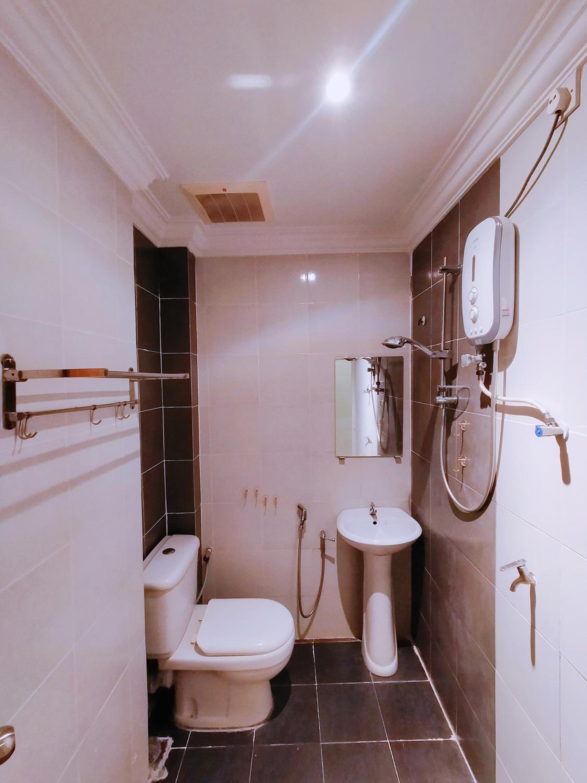 Toilet has an unpleasant odour that comes from the sewage drainage. Bathroom light should be brighter.
