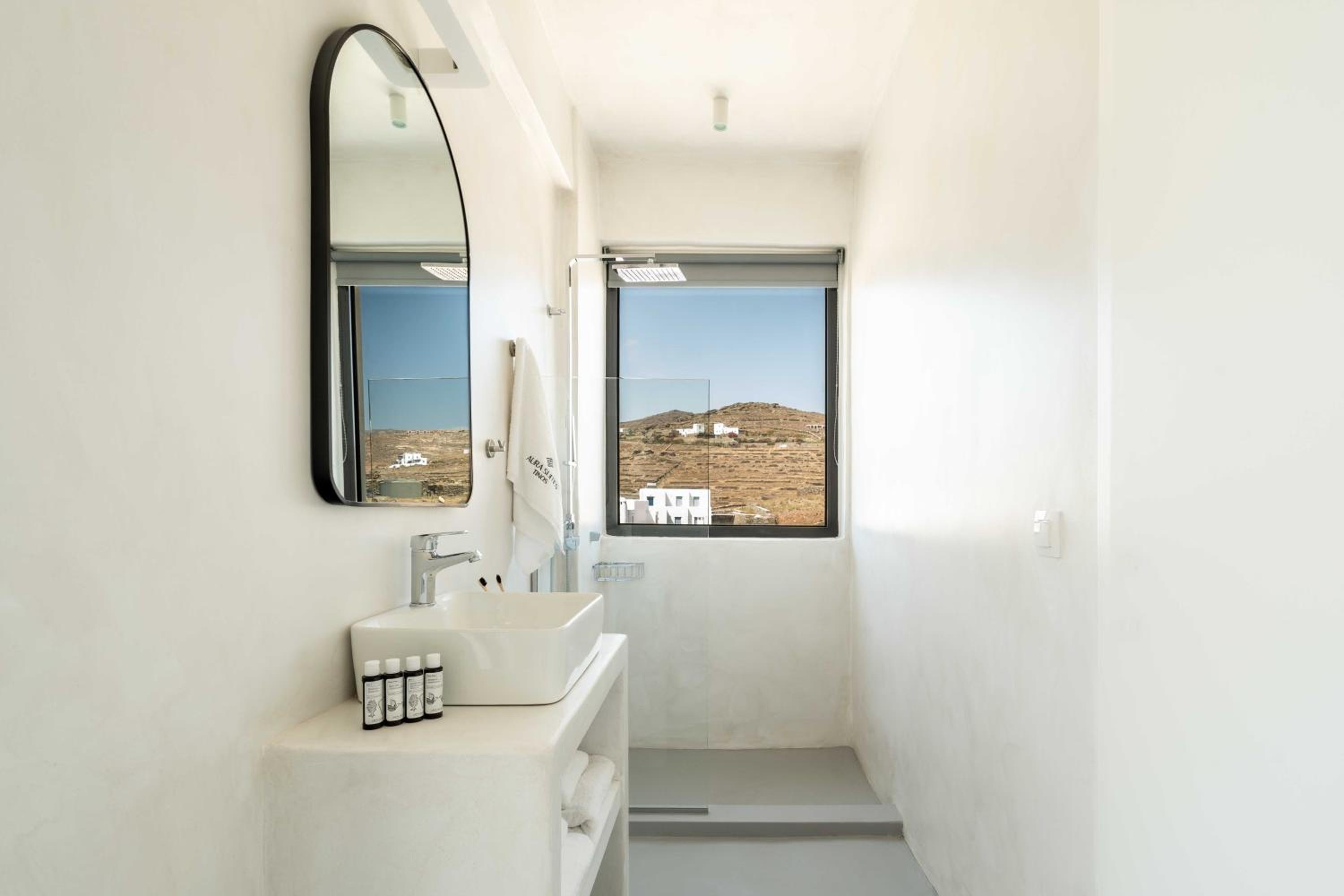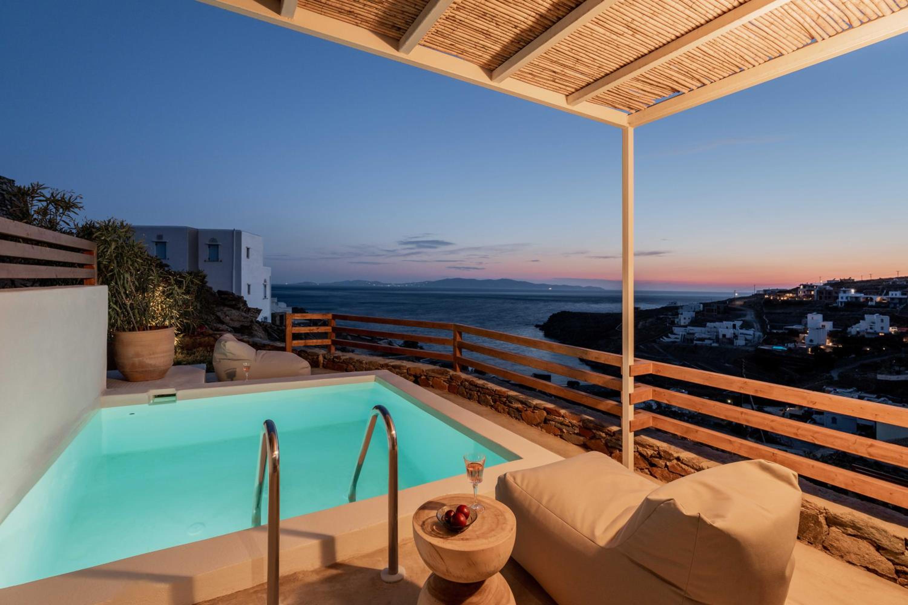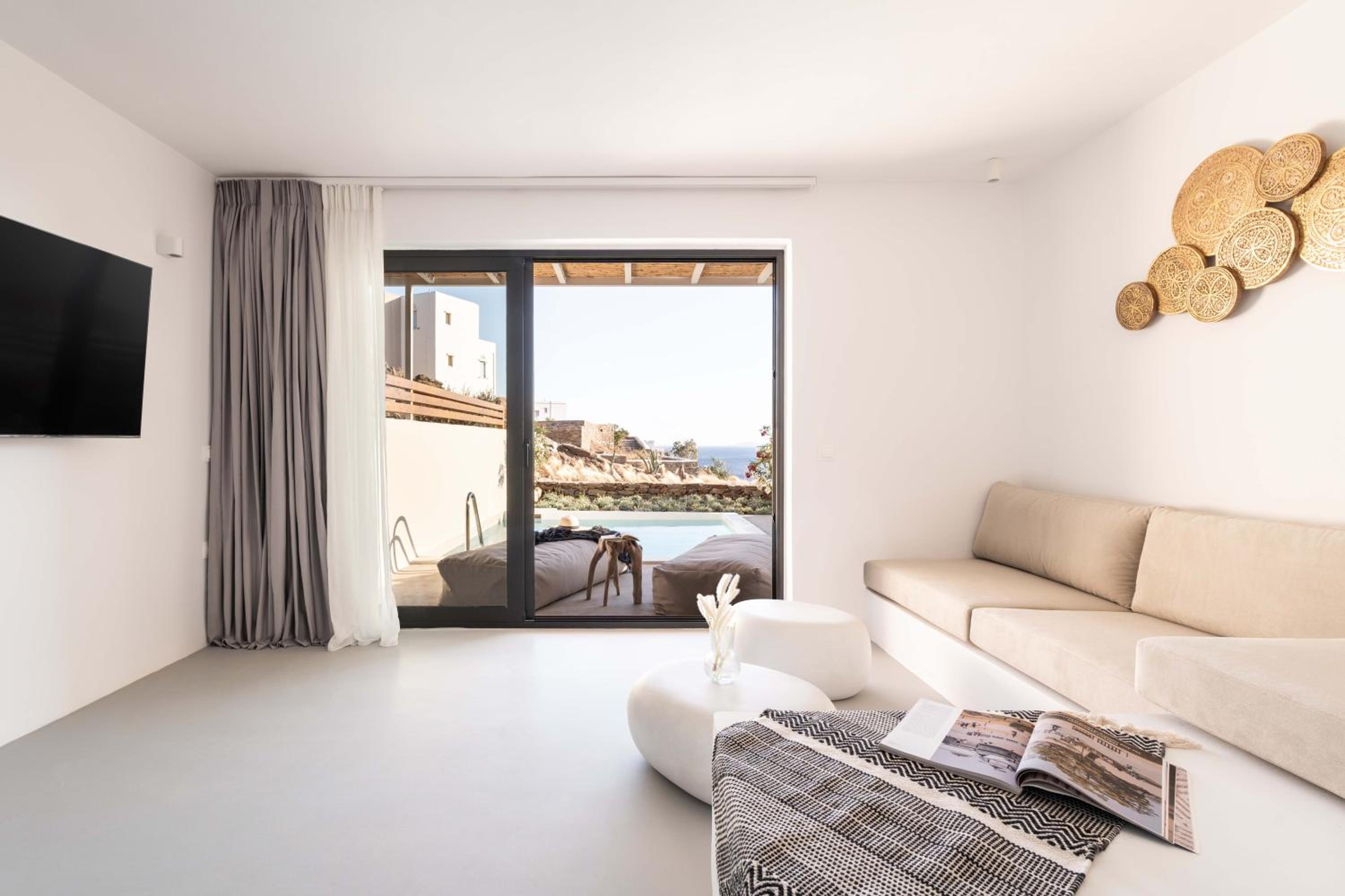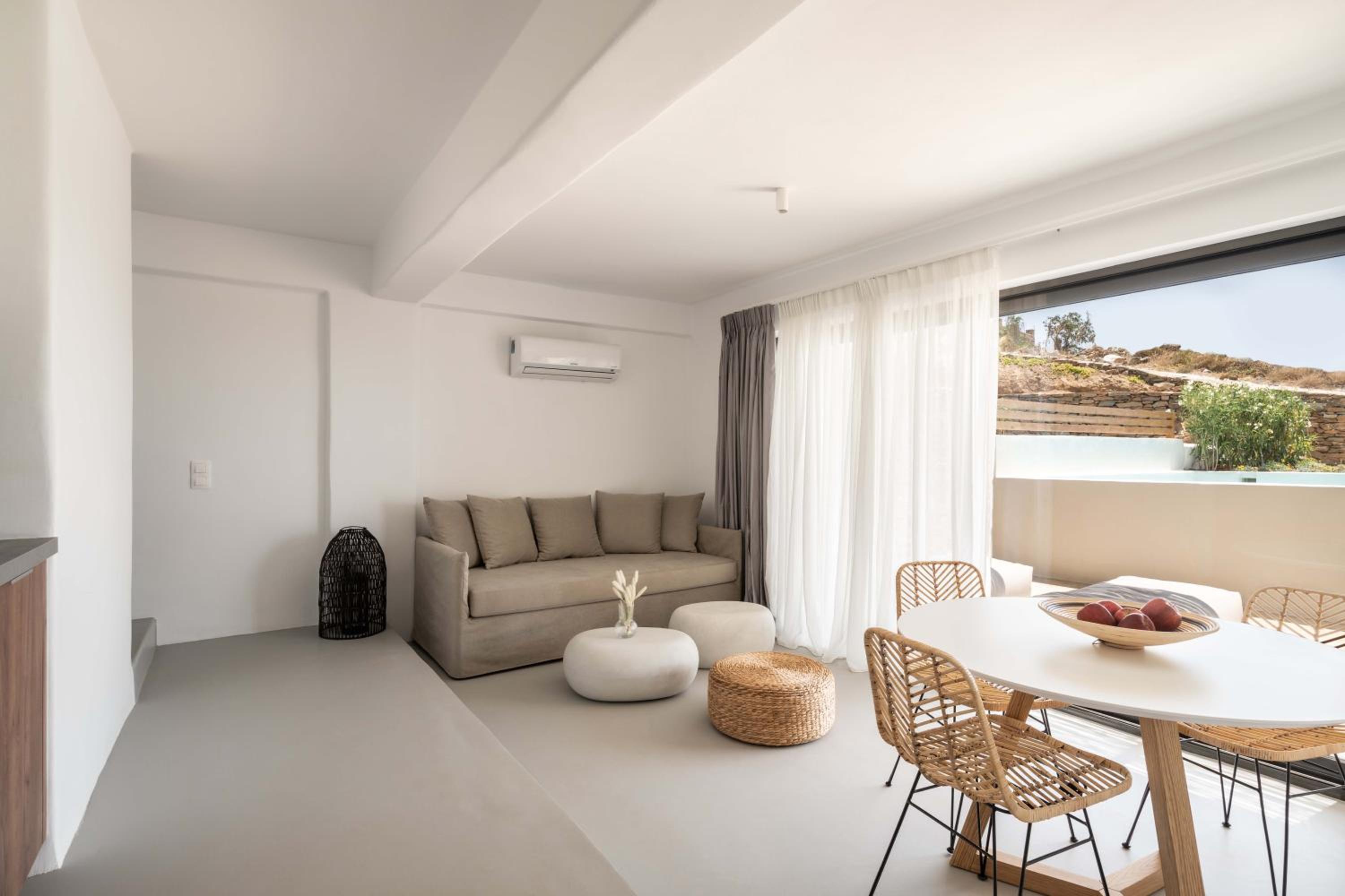 Experience a luxurious stay at Aura Villas Tinos, located just 300 meters from Vourni Beach. Our air-conditioned rooms are equipped with modern amenities including a coffee machine, fridge, and flat-screen TV. Relax on your private terrace and enjoy the comforts of a minibar and safety deposit box.