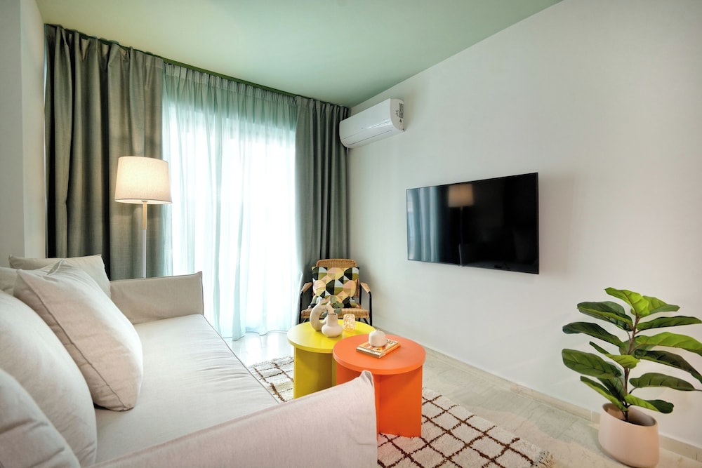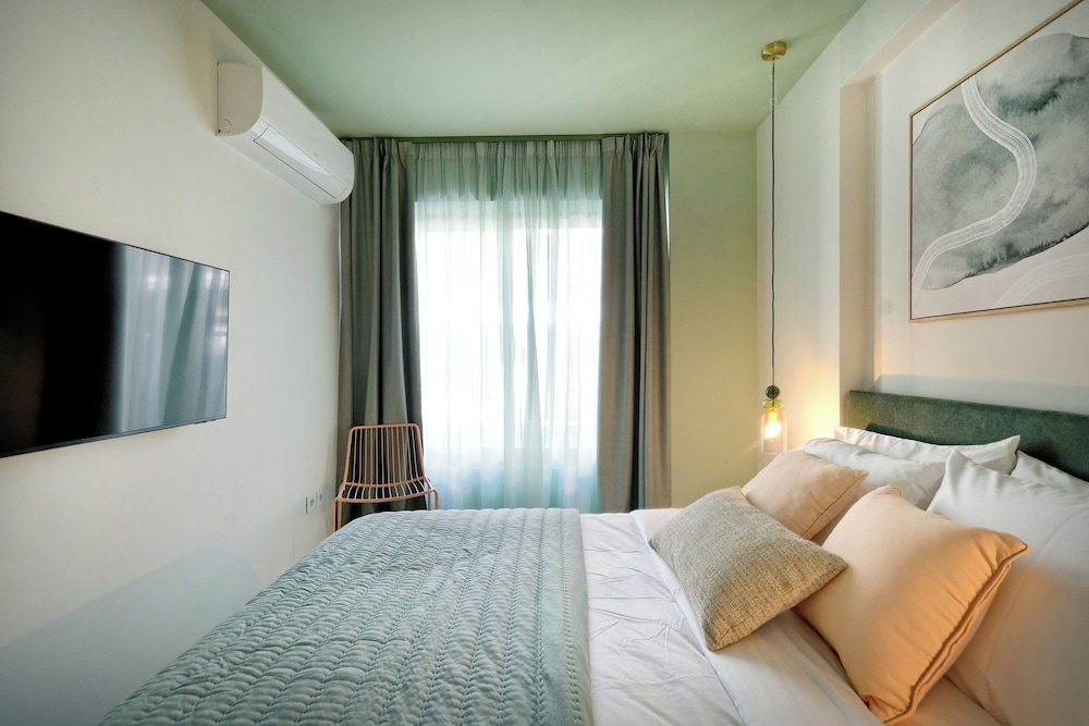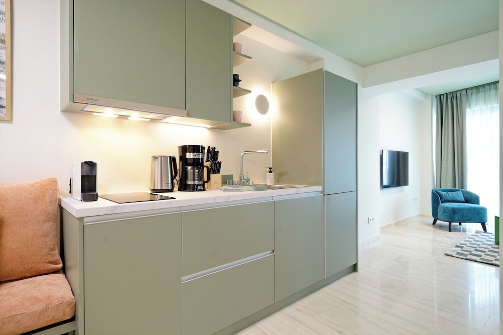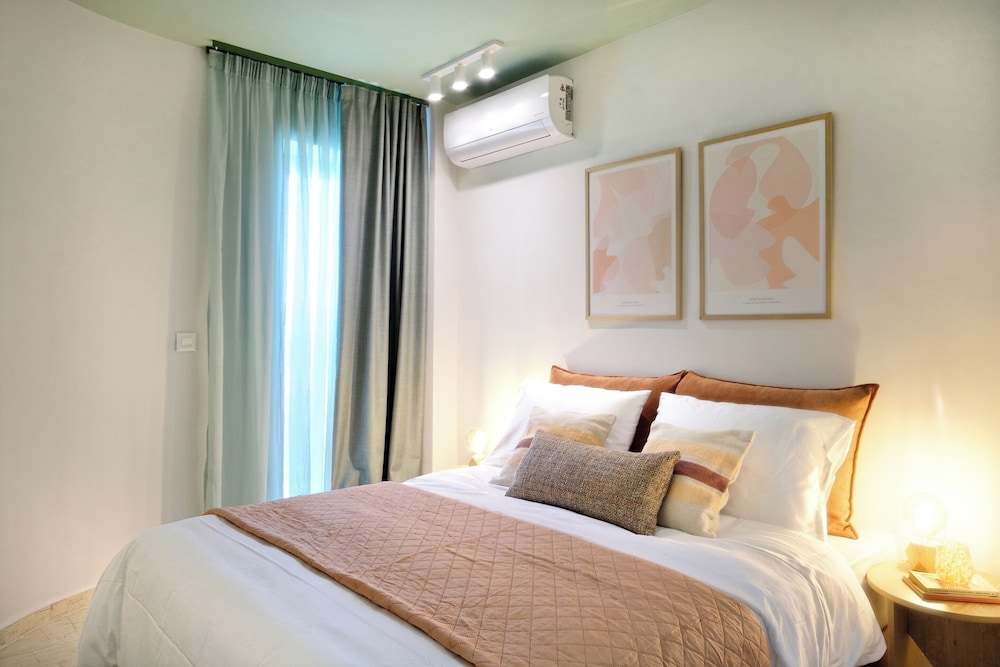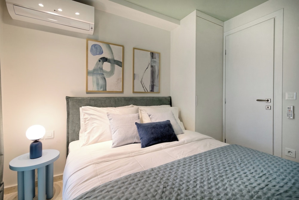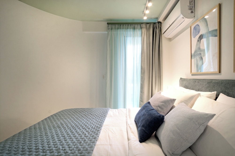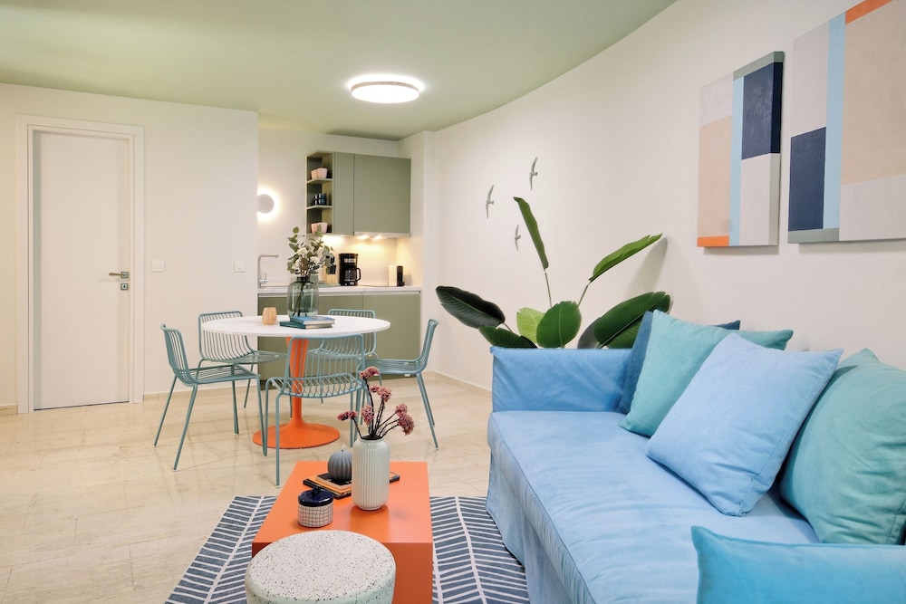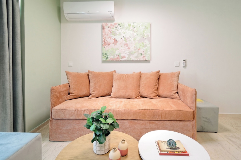 The property room itself was very spacious, clean, safe, and had excellent amenities: compact but full kitchen; two bathrooms (in our particular suite); separate bedroom with TV and AC; good sized living area with TV and with dining area and AC, as well as having a large recessed day bed (that has privacy curtains and quite comfortable); and there are free laundry facilities on site. But, by far, the best part of our stay was the amazing property manager Foteini! She greeted us when we arrived and went over everything comprehensively and answered all of our questions. She was so nice and very kind as well as having a great sense of humour and was genuinely interested in talking to us. We had one minor problem with the new AC and she was in the suite to see to it in less than five minutes, having the issue completely resolved within half an hour. Could not have been more happy with this property. We highly recommend it!