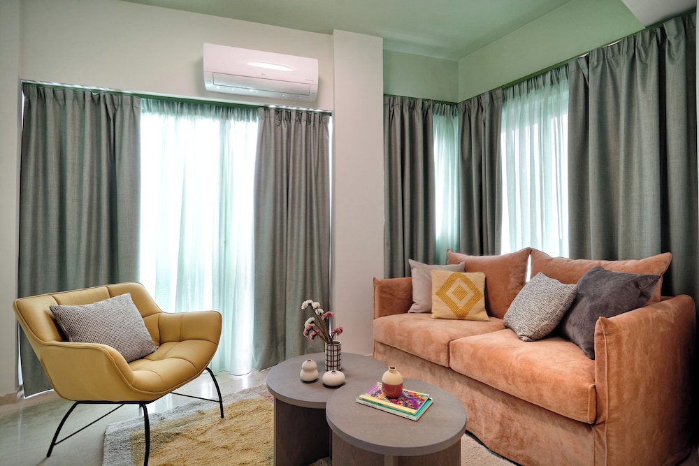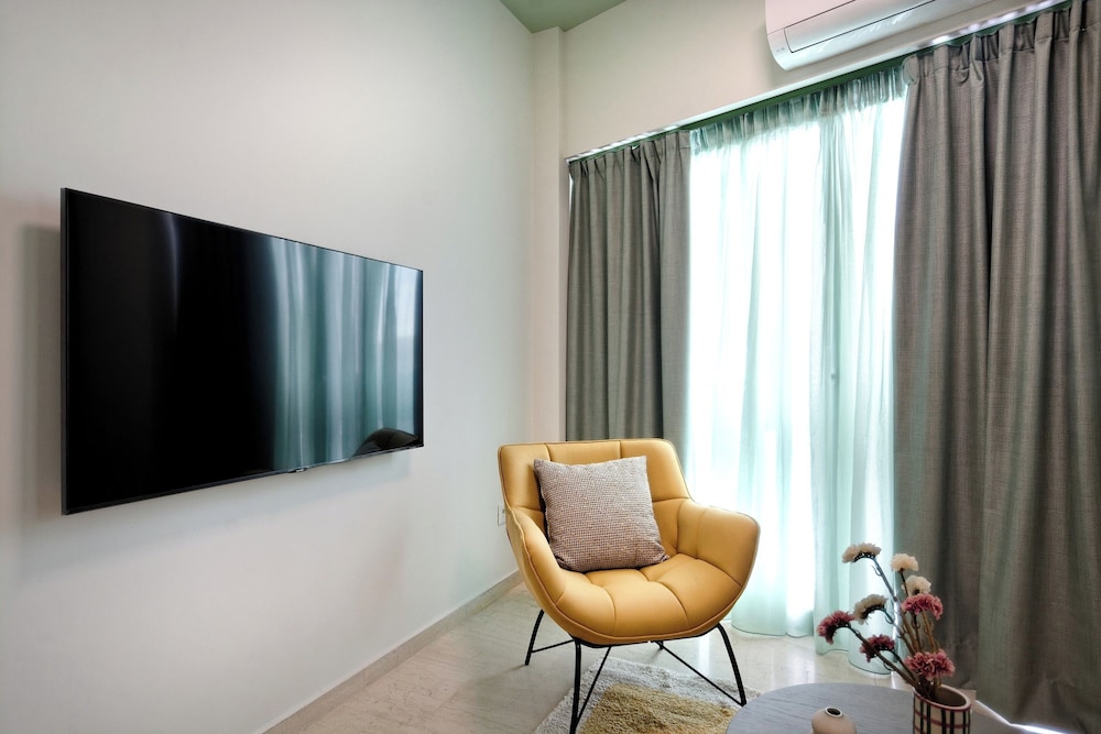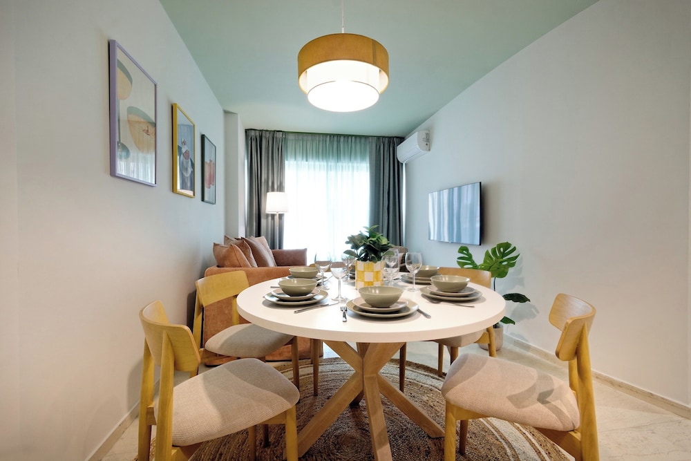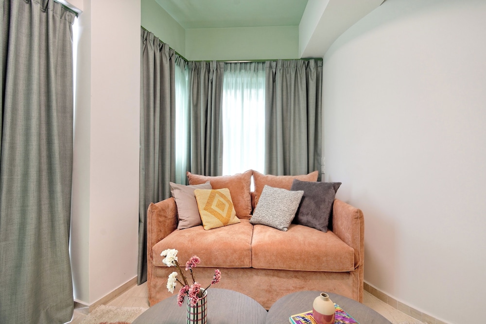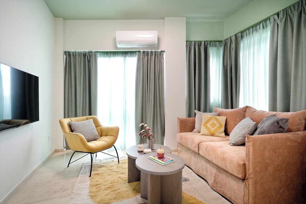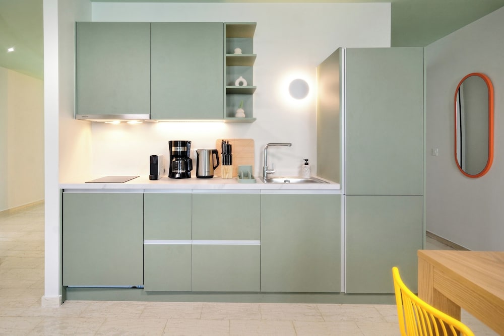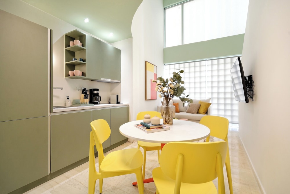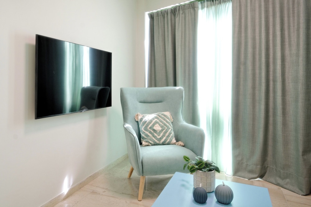 The property room itself was very spacious, clean, safe, and had excellent amenities: compact but full kitchen; two bathrooms (in our particular suite); separate bedroom with TV and AC; good sized living area with TV and with dining area and AC, as well as having a large recessed day bed (that has privacy curtains and quite comfortable); and there are free laundry facilities on site. But, by far, the best part of our stay was the amazing property manager Foteini! She greeted us when we arrived and went over everything comprehensively and answered all of our questions. She was so nice and very kind as well as having a great sense of humour and was genuinely interested in talking to us. We had one minor problem with the new AC and she was in the suite to see to it in less than five minutes, having the issue completely resolved within half an hour. Could not have been more happy with this property. We highly recommend it!